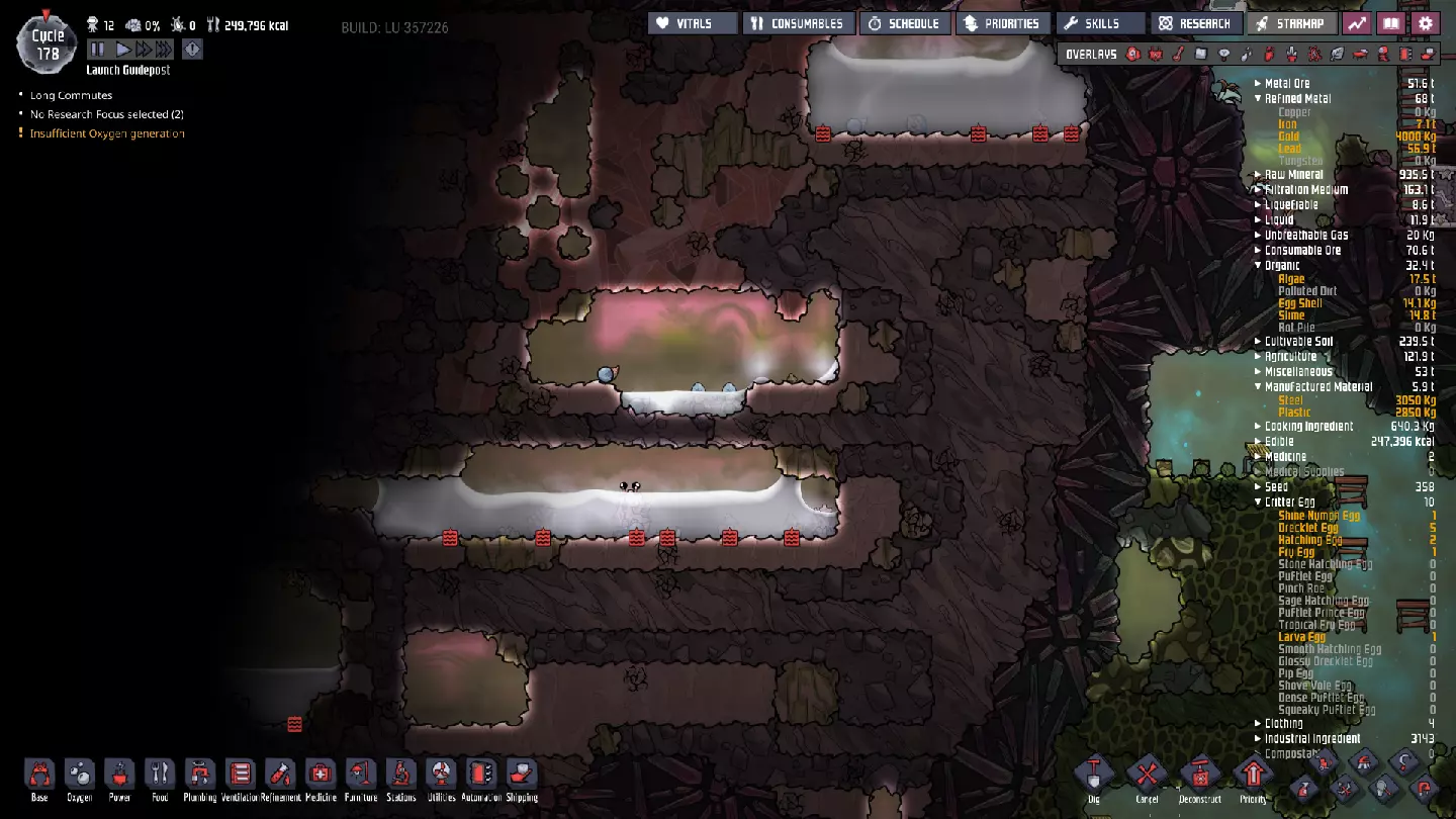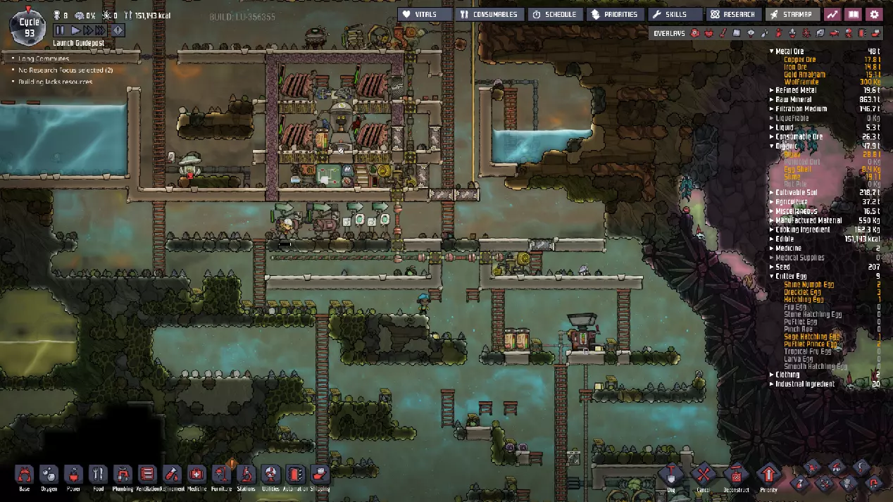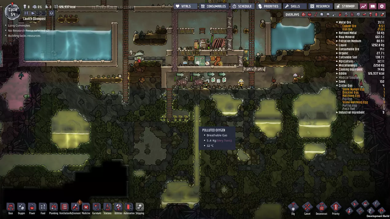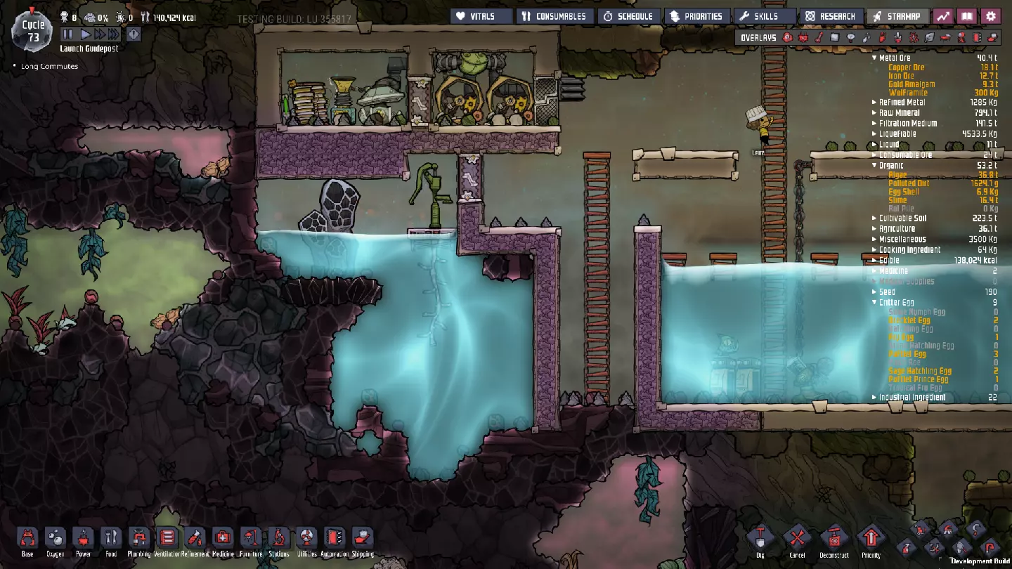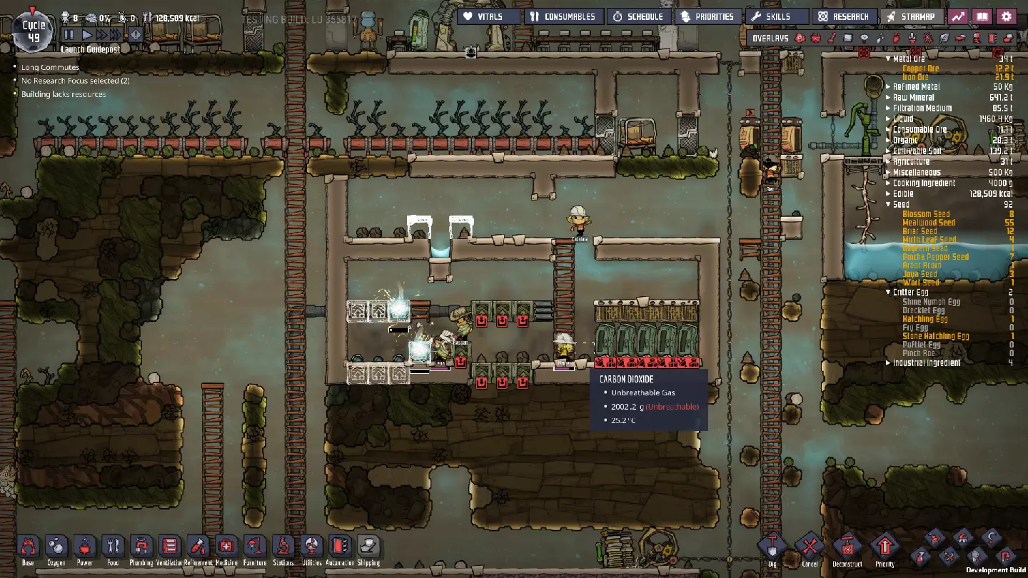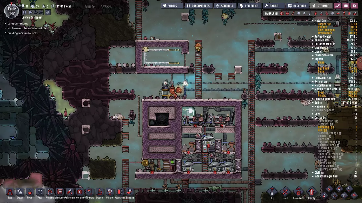 这与我的早期游戏指南结尾处的殖民地完全相同,这意味着已达成以下目标: - 已建立基础的食用树农场,并且我们的产量足以从 lice 面包转向腌菜。 - 复制人已开始获得专业技能,并且拥有足够的士气来学习技能而不会产生压力。 - 管道系统和基础水循环系统已就位。 - 已建立基于煤炭的发电系统。 - 已建立初始的碳洗涤器系统。 通过达成这些目标,殖民地已变得相对稳定,并满足了复制人的所有基本需求。因此,我们现在可以将时间花在更大的项目和探索上。基本上,我们已从“生存”阶段主要转向“扩张”阶段。尽管如此,我们仍然面临一些持续存在的问题: - 虽然我们的水资源供应充足,但它也是相当有限的。过多的研究将大幅消耗我们的储备,所以要小心! - 我们仍在通过藻类生产氧气。我们的初始区域藻类数量有限,因此我们要么需要持续开采更多藻类,要么需要找到某种方法过渡到基于水的氧气生产。 简而言之,我们目前最大的担忧是水资源,不过随着游戏进程,热量也将开始成为一个需要关注的问题。 其他注意事项: 如果你还没有这样做,或许可以在“优先级”选项卡上勾选“启用接近度”框。这是为了帮助大型基地更高效地进行任务选择,而且由于我们很快就要开始探索,复制人(Dupe)的移动时间也会增加,所以现在正是进行这项优化的好时机。