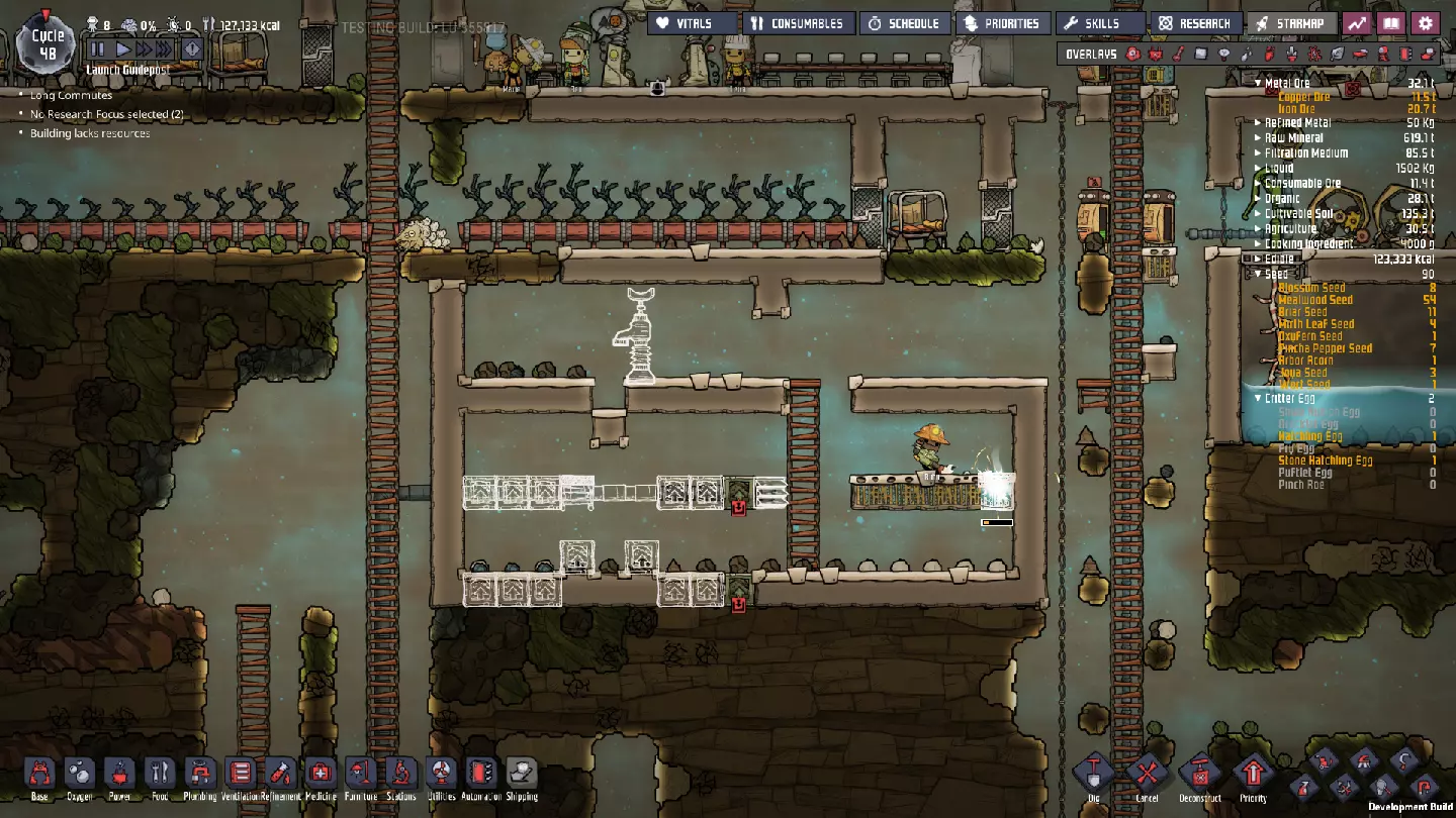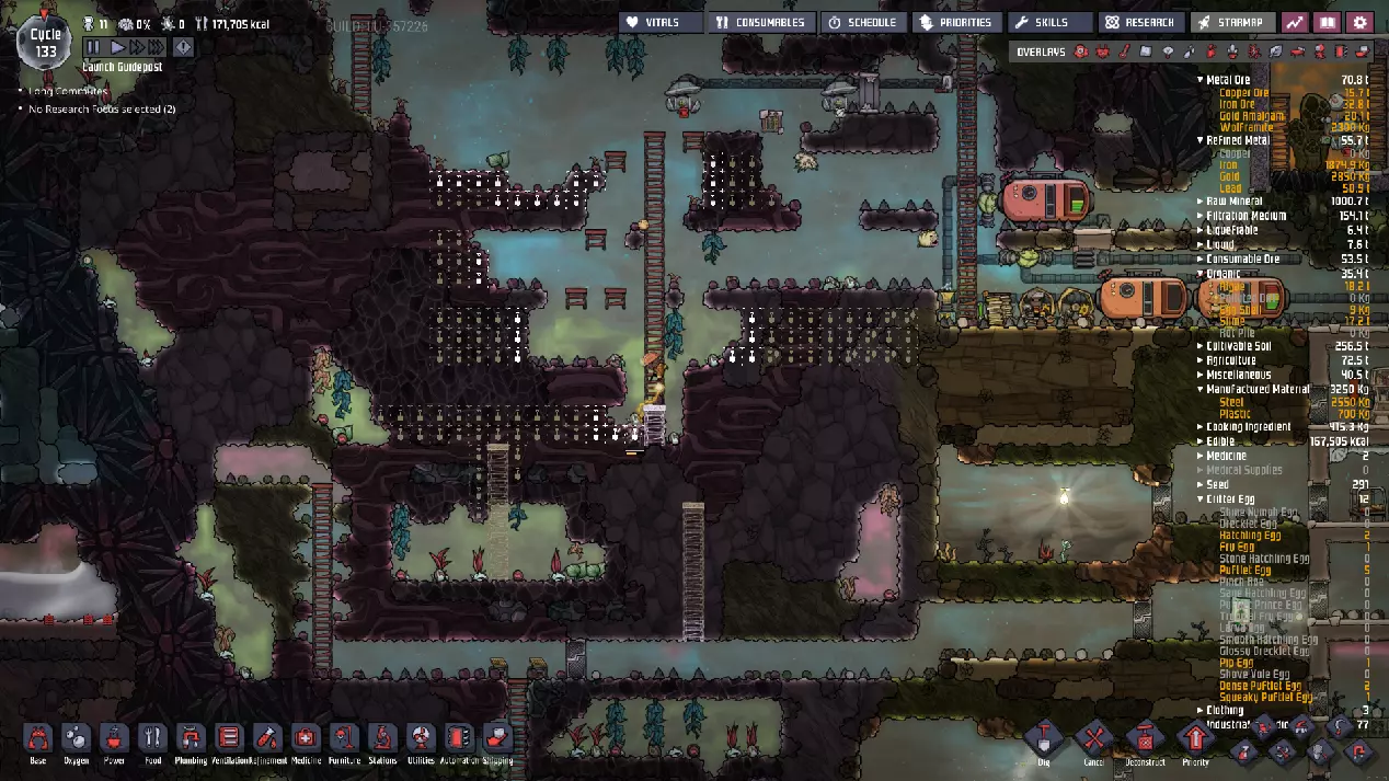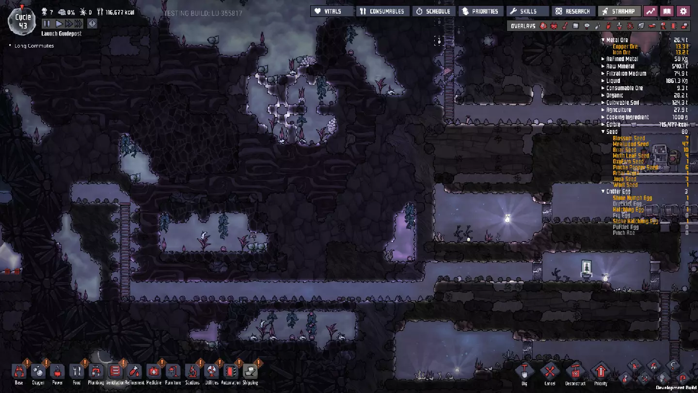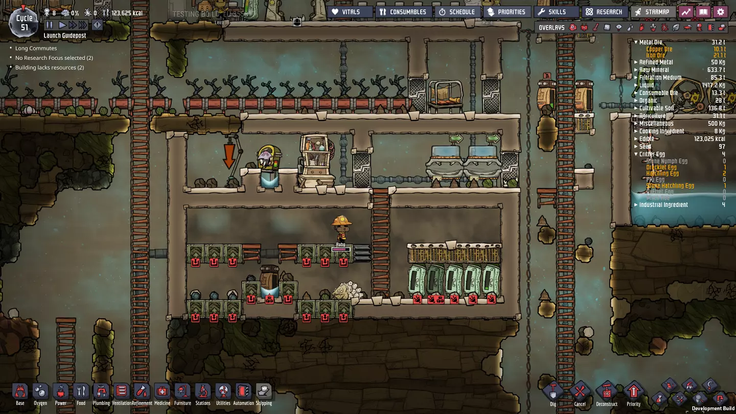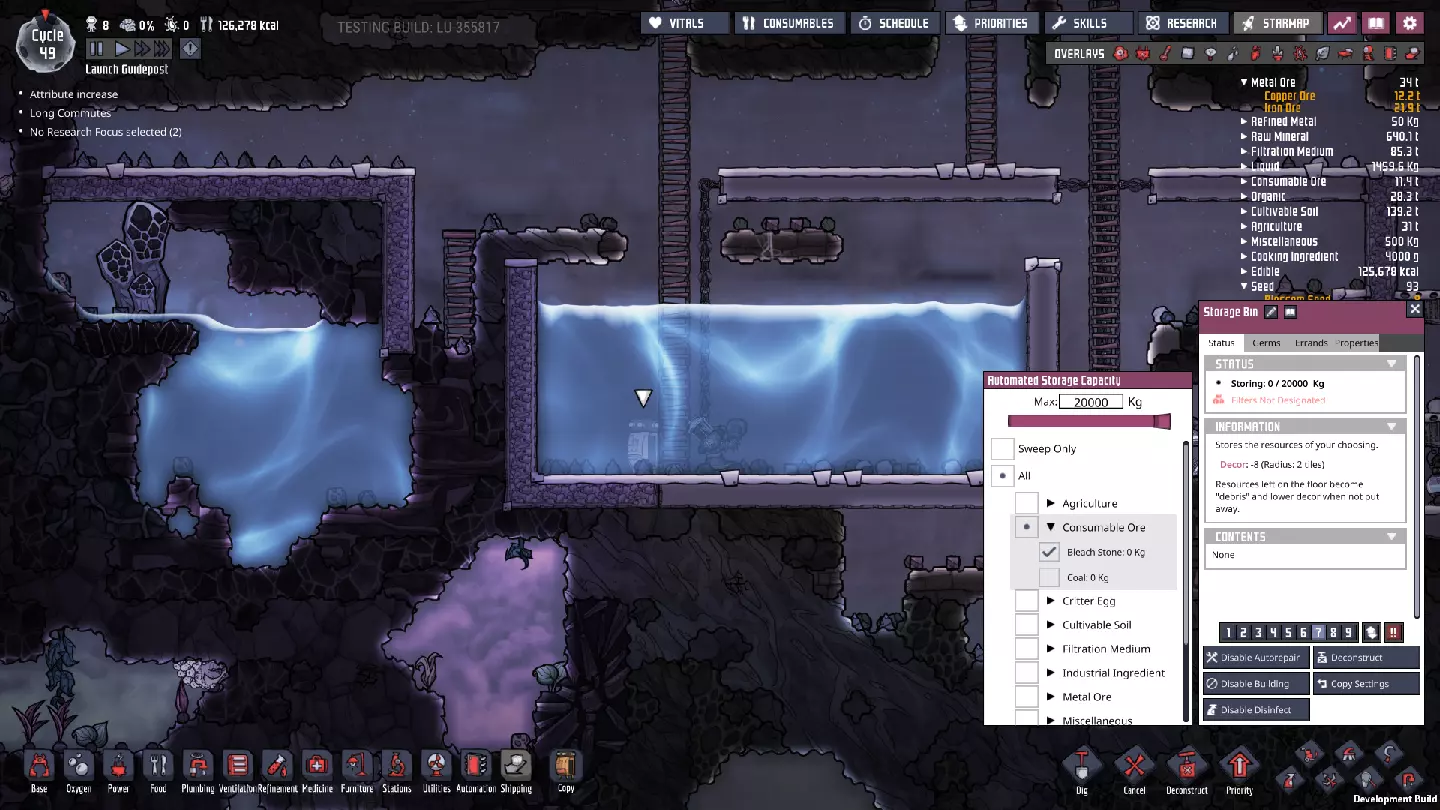 这与我的早期游戏指南结尾处的殖民地完全相同,这意味着已达成以下目标: - 已建立基础的食用树农场,并且我们的产量足以从 lice 面包转向腌菜。 - 复制人已开始获得专业技能,并且拥有足够的士气来学习技能而不会产生压力。 - 管道系统和基础水循环系统已就位。 - 已建立基于煤炭的发电系统。 - 已建立初始的碳洗涤器系统。 通过达成这些目标,殖民地已变得相对稳定,并满足了复制人的所有基本需求。因此,我们现在可以将时间花在更大的项目和探索上。基本上,我们已从“生存”阶段主要转向“扩张”阶段。尽管如此,我们仍然面临一些持续存在的问题: - 虽然我们的水资源供应充足,但它也是相当有限的。过多的研究将大幅消耗我们的储备,所以要小心! - 我们仍在通过藻类生产氧气。我们的初始区域藻类数量有限,因此我们要么需要持续开采更多藻类,要么需要找到某种方法过渡到基于水的氧气生产。 简而言之,我们目前最大的担忧是水资源,不过随着游戏进程,热量也将开始成为一个需要关注的问题。 其他注意事项: 如果你还没有这样做,或许可以在“优先级”选项卡上勾选“启用接近度”框。这是为了帮助大型基地更高效地进行任务选择,而且由于我们很快就要开始探索,复制人(Dupe)的移动时间也会增加,所以现在正是进行这项优化的好时机。