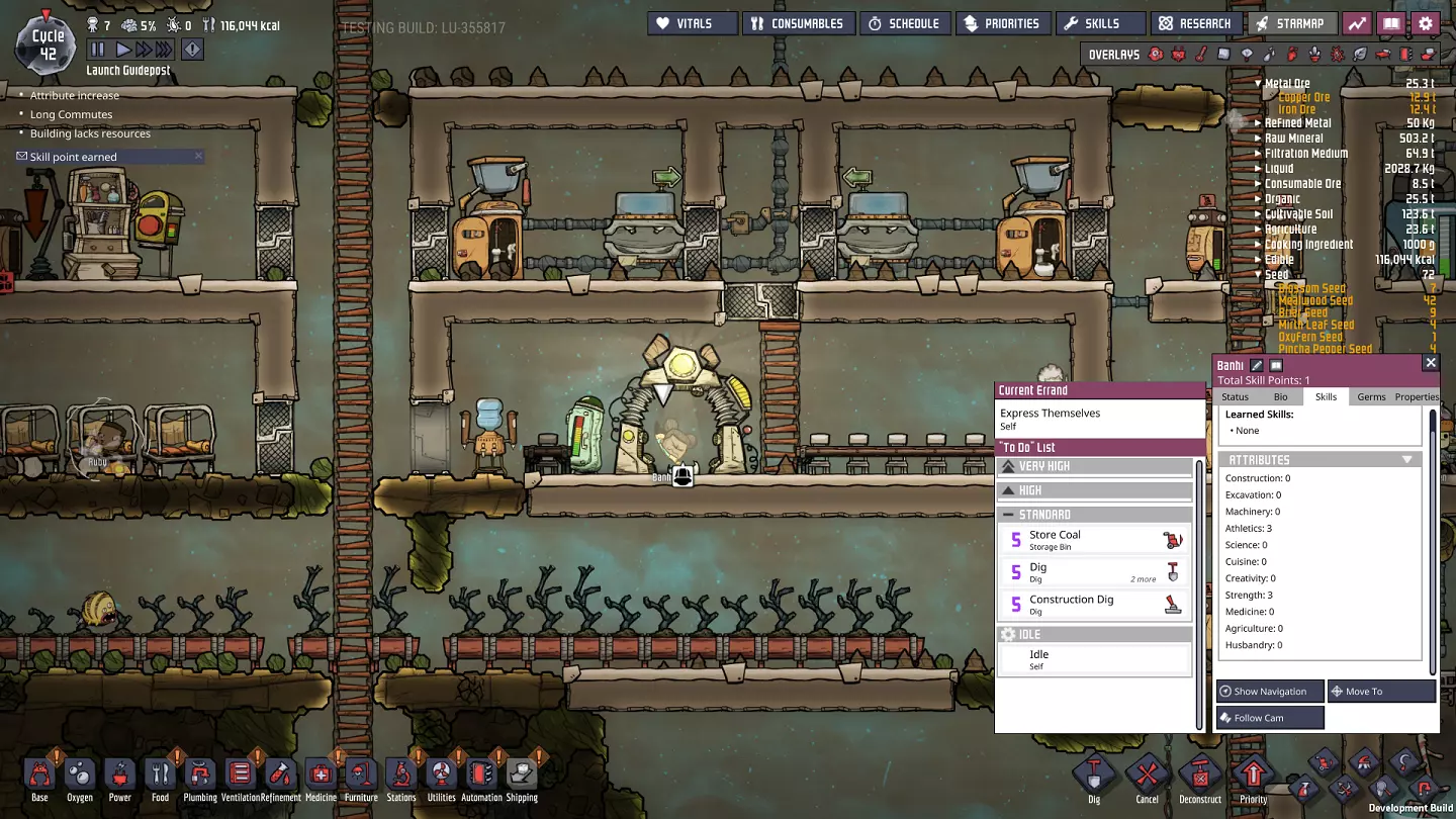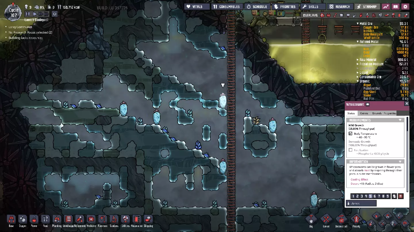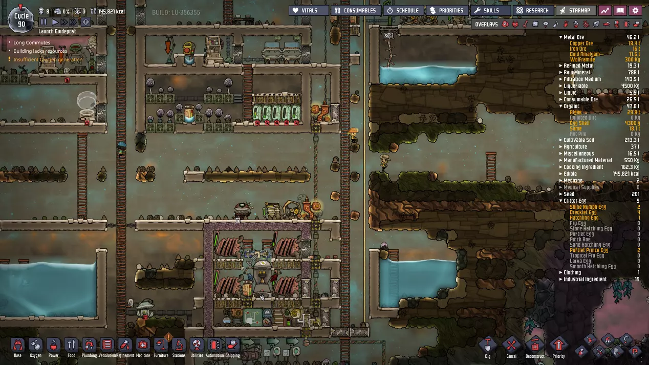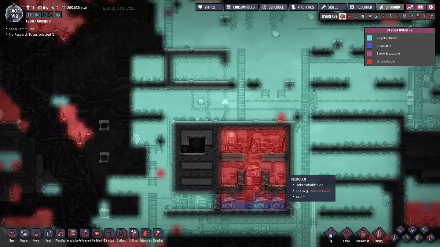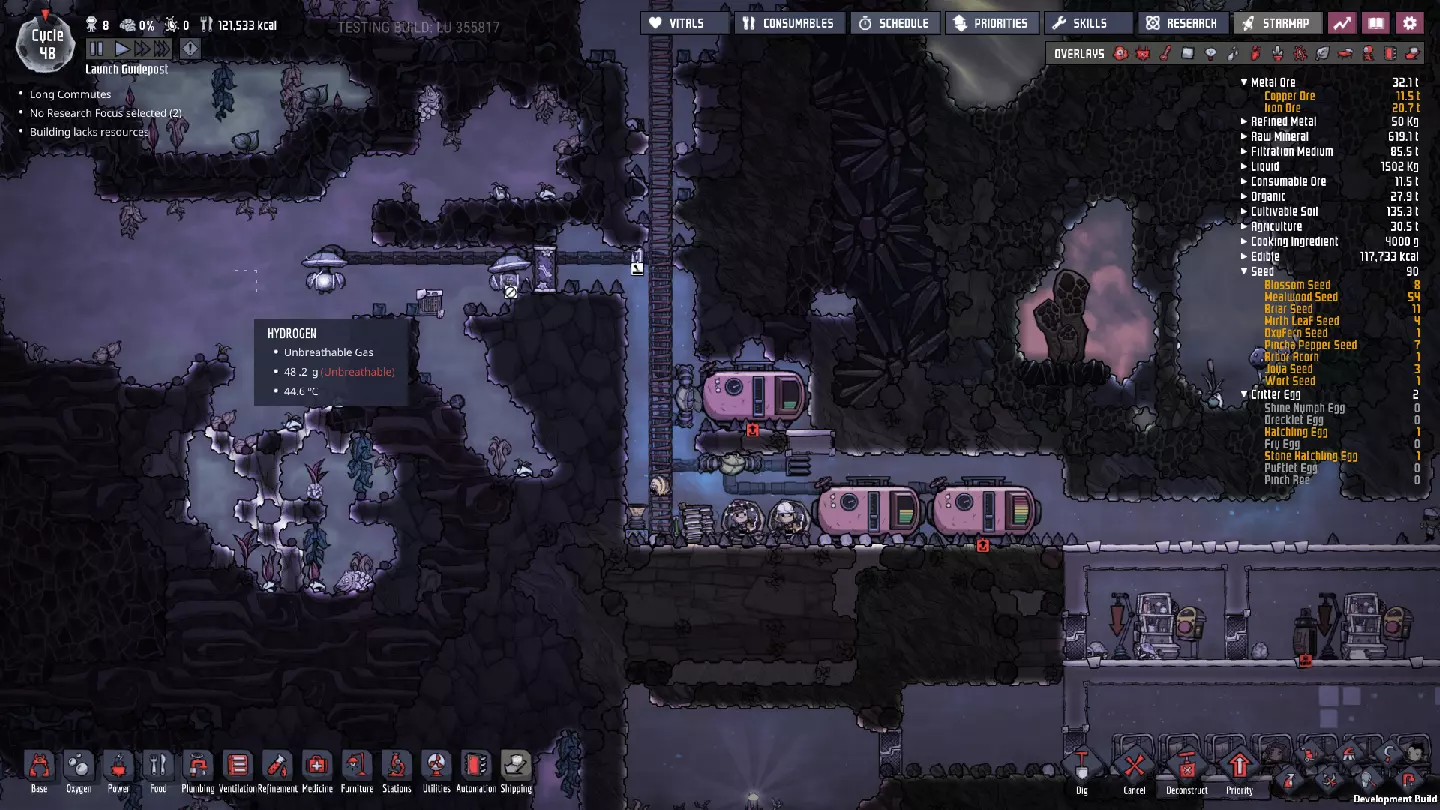 这与我的早期游戏指南结尾处的殖民地完全相同,这意味着已达成以下目标: - 已建立基础的食用树农场,并且我们的产量足以从 lice 面包转向腌菜。 - 复制人已开始获得专业技能,并且拥有足够的士气来学习技能而不会产生压力。 - 管道系统和基础水循环系统已就位。 - 已建立基于煤炭的发电系统。 - 已建立初始的碳洗涤器系统。 通过达成这些目标,殖民地已变得相对稳定,并满足了复制人的所有基本需求。因此,我们现在可以将时间花在更大的项目和探索上。基本上,我们已从“生存”阶段主要转向“扩张”阶段。尽管如此,我们仍然面临一些持续存在的问题: - 虽然我们的水资源供应充足,但它也是相当有限的。过多的研究将大幅消耗我们的储备,所以要小心! - 我们仍在通过藻类生产氧气。我们的初始区域藻类数量有限,因此我们要么需要持续开采更多藻类,要么需要找到某种方法过渡到基于水的氧气生产。 简而言之,我们目前最大的担忧是水资源,不过随着游戏进程,热量也将开始成为一个需要关注的问题。 其他注意事项: 如果你还没有这样做,或许可以在“优先级”选项卡上勾选“启用接近度”框。这是为了帮助大型基地更高效地进行任务选择,而且由于我们很快就要开始探索,复制人(Dupe)的移动时间也会增加,所以现在正是进行这项优化的好时机。