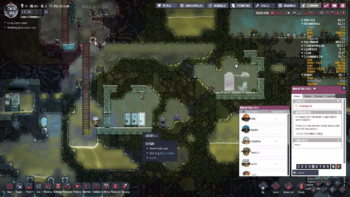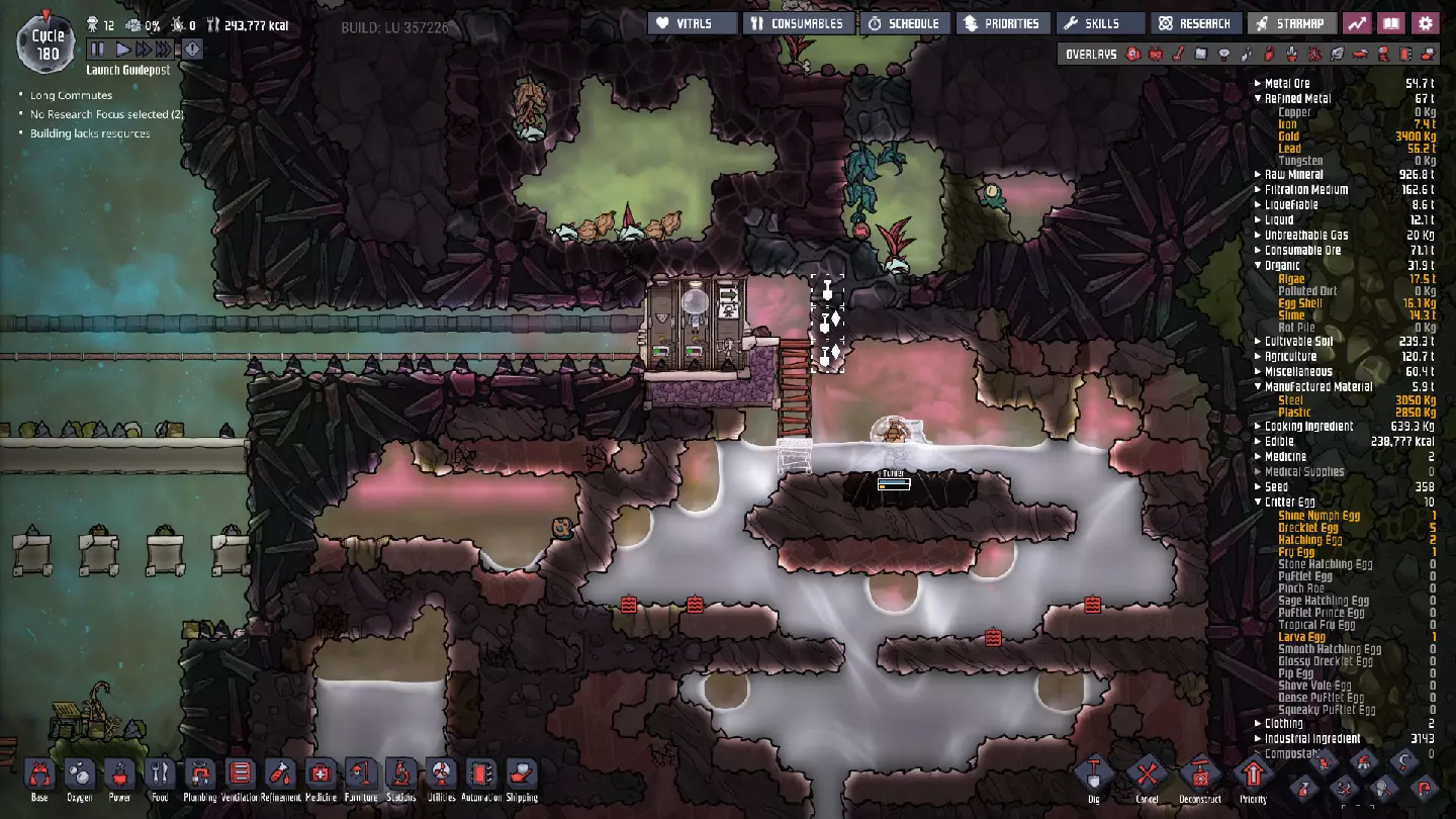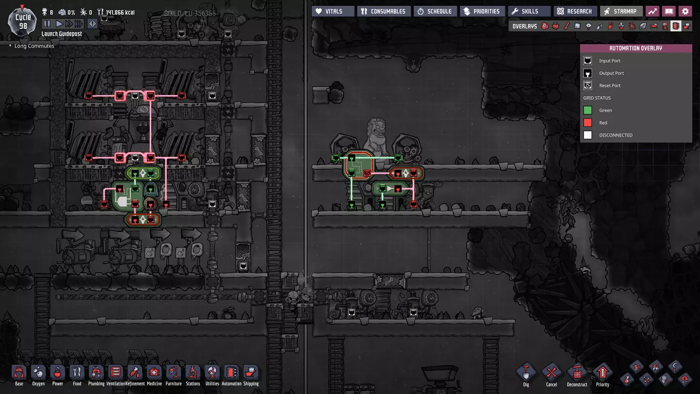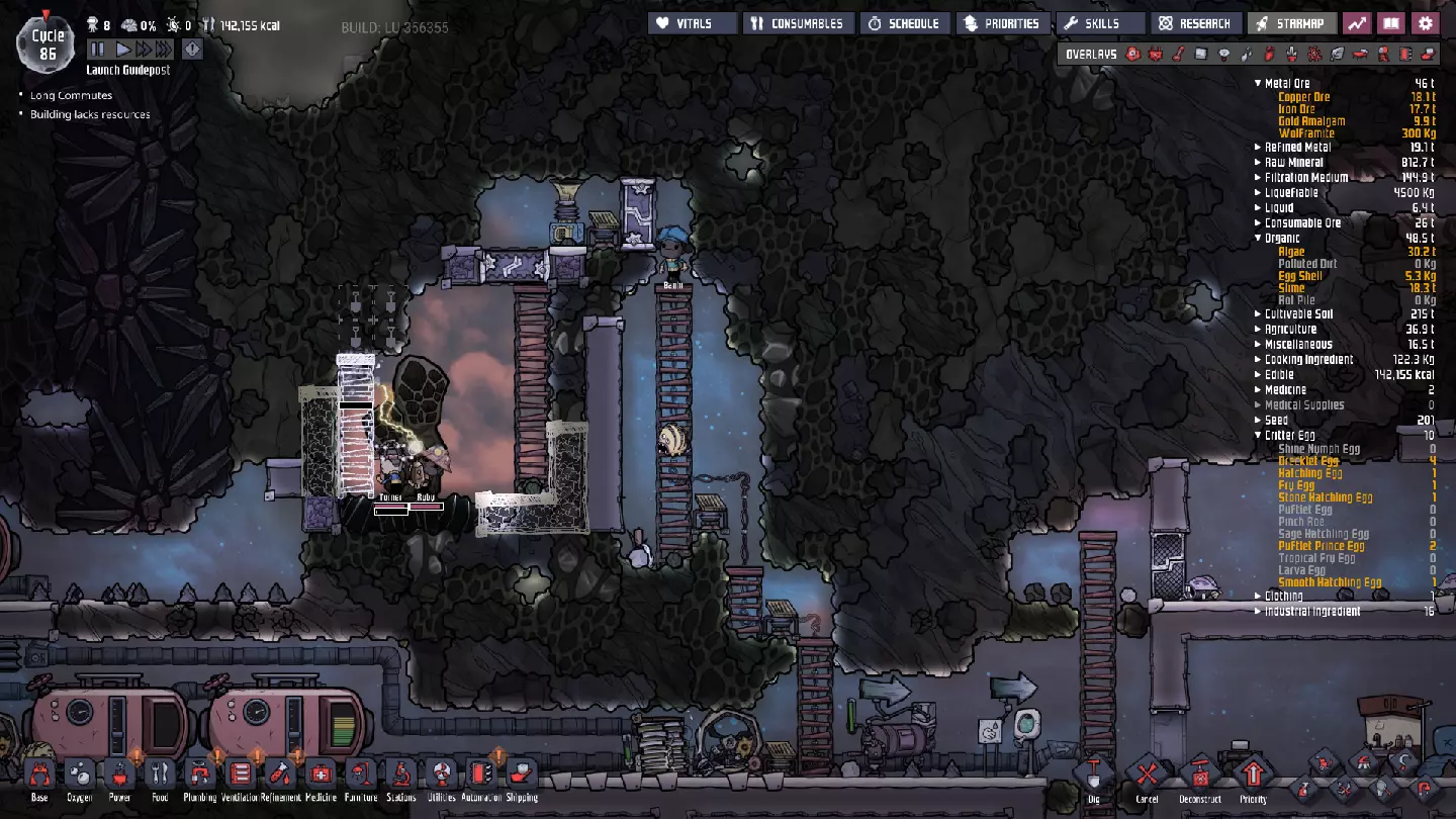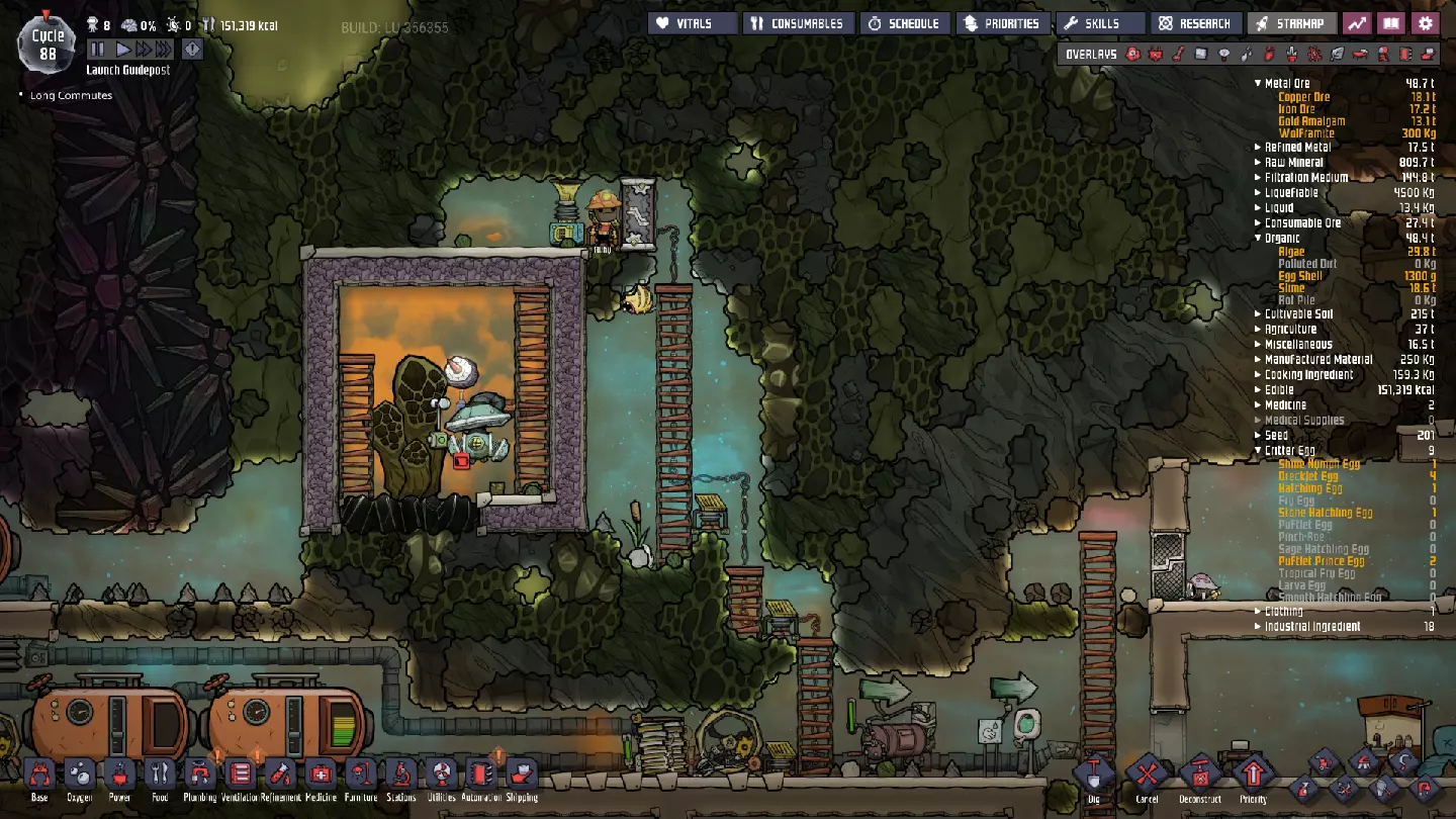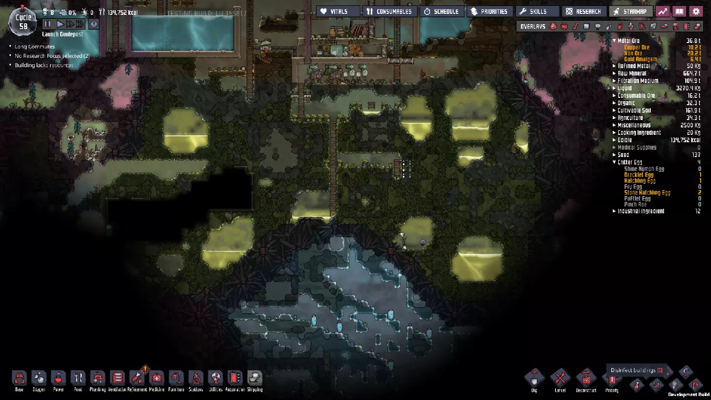 这与我的早期游戏指南结尾处的殖民地完全相同,这意味着已达成以下目标: - 已建立基础的食用树农场,并且我们的产量足以从 lice 面包转向腌菜。 - 复制人已开始获得专业技能,并且拥有足够的士气来学习技能而不会产生压力。 - 管道系统和基础水循环系统已就位。 - 已建立基于煤炭的发电系统。 - 已建立初始的碳洗涤器系统。 通过达成这些目标,殖民地已变得相对稳定,并满足了复制人的所有基本需求。因此,我们现在可以将时间花在更大的项目和探索上。基本上,我们已从“生存”阶段主要转向“扩张”阶段。尽管如此,我们仍然面临一些持续存在的问题: - 虽然我们的水资源供应充足,但它也是相当有限的。过多的研究将大幅消耗我们的储备,所以要小心! - 我们仍在通过藻类生产氧气。我们的初始区域藻类数量有限,因此我们要么需要持续开采更多藻类,要么需要找到某种方法过渡到基于水的氧气生产。 简而言之,我们目前最大的担忧是水资源,不过随着游戏进程,热量也将开始成为一个需要关注的问题。 其他注意事项: 如果你还没有这样做,或许可以在“优先级”选项卡上勾选“启用接近度”框。这是为了帮助大型基地更高效地进行任务选择,而且由于我们很快就要开始探索,复制人(Dupe)的移动时间也会增加,所以现在正是进行这项优化的好时机。
