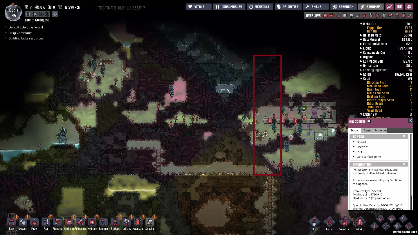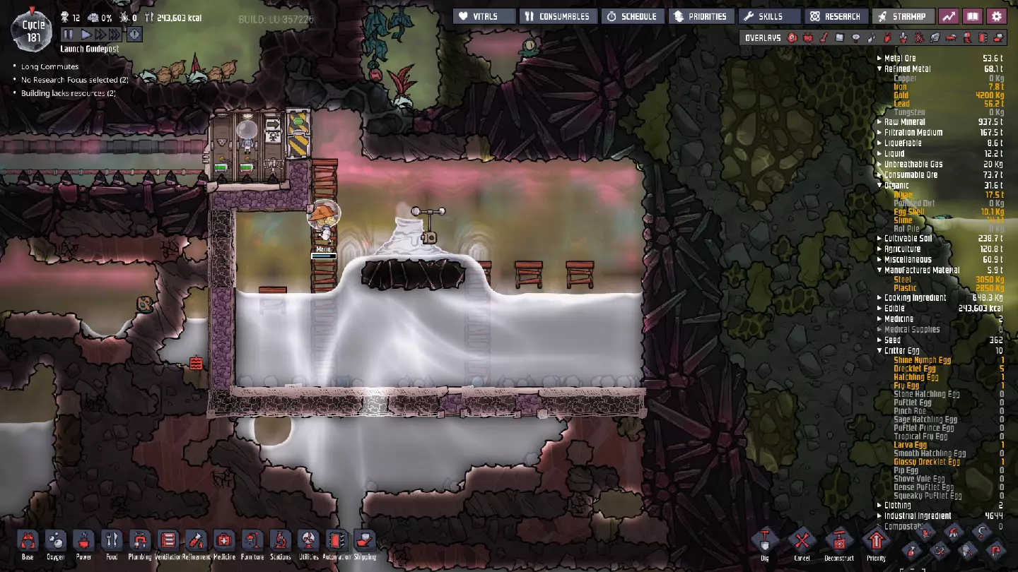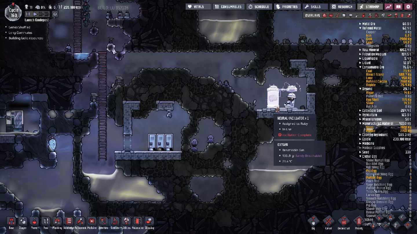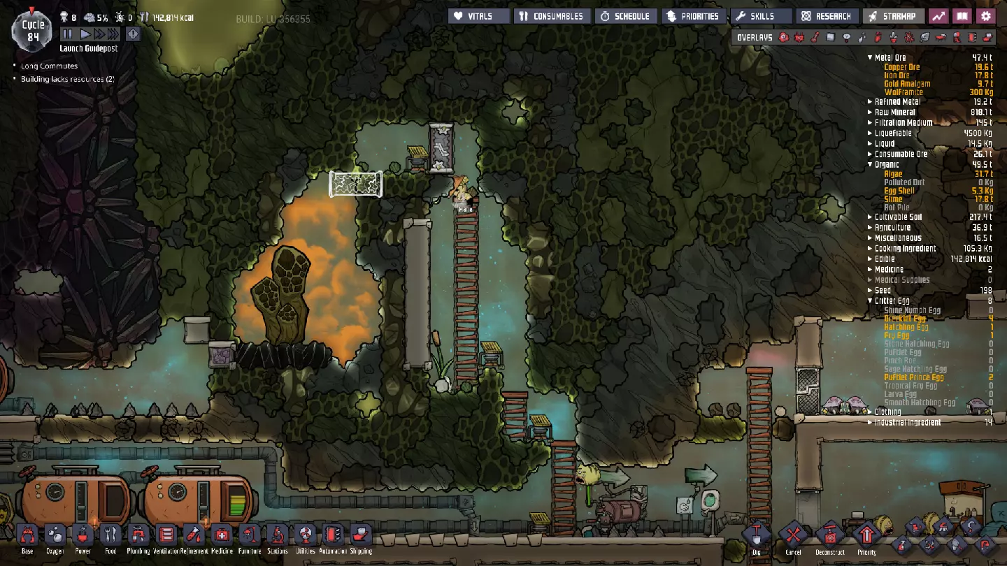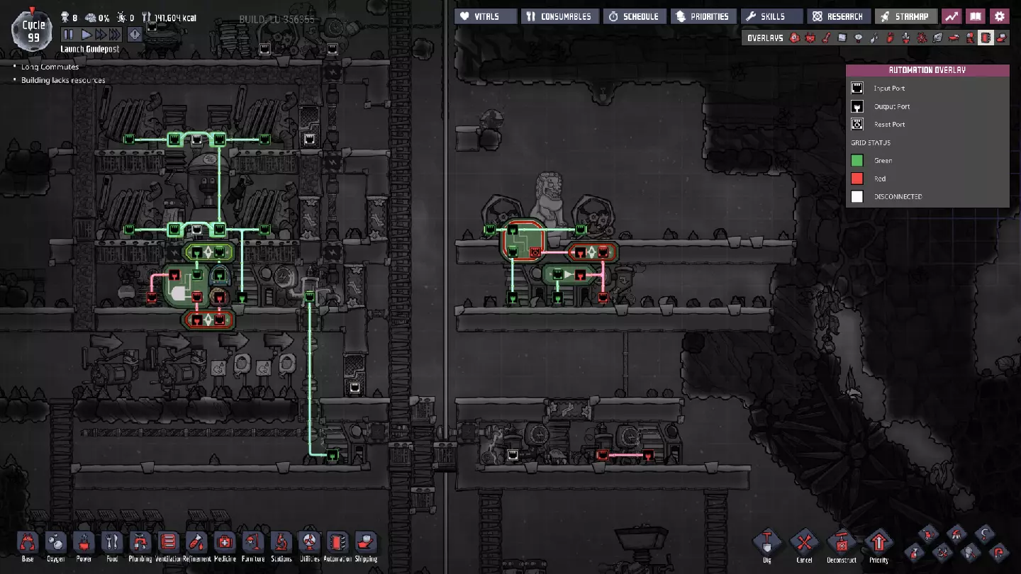 这与我的早期游戏指南结尾处的殖民地完全相同,这意味着已达成以下目标: - 已建立基础的食用树农场,并且我们的产量足以从 lice 面包转向腌菜。 - 复制人已开始获得专业技能,并且拥有足够的士气来学习技能而不会产生压力。 - 管道系统和基础水循环系统已就位。 - 已建立基于煤炭的发电系统。 - 已建立初始的碳洗涤器系统。 通过达成这些目标,殖民地已变得相对稳定,并满足了复制人的所有基本需求。因此,我们现在可以将时间花在更大的项目和探索上。基本上,我们已从“生存”阶段主要转向“扩张”阶段。尽管如此,我们仍然面临一些持续存在的问题: - 虽然我们的水资源供应充足,但它也是相当有限的。过多的研究将大幅消耗我们的储备,所以要小心! - 我们仍在通过藻类生产氧气。我们的初始区域藻类数量有限,因此我们要么需要持续开采更多藻类,要么需要找到某种方法过渡到基于水的氧气生产。 简而言之,我们目前最大的担忧是水资源,不过随着游戏进程,热量也将开始成为一个需要关注的问题。 其他注意事项: 如果你还没有这样做,或许可以在“优先级”选项卡上勾选“启用接近度”框。这是为了帮助大型基地更高效地进行任务选择,而且由于我们很快就要开始探索,复制人(Dupe)的移动时间也会增加,所以现在正是进行这项优化的好时机。