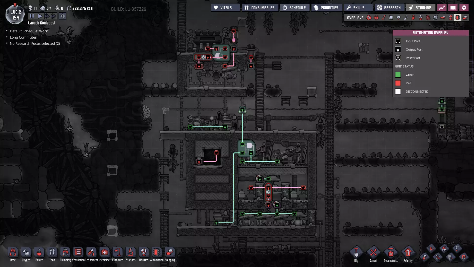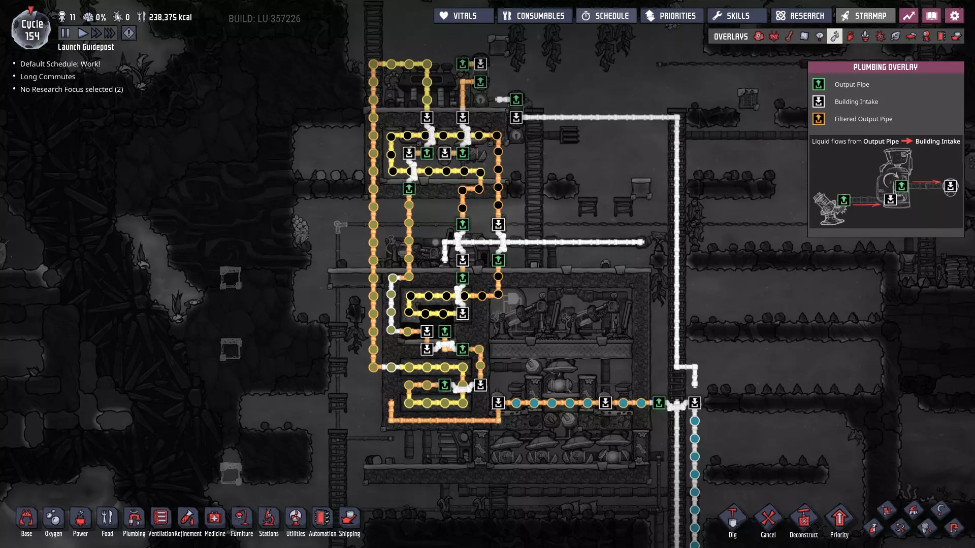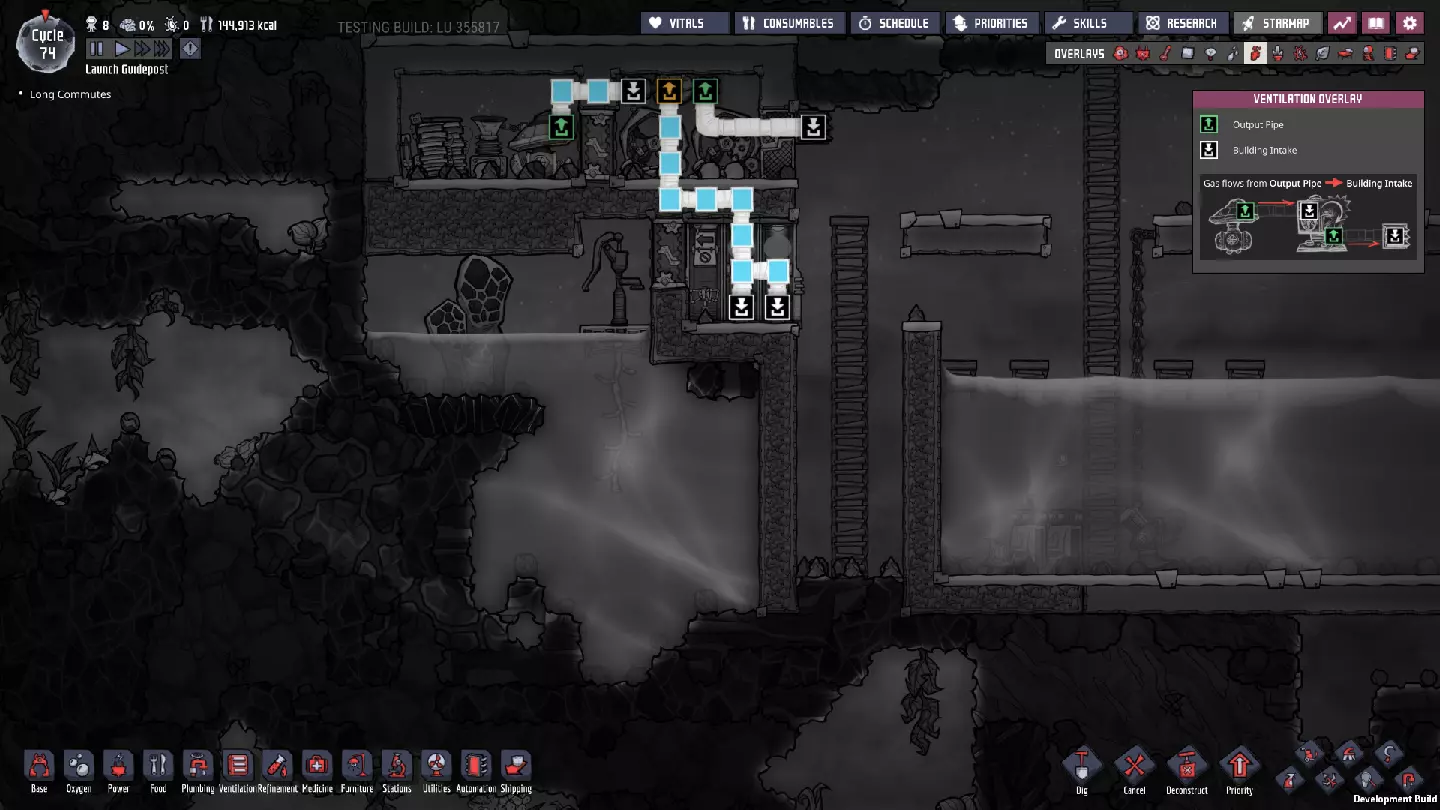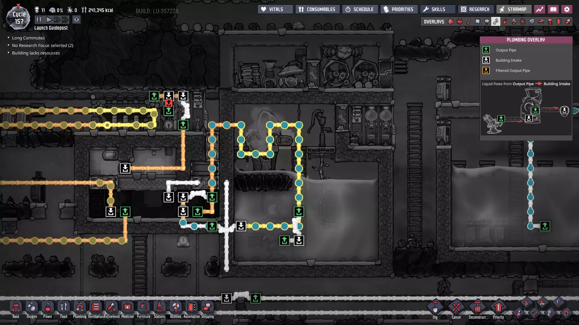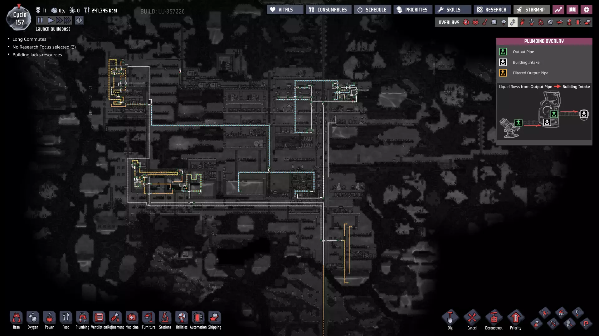 这与我的早期游戏指南结尾处的殖民地完全相同,这意味着已达成以下目标: - 已建立基础的食用树农场,并且我们的产量足以从 lice 面包转向腌菜。 - 复制人已开始获得专业技能,并且拥有足够的士气来学习技能而不会产生压力。 - 管道系统和基础水循环系统已就位。 - 已建立基于煤炭的发电系统。 - 已建立初始的碳洗涤器系统。 通过达成这些目标,殖民地已变得相对稳定,并满足了复制人的所有基本需求。因此,我们现在可以将时间花在更大的项目和探索上。基本上,我们已从“生存”阶段主要转向“扩张”阶段。尽管如此,我们仍然面临一些持续存在的问题: - 虽然我们的水资源供应充足,但它也是相当有限的。过多的研究将大幅消耗我们的储备,所以要小心! - 我们仍在通过藻类生产氧气。我们的初始区域藻类数量有限,因此我们要么需要持续开采更多藻类,要么需要找到某种方法过渡到基于水的氧气生产。 简而言之,我们目前最大的担忧是水资源,不过随着游戏进程,热量也将开始成为一个需要关注的问题。 其他注意事项: 如果你还没有这样做,或许可以在“优先级”选项卡上勾选“启用接近度”框。这是为了帮助大型基地更高效地进行任务选择,而且由于我们很快就要开始探索,复制人(Dupe)的移动时间也会增加,所以现在正是进行这项优化的好时机。