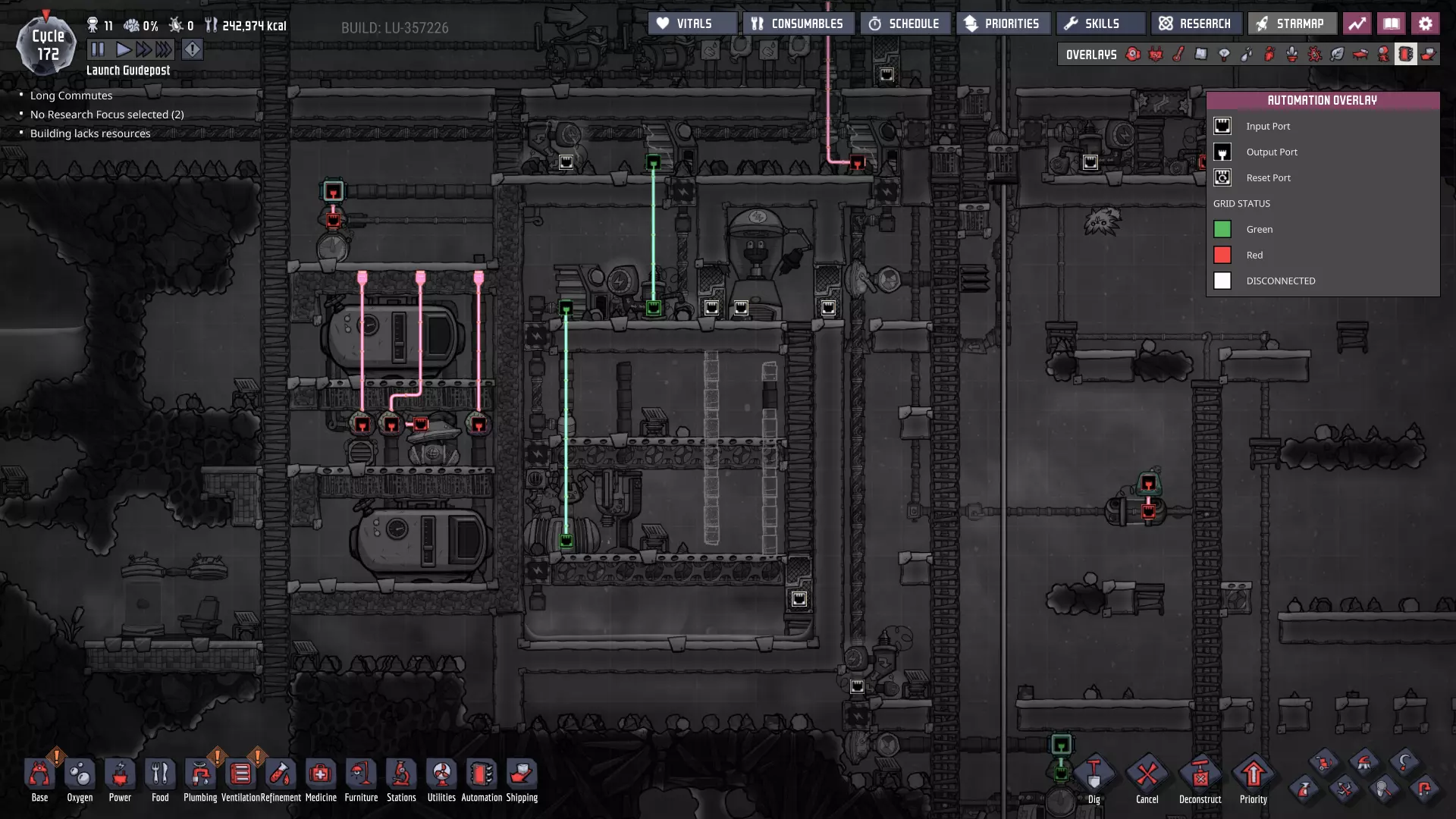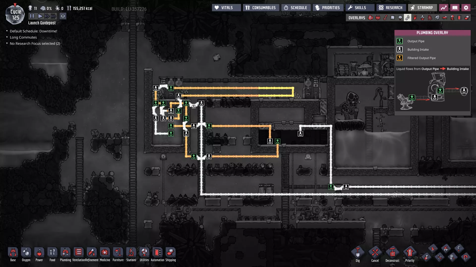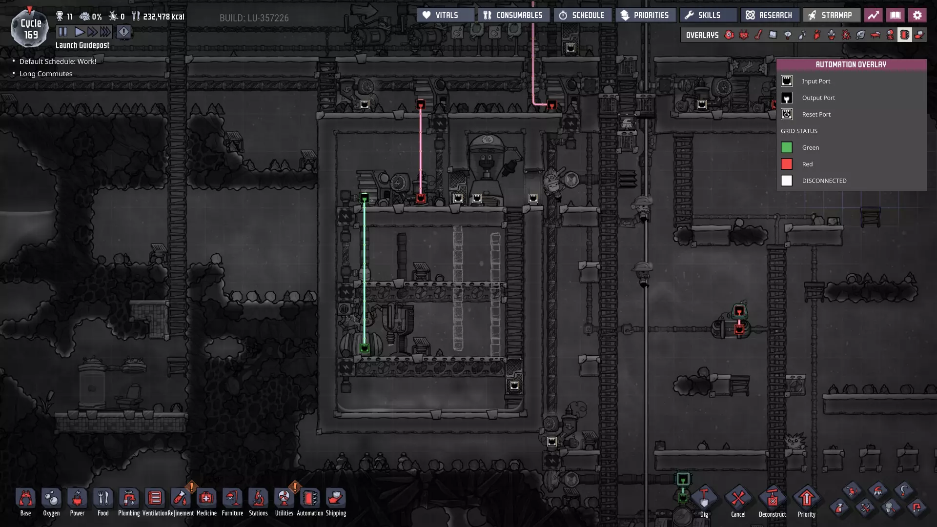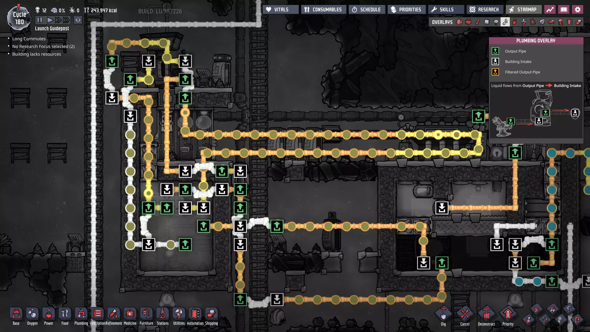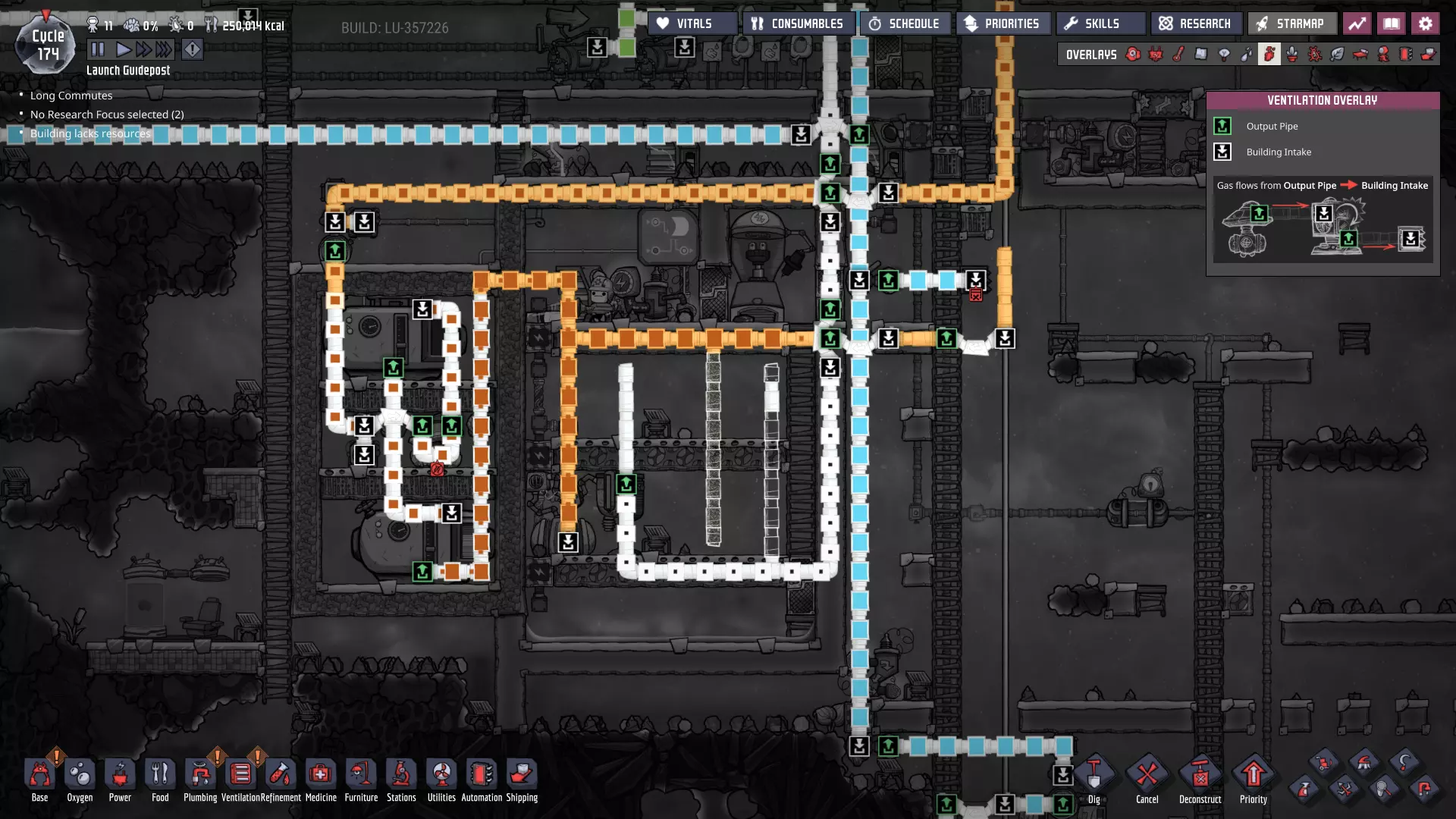 这与我的早期游戏指南结尾处的殖民地完全相同,这意味着已达成以下目标: - 已建立基础的食用树农场,并且我们的产量足以从 lice 面包转向腌菜。 - 复制人已开始获得专业技能,并且拥有足够的士气来学习技能而不会产生压力。 - 管道系统和基础水循环系统已就位。 - 已建立基于煤炭的发电系统。 - 已建立初始的碳洗涤器系统。 通过达成这些目标,殖民地已变得相对稳定,并满足了复制人的所有基本需求。因此,我们现在可以将时间花在更大的项目和探索上。基本上,我们已从“生存”阶段主要转向“扩张”阶段。尽管如此,我们仍然面临一些持续存在的问题: - 虽然我们的水资源供应充足,但它也是相当有限的。过多的研究将大幅消耗我们的储备,所以要小心! - 我们仍在通过藻类生产氧气。我们的初始区域藻类数量有限,因此我们要么需要持续开采更多藻类,要么需要找到某种方法过渡到基于水的氧气生产。 简而言之,我们目前最大的担忧是水资源,不过随着游戏进程,热量也将开始成为一个需要关注的问题。 其他注意事项: 如果你还没有这样做,或许可以在“优先级”选项卡上勾选“启用接近度”框。这是为了帮助大型基地更高效地进行任务选择,而且由于我们很快就要开始探索,复制人(Dupe)的移动时间也会增加,所以现在正是进行这项优化的好时机。
