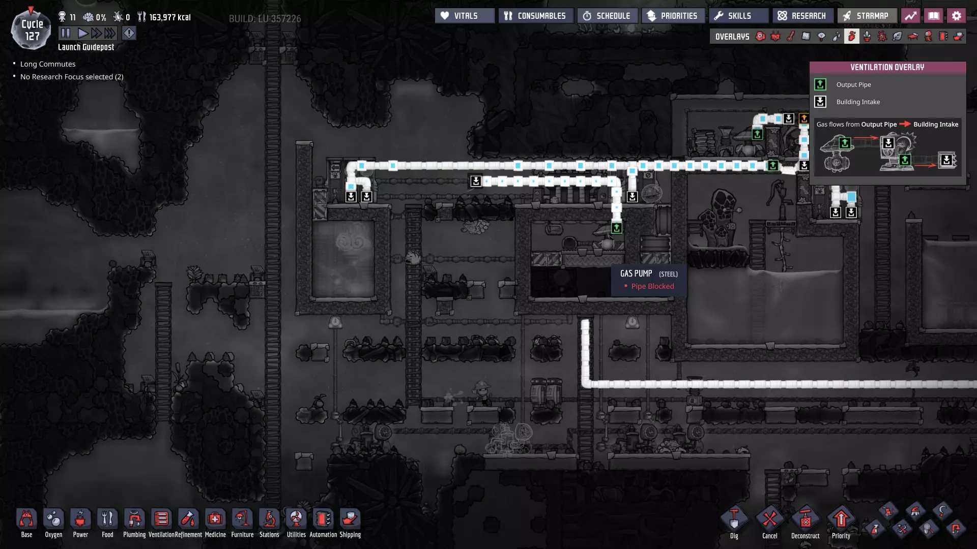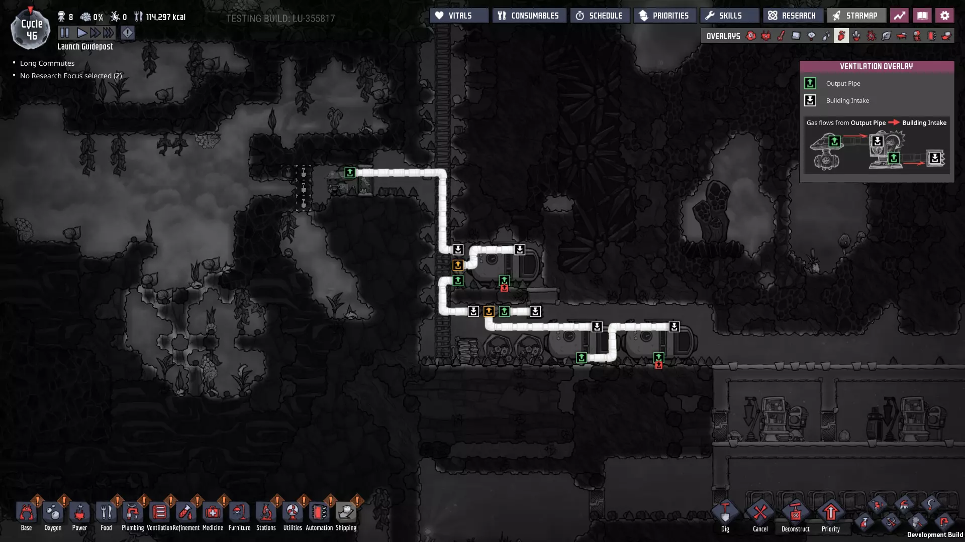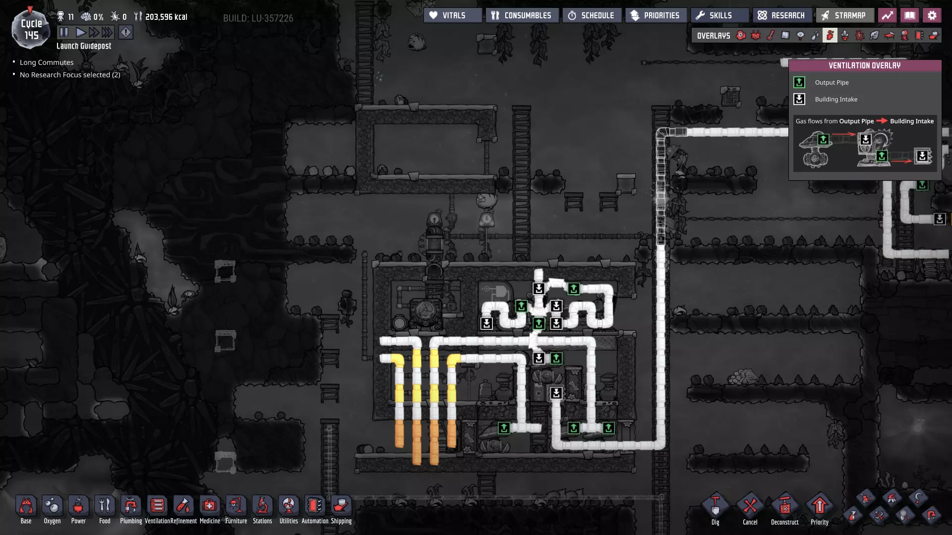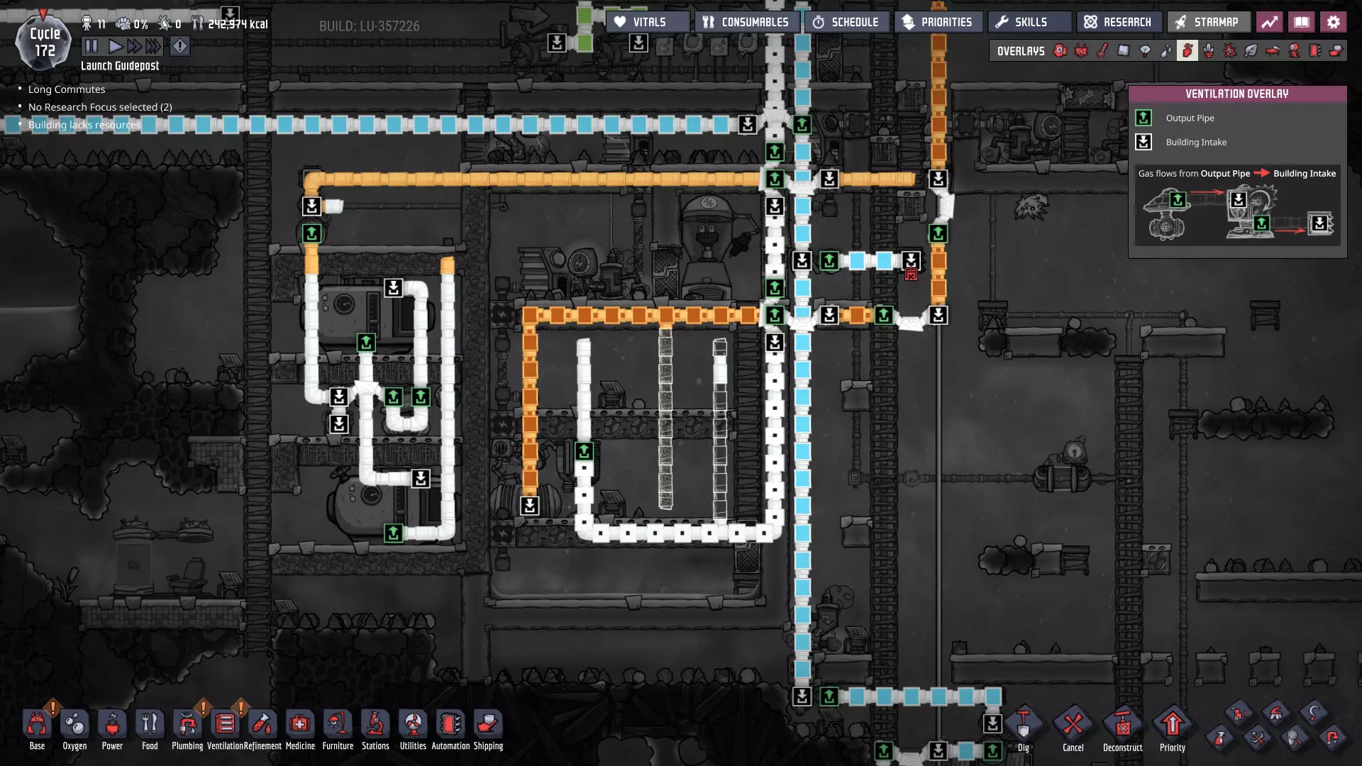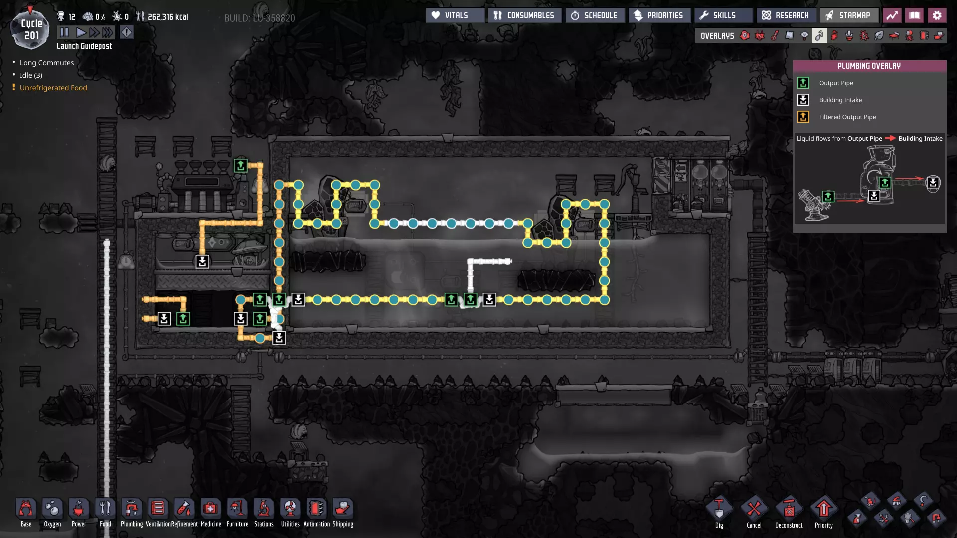 这与我的早期游戏指南结尾处的殖民地完全相同,这意味着已达成以下目标: - 已建立基础的食用树农场,并且我们的产量足以从 lice 面包转向腌菜。 - 复制人已开始获得专业技能,并且拥有足够的士气来学习技能而不会产生压力。 - 管道系统和基础水循环系统已就位。 - 已建立基于煤炭的发电系统。 - 已建立初始的碳洗涤器系统。 通过达成这些目标,殖民地已变得相对稳定,并满足了复制人的所有基本需求。因此,我们现在可以将时间花在更大的项目和探索上。基本上,我们已从“生存”阶段主要转向“扩张”阶段。尽管如此,我们仍然面临一些持续存在的问题: - 虽然我们的水资源供应充足,但它也是相当有限的。过多的研究将大幅消耗我们的储备,所以要小心! - 我们仍在通过藻类生产氧气。我们的初始区域藻类数量有限,因此我们要么需要持续开采更多藻类,要么需要找到某种方法过渡到基于水的氧气生产。 简而言之,我们目前最大的担忧是水资源,不过随着游戏进程,热量也将开始成为一个需要关注的问题。 其他注意事项: 如果你还没有这样做,或许可以在“优先级”选项卡上勾选“启用接近度”框。这是为了帮助大型基地更高效地进行任务选择,而且由于我们很快就要开始探索,复制人(Dupe)的移动时间也会增加,所以现在正是进行这项优化的好时机。