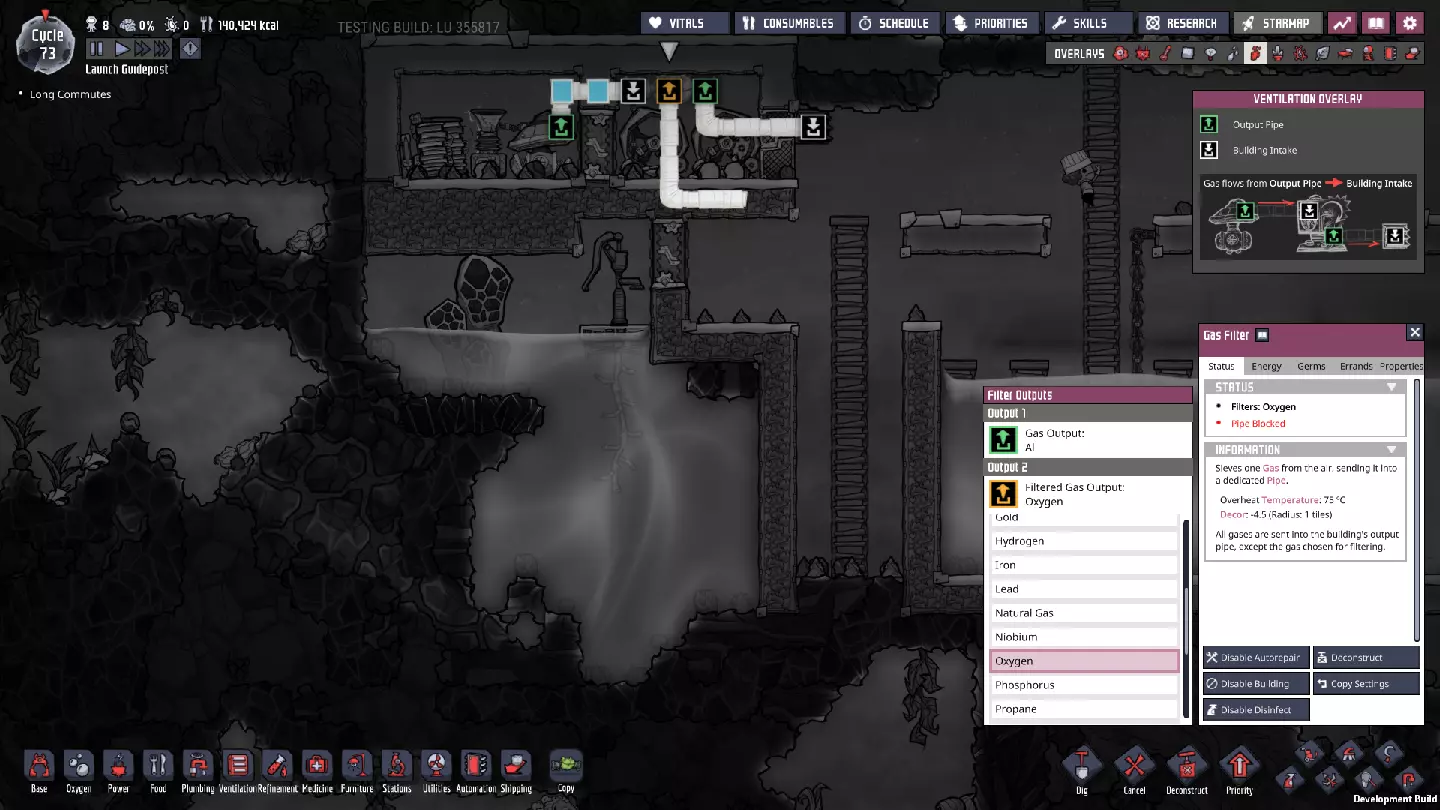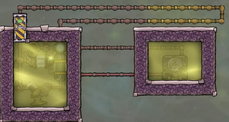 上方的气体过滤器设置为过滤氢气,而下方的则设置为过滤氯气——毕竟氯气显然是该气团中密度更大的气体。 按照这样的方式完成所有建造后,开采气体泵前方的最后几块砖块,然后连接最后的线路。你甚至不需要建造者来进行连接;所有部件都已预先建造完成,因此当你下达指令时,游戏会自动将它们连接起来。我经常这样建造,以便控制泵的实际启动时间,因为这种建造方式会在一段时间内消耗大量电力,让我们的复制人保持忙碌。 此外,一旦开始让泵主动工作,建议将门的通行权限设置为仅允许从气团内部向外通行。这将允许仍在内部的复制人(Dupe)逃脱,但在你更改权限之前,他们将无法返回。这能防止气体泄漏。话虽如此,一旦前方压力降低,你可能需要稍微开放该区域,以便物质更好地流动。此时,在本地发电机旁添加一个临时氧气扩散器也是个不错的选择。 过一段时间后,你会发现泵附近的压力比房间其他地方低很多。这时,可以考虑在前方额外添加一个泵,并禁用旧泵。