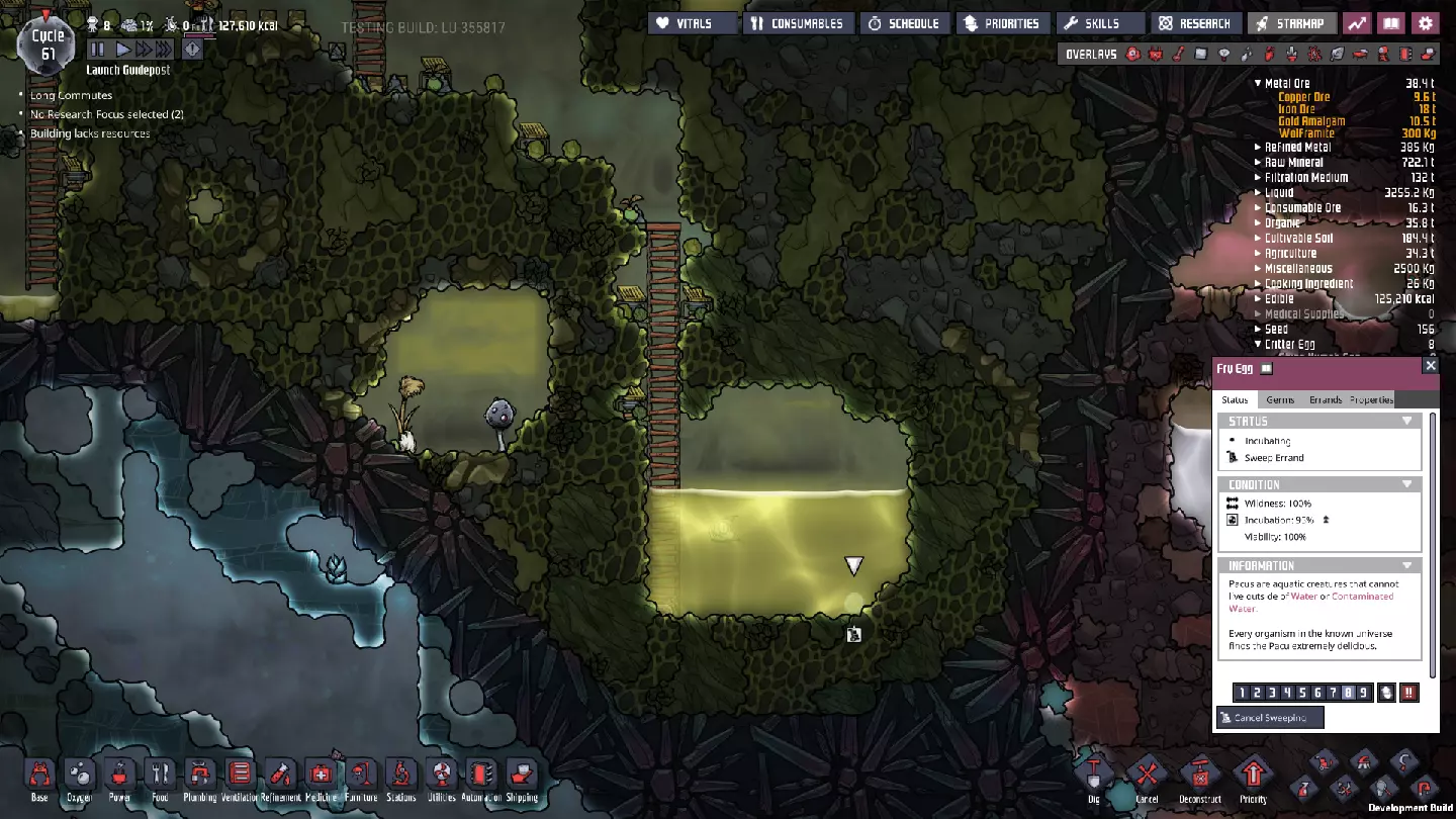 如你所见,我已经开采到了相当数量的黄金汞齐,并且进度已经推进到了中央通道的同一位置。不过,我们目前还没准备好连接各个区域——在完全连通它们之前,还有很多资源需要开采。但最吸引我注意的是——高处有许多小型污染水池,而右下角则有一个相当大的污染水池。我的计划是:再次利用重力,将所有污染水汇聚到右下角的大水池中。这对于高效的金属精炼来说也会非常有用。 如果我能做到这一点,并清理干净中央通道右侧的所有沼泽 biome,就能顺利地在该 biome 中延伸梯子,进而进入下方的冰冻 biome。说到冰冻生物群系,我们已经能看到大量的“喘息根”(Wheezeworts)正等待被利用。不过有一个潜在问题——这个生物群系也是名为“帕库”(Pacu)的鱼类生物的栖息地。