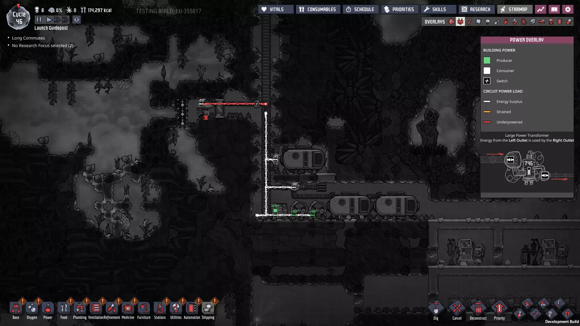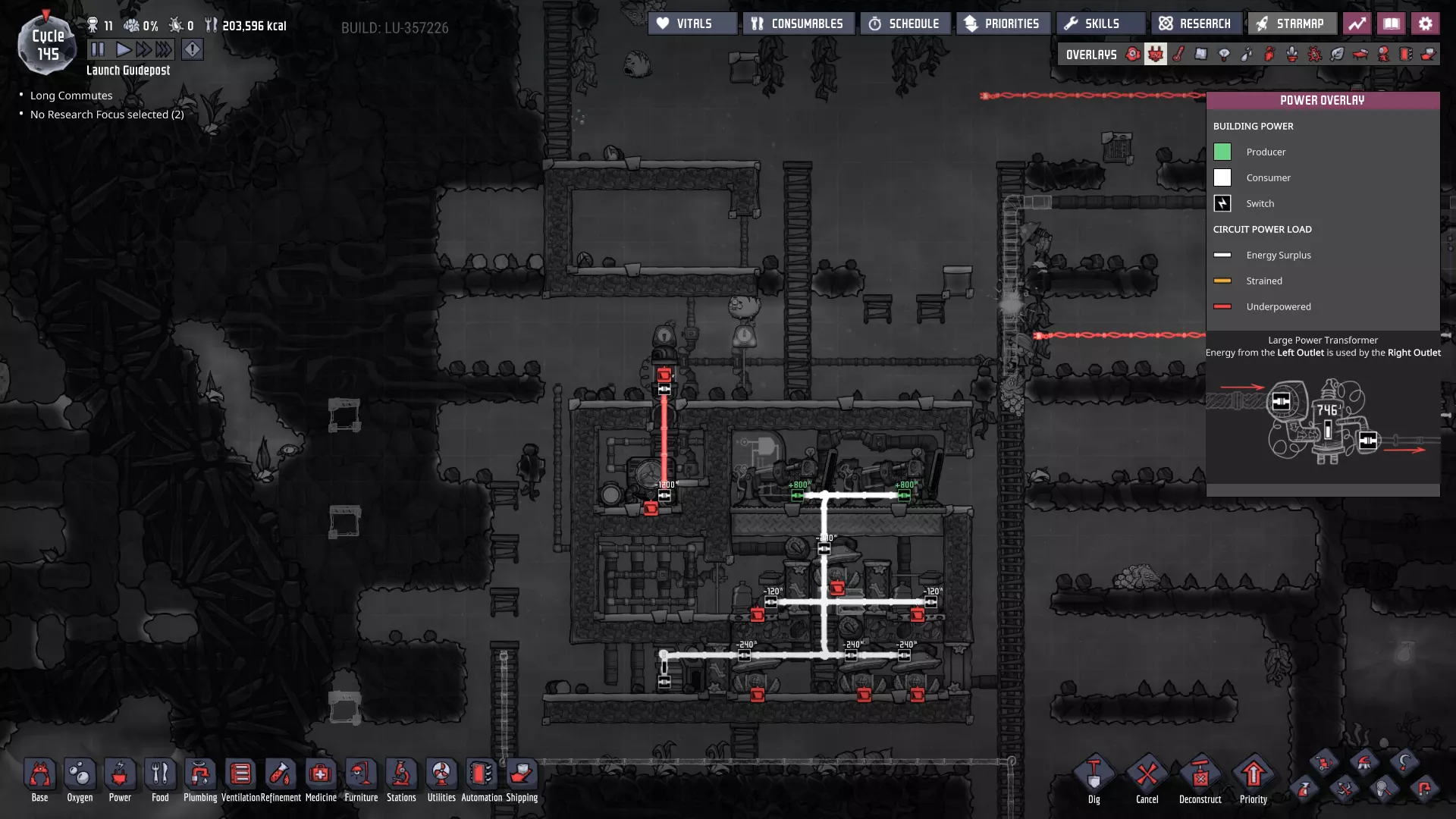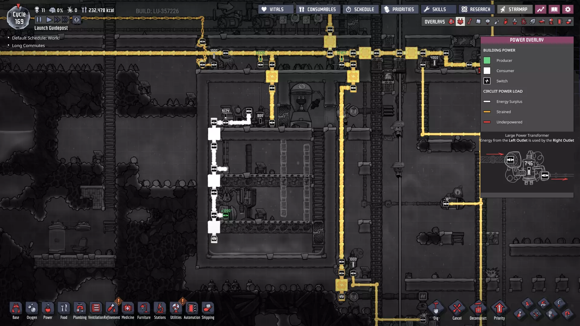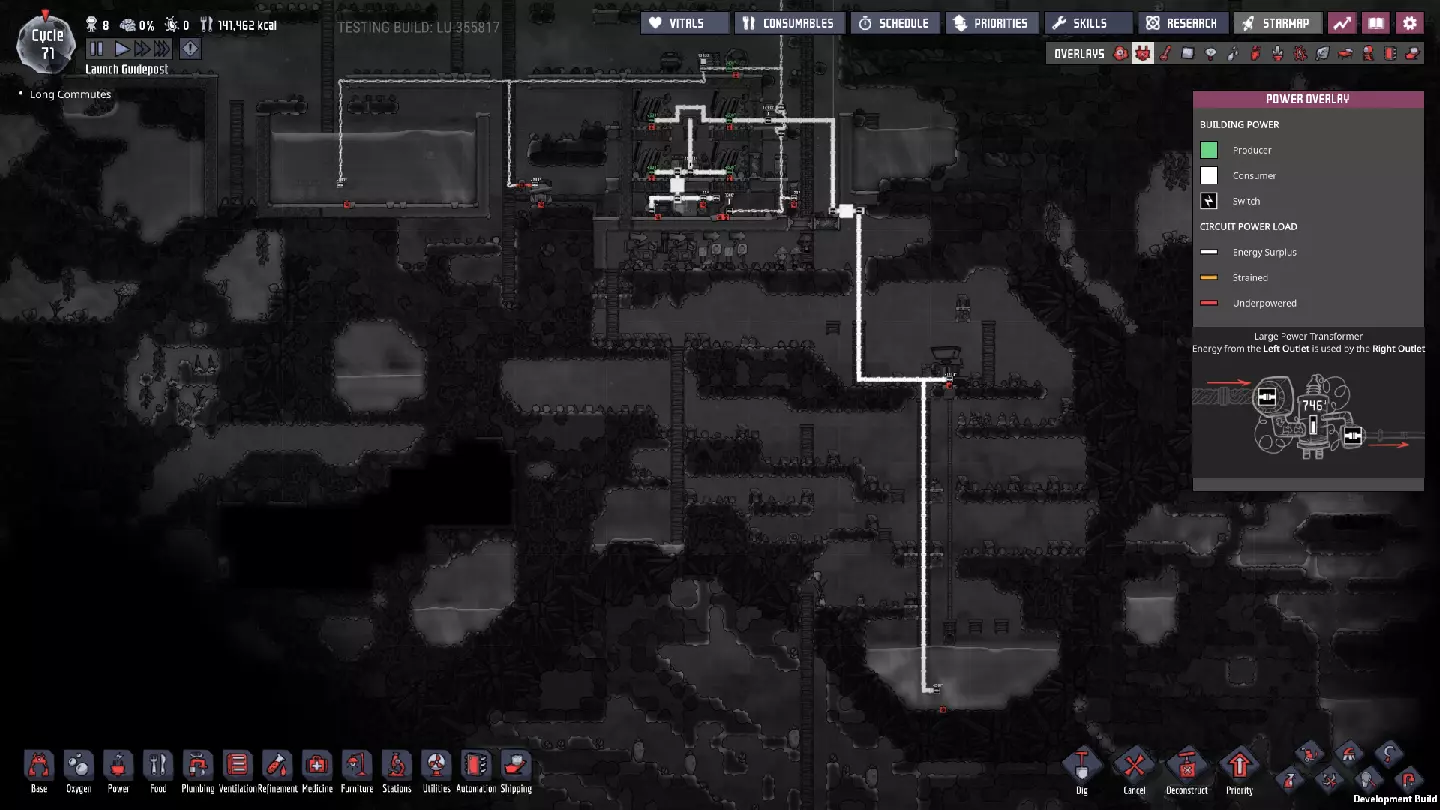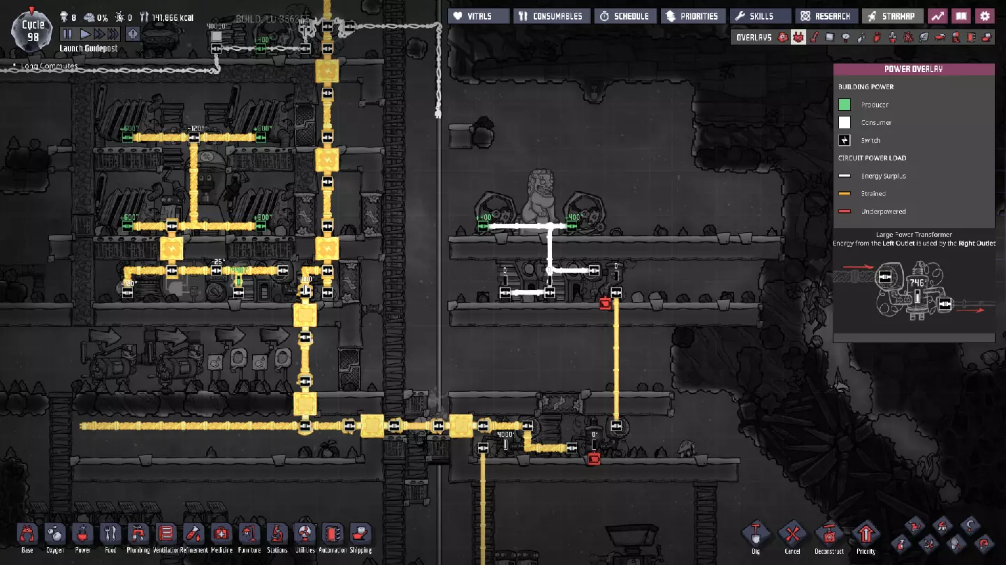 请注意主电力网格上新增的智能电池——它们现在已连接至大型电力变压器,而这些变压器负责将电网与我们的发电室相连! - **燃煤电厂 - 外部智能电池** - 待机阈值:100% - 激活阈值:60% - **手动发电机(闲置)电厂 - 外部智能电池** - 待机阈值:25% - 激活阈值:10% 这些设置将确保在使用“闲置电力”电池之前,优先使用煤炭发电。如果电力需求过大,仅靠煤炭无法维持电网运转,智能电池的电量最终会降至10%以下,届时我们将从备用智能电池供电系统获得电力补充。(我们希望它能在电力完全耗尽前启动——否则机器可能会停止运行。)随着外部电网缓冲中为其他连接点添加更多智能电池,系统将变得更加稳定。 通过交错设置智能电池的“待机”和“激活”状态,你可以决定不同电力来源的“启动”或“上线”顺序。一旦完成设置,你就能优先选择效率最高或产量最丰富的能源。 当然,我们能实现的设置不止这些——对于偏好节能和以复制人为主导发电的玩家: - **燃煤发电机** - 外部智能电池 - 待机:80% - 激活:50% - **手动发电机(闲置)** - 外部智能电池 - 待机:100% - 激活:75% 采用此设置后,闲置发电机产生的电力将优先于燃煤发电机被使用。发电机优先级排序 随着电网中电力来源的增加,以下是我通常会采用的优先级设置(在条件允许的情况下): **始终运行** - 太阳能:直接接入电网,这是100%的免费能源,因此应自动优先使用。 - 蒸汽:其次是蒸汽发电,这是一种可再生能源,通常来自于废热利用,我们希望最大限度地提高废热消除的运行时间。 - 氢气(若存储已满):氢气发电机效率极高,如果没有其他用途,我们不想浪费任何多余的氢气。 - 天然气(若存储已满):石油加工过程会自动产生天然气,如果不消耗精炼过程中产生的天然气,系统可能会陷入停滞。(最大压力与天然气间歇泉的压力相匹配。)按需运行 **石油发电机**——这些发电机会产生大量值得利用的额外资源,且每瓦产生的热量比列表中靠后的发电机更少。 根据基地的需求和能力,也可以认为“应始终运行”——油滑怪牧场需要二氧化碳来维持生存。 **天然气发电机(若储存量未处于极低状态)**——它比煤炭发电机更热效率,也能产生有用资源,尽管每瓦产生的资源远少于石油发电机。 **煤炭发电机**——它的效率远低于其他发电机。 手动发电机的优先级通常在天然气发电机(满负荷)和列表末尾之间浮动,具体取决于我在特定时刻的需求。如果有大量闲置时间,我通常会将它们的优先级提高以节省资源。要设置这些“优先级”,只需确保智能电池的设置会按此顺序触发发电机。 **条件供电** 随着基地的扩张和功能的增强,当电力储备较低时,你可能需要考虑关闭非关键的电力线路——我们也可以使用智能电池和自动化逻辑来实现这一点。例如,如果储备电量降至10%以下,我们可以关闭提升士气的建筑,如自动点唱机和街机机柜(一旦建造完成)——甚至可能是我们的研究站。通过关闭非关键结构,我们可以确保重要区域的“灯火通明”。 或者,你可能最终会考虑仅在电力极其充足时才激活某些电力线路。例如,肥料合成器被认为是“耗电设备”——其产生的天然气不足以维持自身运转。不过,肥料本身就相当有用,而且这些天然气供应还能在殖民地其他天然气来源(间歇泉)处于休眠状态时为其提供支持。现在消耗多余电力以稳定日后的电力供应,这绝非损失。 在游戏后期,火箭燃料的冷却操作可能是一种不错的“折中”条件性消耗。这并非至关重要,但玩家自然希望看到火箭发射并带回新资源,因此我们可能也不想将其使用优先级设置得过低。或许可以将其设置为只要我们没有使用煤炭的风险,就可以运行。将电力集中在主电力线上,能让我们通过自动化系统根据殖民地随时变化的供需情况来决定电力的使用方式。这是一个非常实用的原则,在我们为不断扩大的基地增加更多功能时,请务必牢记这一点。 其他注意事项: 如果你还记得,我之前提到过在我的游戏流程中,另一个蒸汽喷口最近进入了休眠状态。我会在进入下一部分内容前花些时间处理这个问题,最终会得到这样的结果: