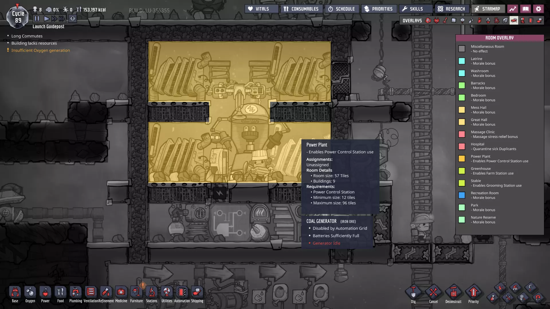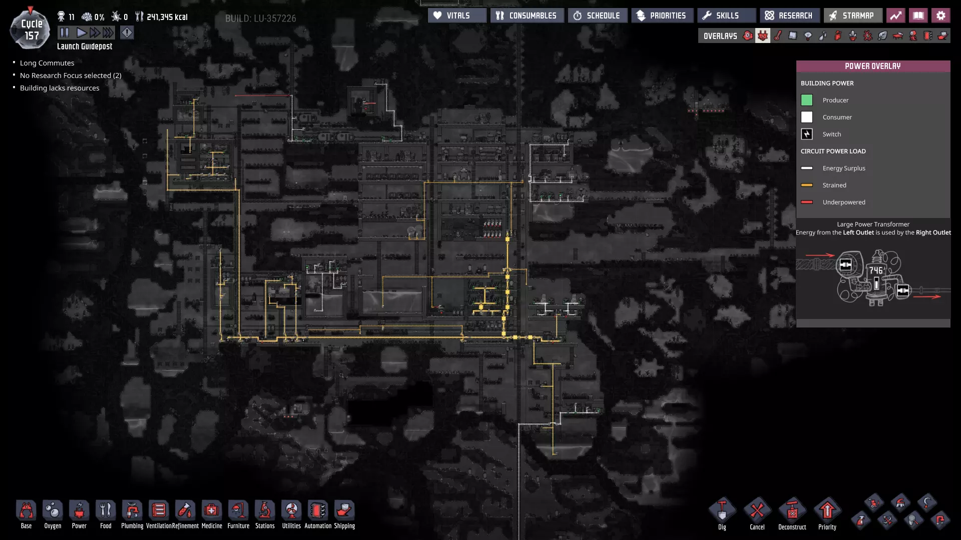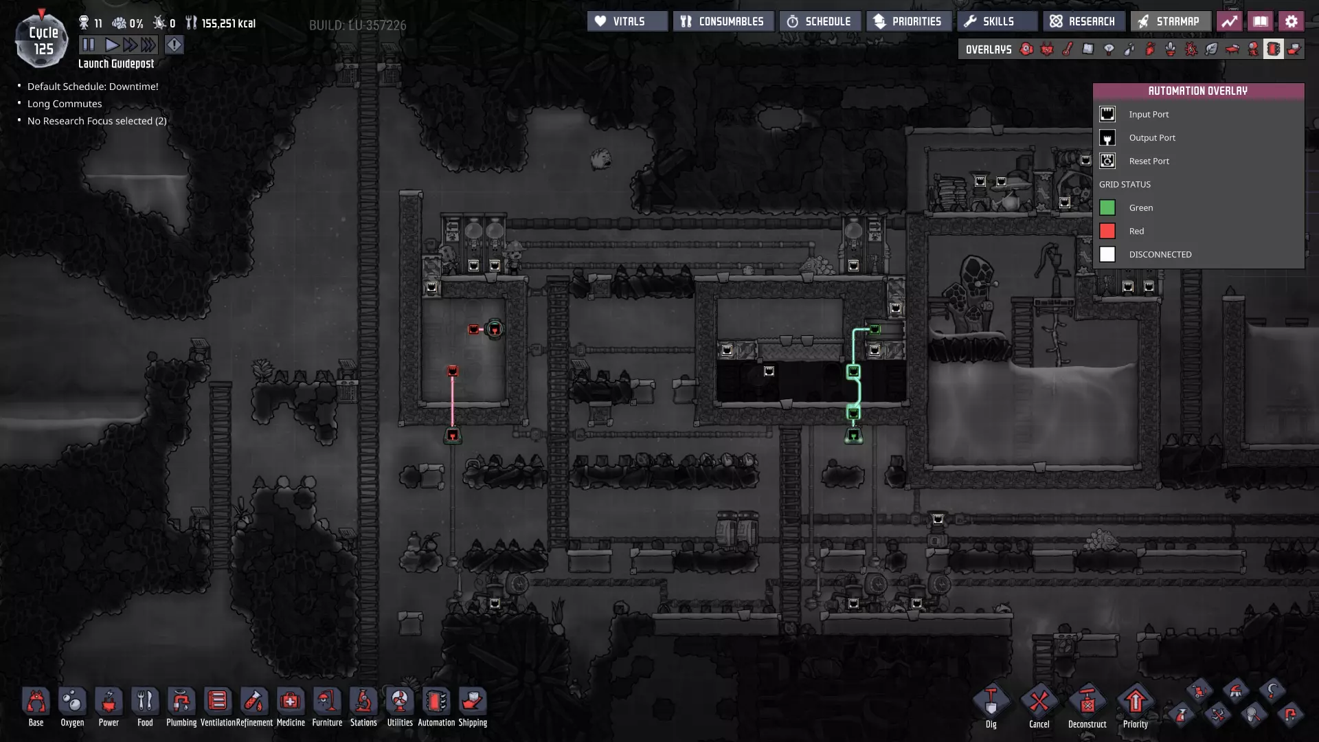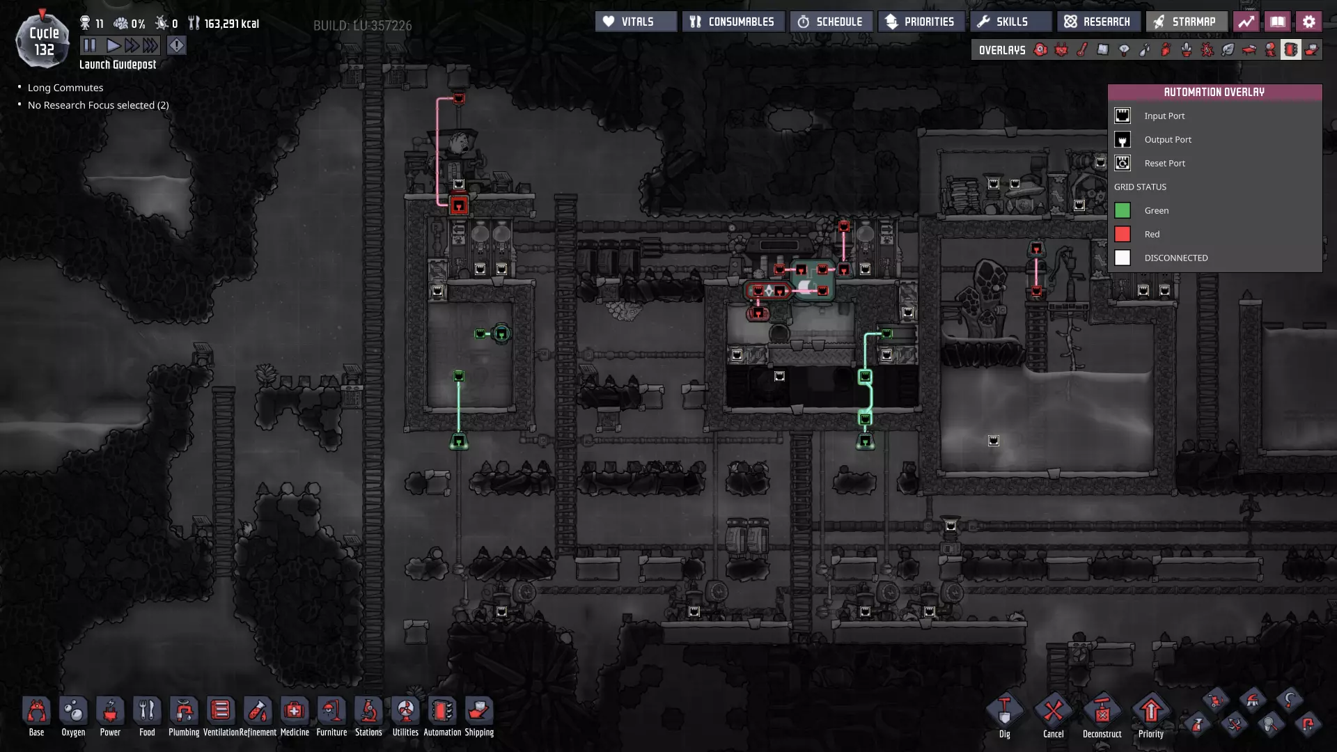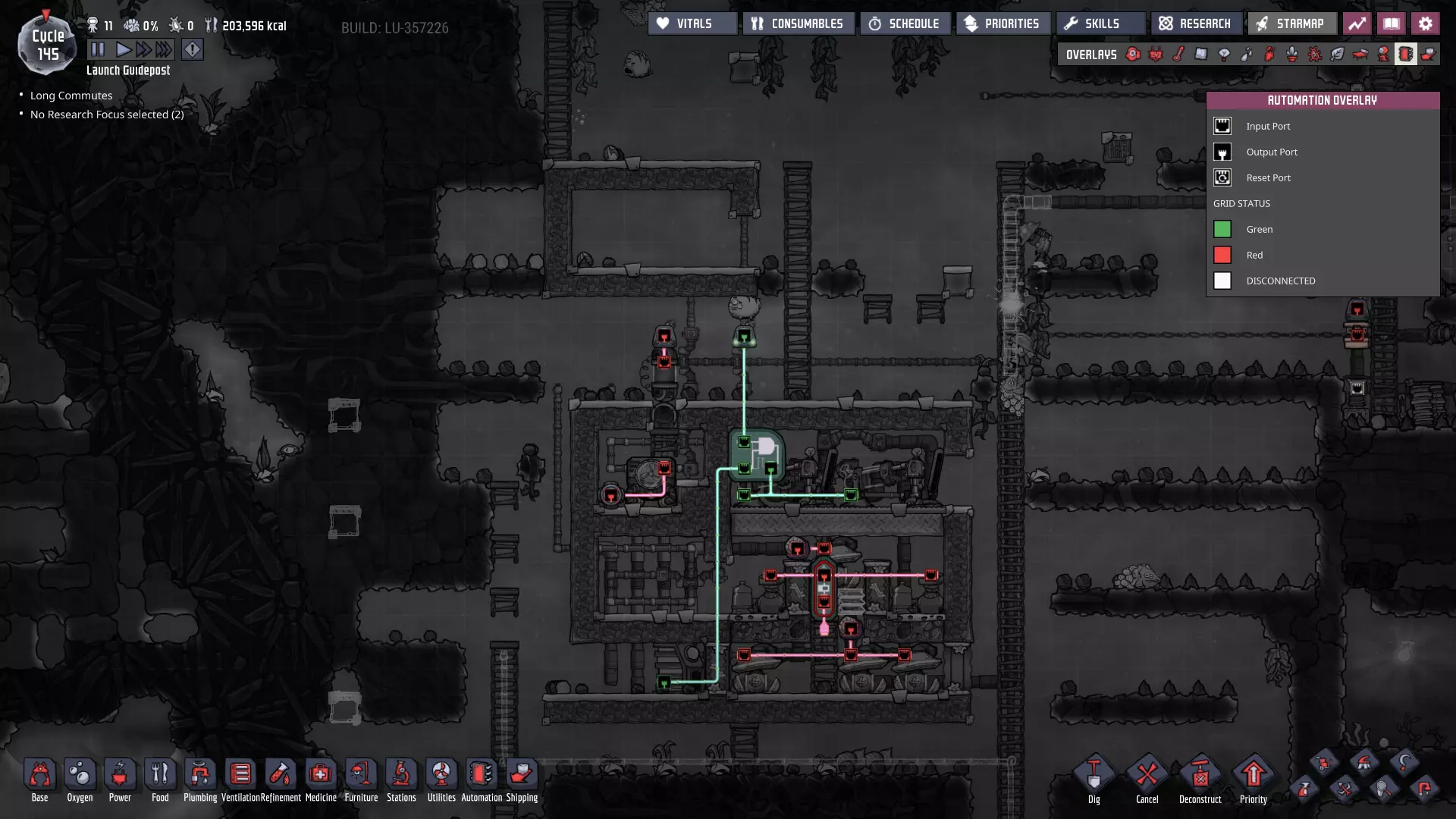 请注意主电力网格上新增的智能电池——它们现在已连接至大型电力变压器,而这些变压器负责将电网与我们的发电室相连! - **燃煤电厂 - 外部智能电池** - 待机阈值:100% - 激活阈值:60% - **手动发电机(闲置)电厂 - 外部智能电池** - 待机阈值:25% - 激活阈值:10% 这些设置将确保在使用“闲置电力”电池之前,优先使用煤炭发电。如果电力需求过大,仅靠煤炭无法维持电网运转,智能电池的电量最终会降至10%以下,届时我们将从备用智能电池供电系统获得电力补充。(我们希望它能在电力完全耗尽前启动——否则机器可能会停止运行。)随着外部电网缓冲中为其他连接点添加更多智能电池,系统将变得更加稳定。 通过交错设置智能电池的“待机”和“激活”状态,你可以决定不同电力来源的“启动”或“上线”顺序。一旦完成设置,你就能优先选择效率最高或产量最丰富的能源。 当然,我们能实现的设置不止这些——对于偏好节能和以复制人为主导发电的玩家: - **燃煤发电机** - 外部智能电池 - 待机:80% - 激活:50% - **手动发电机(闲置)** - 外部智能电池 - 待机:100% - 激活:75% 采用此设置后,闲置发电机产生的电力将优先于燃煤发电机被使用。发电机优先级排序 随着电网中电力来源的增加,以下是我通常会采用的优先级设置(在条件允许的情况下): **始终运行** - 太阳能:直接接入电网,这是100%的免费能源,因此应自动优先使用。 - 蒸汽:其次是蒸汽发电,这是一种可再生能源,通常来自于废热利用,我们希望最大限度地提高废热消除的运行时间。 - 氢气(若存储已满):氢气发电机效率极高,如果没有其他用途,我们不想浪费任何多余的氢气。 - 天然气(若存储已满):石油加工过程会自动产生天然气,如果不消耗精炼过程中产生的天然气,系统可能会陷入停滞。(最大压力与天然气间歇泉的压力相匹配。)按需运行 **石油发电机**——这些发电机会产生大量值得利用的额外资源,且每瓦产生的热量比列表中靠后的发电机更少。 根据基地的需求和能力,也可以认为“应始终运行”——油滑怪牧场需要二氧化碳来维持生存。 **天然气发电机(若储存量未处于极低状态)**——它比煤炭发电机更热效率,也能产生有用资源,尽管每瓦产生的资源远少于石油发电机。 **煤炭发电机**——它的效率远低于其他发电机。 手动发电机的优先级通常在天然气发电机(满负荷)和列表末尾之间浮动,具体取决于我在特定时刻的需求。如果有大量闲置时间,我通常会将它们的优先级提高以节省资源。要设置这些“优先级”,只需确保智能电池的设置会按此顺序触发发电机。 **条件供电** 随着基地的扩张和功能的增强,当电力储备较低时,你可能需要考虑关闭非关键的电力线路——我们也可以使用智能电池和自动化逻辑来实现这一点。例如,如果储备电量降至10%以下,我们可以关闭提升士气的建筑,如自动点唱机和街机机柜(一旦建造完成)——甚至可能是我们的研究站。通过关闭非关键结构,我们可以确保重要区域的“灯火通明”。 或者,你可能最终会考虑仅在电力极其充足时才激活某些电力线路。例如,肥料合成器被认为是“耗电设备”——其产生的天然气不足以维持自身运转。不过,肥料本身就相当有用,而且这些天然气供应还能在殖民地其他天然气来源(间歇泉)处于休眠状态时为其提供支持。现在消耗多余电力以稳定日后的电力供应,这绝非损失。 在游戏后期,火箭燃料的冷却操作可能是一种不错的“折中”条件性消耗。这并非至关重要,但玩家自然希望看到火箭发射并带回新资源,因此我们可能也不想将其使用优先级设置得过低。或许可以将其设置为只要我们没有使用煤炭的风险,就可以运行。将电力集中在主电力线上,能让我们通过自动化系统根据殖民地随时变化的供需情况来决定电力的使用方式。这是一个非常实用的原则,在我们为不断扩大的基地增加更多功能时,请务必牢记这一点。 其他注意事项: 如果你还记得,我之前提到过在我的游戏流程中,另一个蒸汽喷口最近进入了休眠状态。我会在进入下一部分内容前花些时间处理这个问题,最终会得到这样的结果: