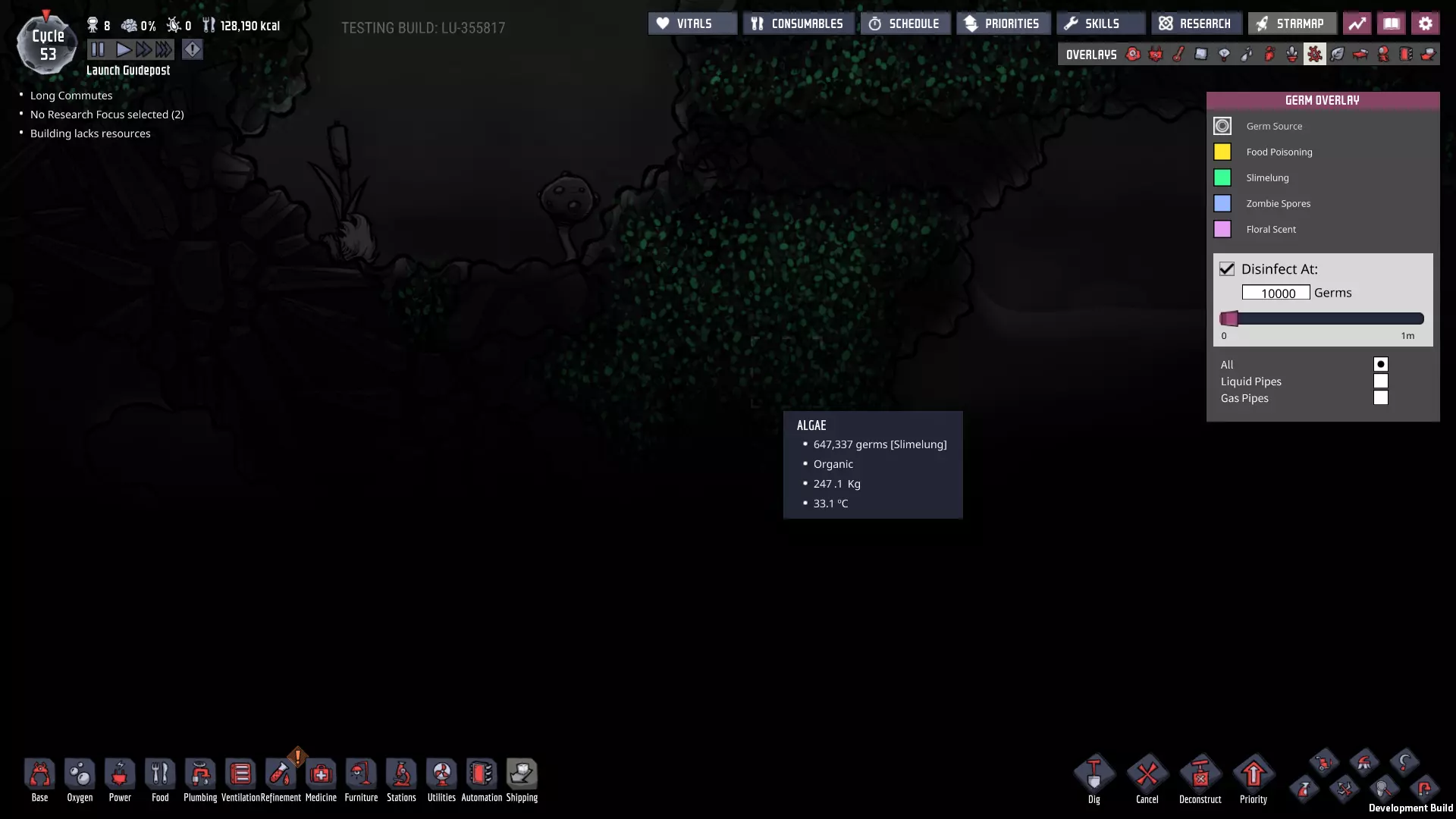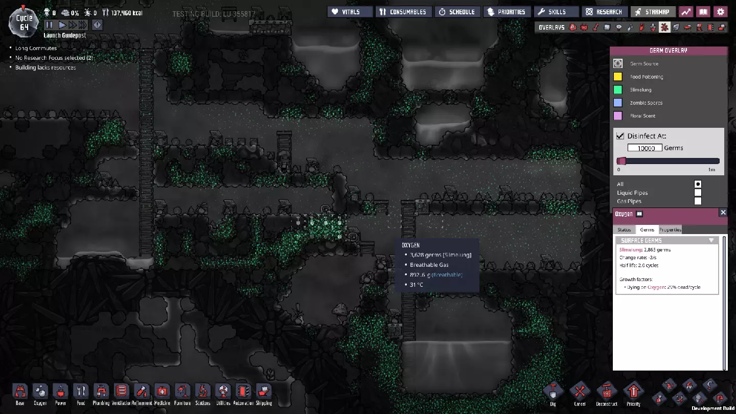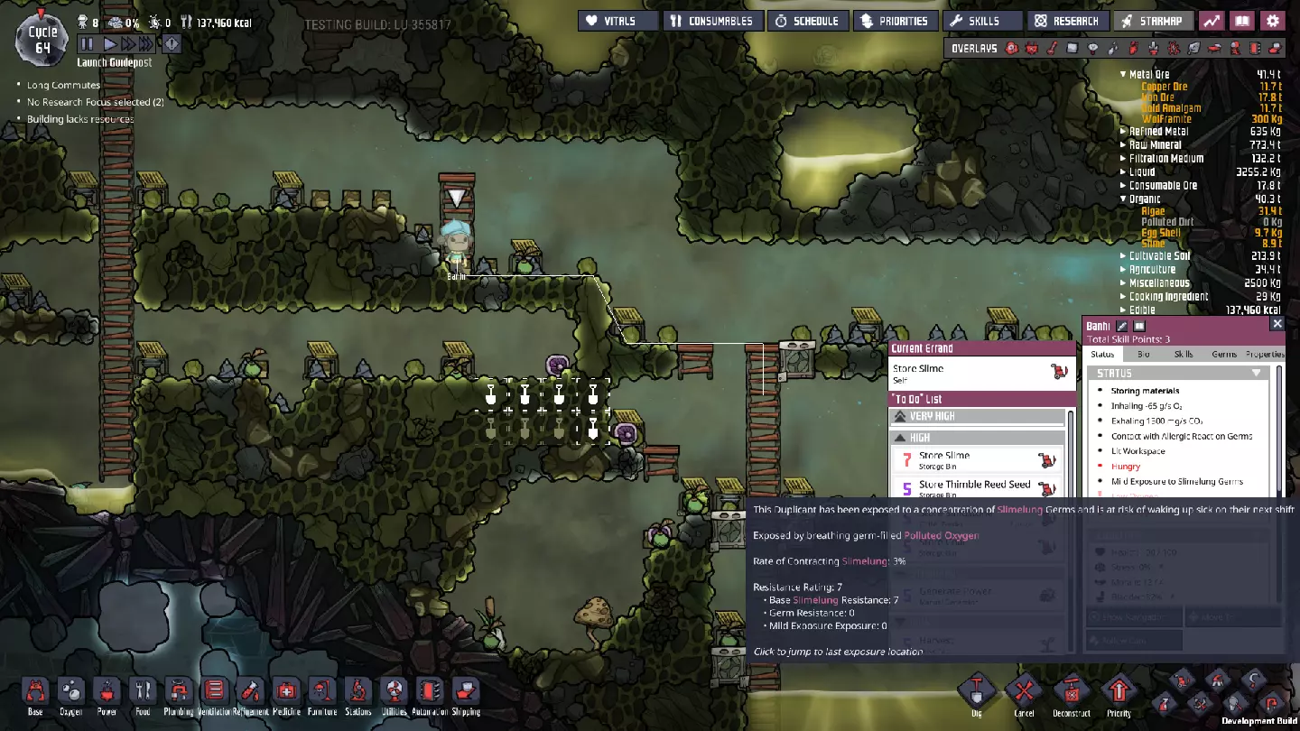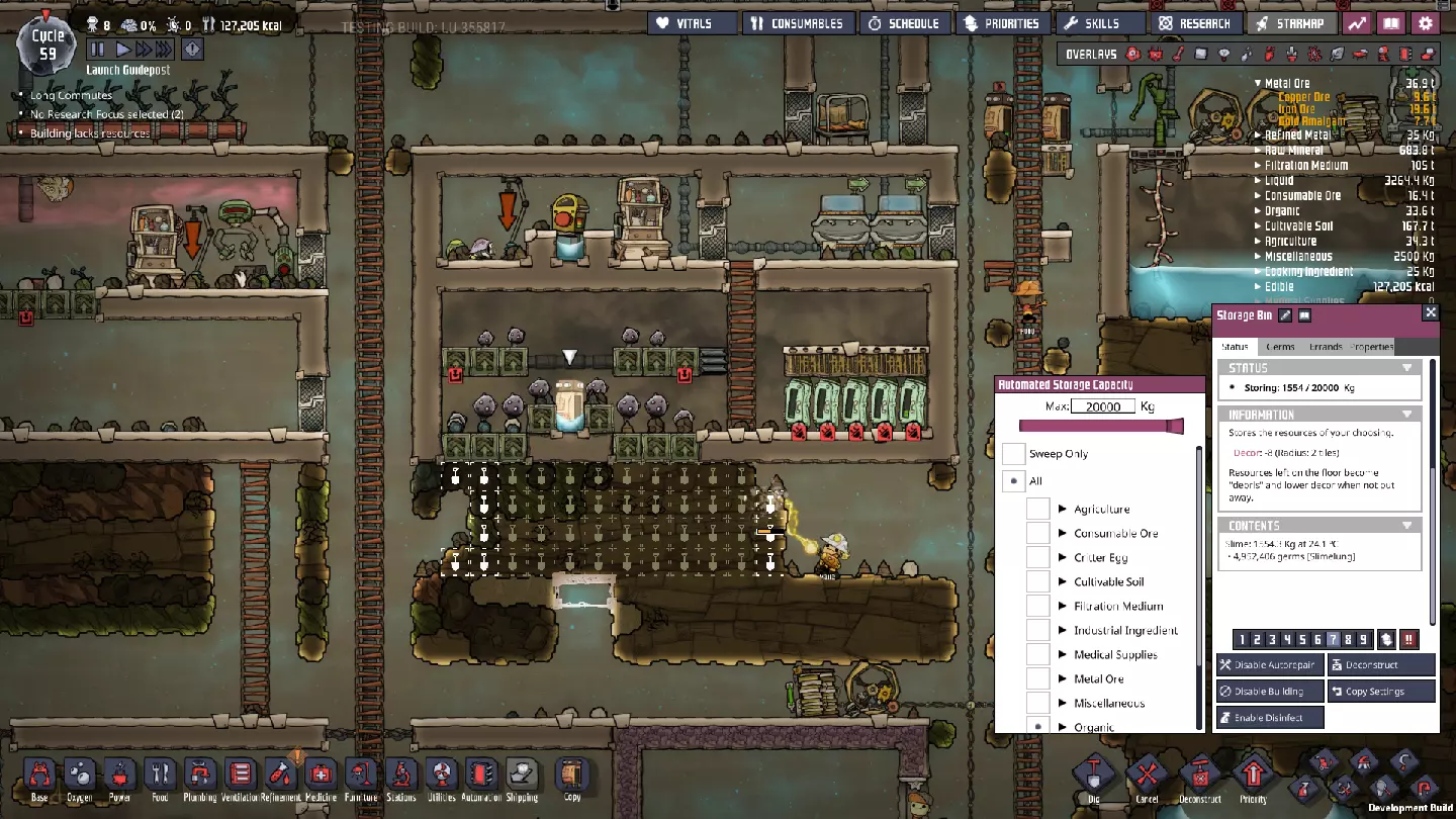 一旦除臭器制作完成并装入沙子,将梯子延伸几块砖,寻找非史莱姆区域来放置新的除臭器——尤其是当你看到附近有污染氧气团时。以我为例,右侧矿石洗涤器下方就有一个污染氧气团——我要在那里找到一个相对无史莱姆的入口点,并准备释放其中的气体。 另外,当你收获第一批史莱姆后,迅速将准备好的储物箱设置为以7级优先级储存史莱姆。同时,禁用对其的消毒;这将是徒劳的,这也是为什么我们在准备区域的出口处设置了洗手池。