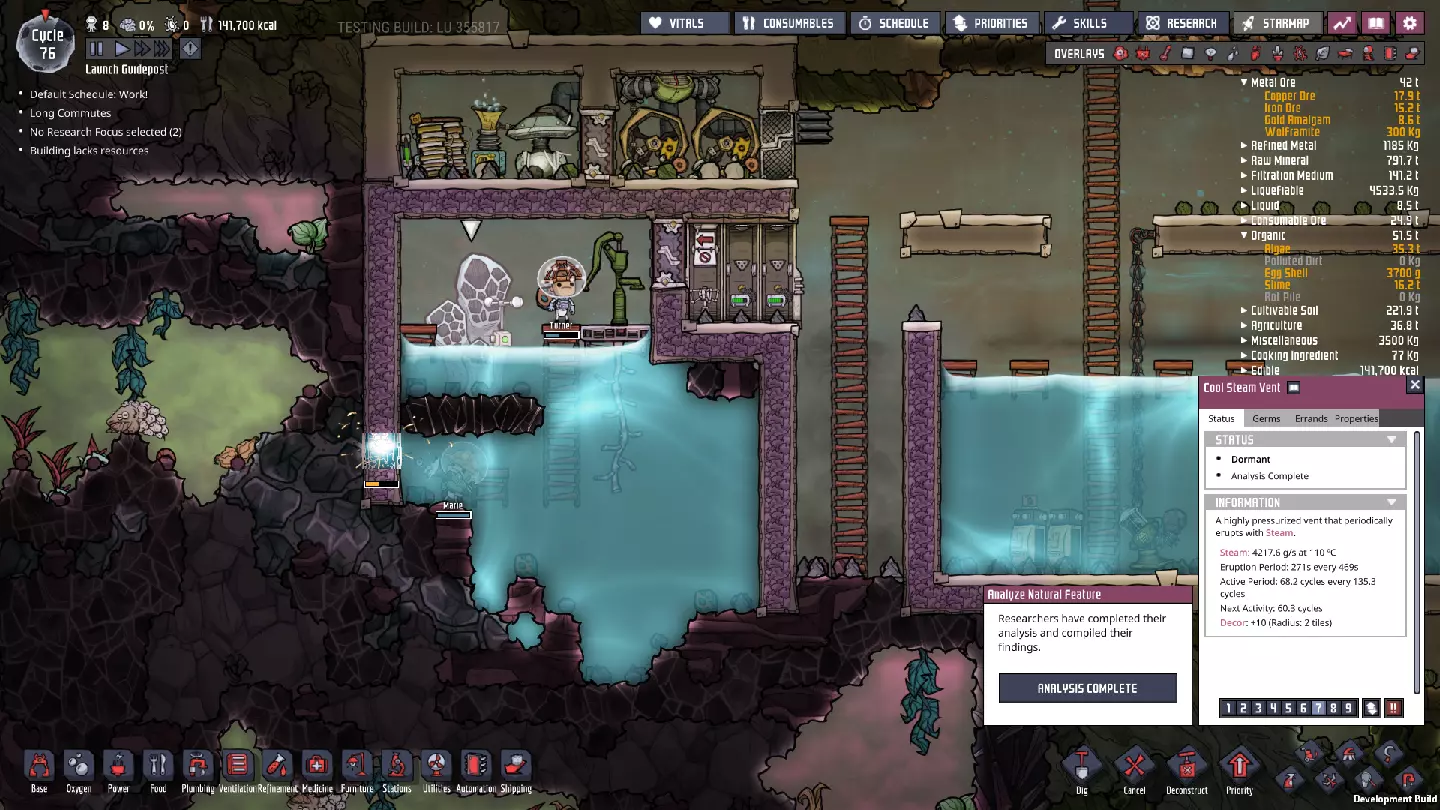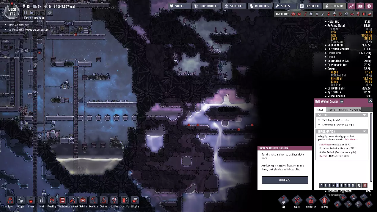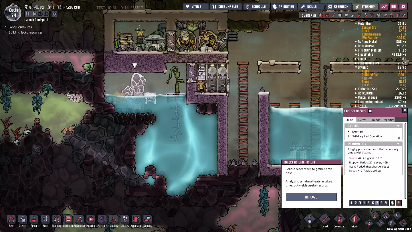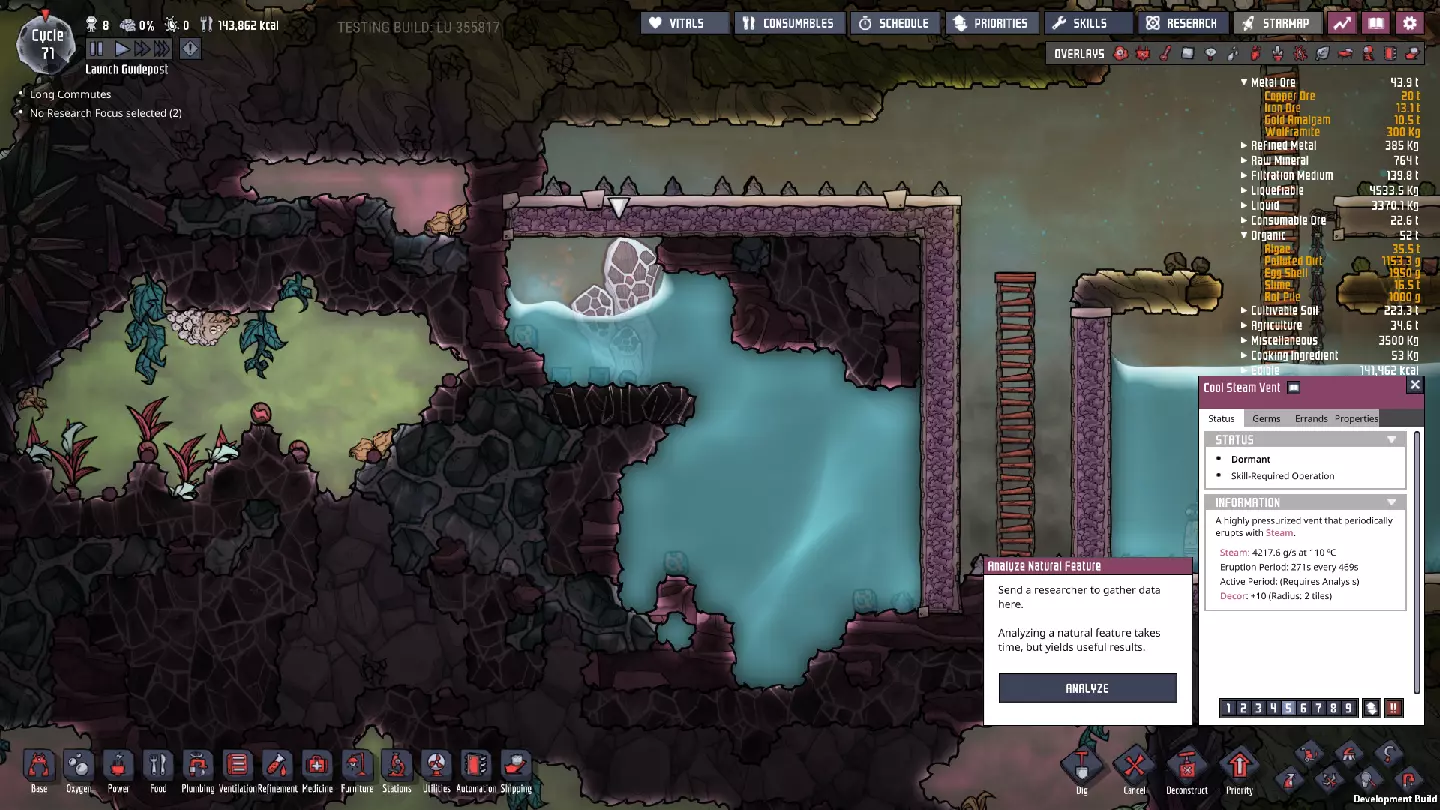 成功了——我们现在已经了解了这个“酷蒸汽喷口”的所有属性。当然,要利用这些属性需要进行不少计算。如果你觉得这听起来很枯燥,可以考虑使用像“ONI助手:ONI间歇泉计算器”[oni-assistant.com]这样的工具,它会帮你处理大部分计算工作。 我在那里输入数据后得到了以下结果: - 活跃期间平均输出:2.437千克/秒的水。 - 每个活跃/休眠周期的平均输出:1.228千克/秒的水。(对于这类喷口来说,这个数值其实有点低……) - 一个完整的“活动周期”(活跃/休眠)可以完全填满100个格子。 还有一些关于冷却的数据,但我之后再考虑。基本上,我们有一半时间处于休眠状态,所以每个“活动周期”内进入的所有物资都需要储存一半——如果我们想随着时间推移平稳输入,并在未来充分利用平均量,那么我们的舱室需要50格的储水空间。舱室最宽处为10格,但由于中子素和太空服对接站的地板,我们有两个“半行”——为了充分利用这个冷蒸汽喷口,最终需要在中子素下方设置三行格子。 现阶段,我们并没有大量使用这些水,可以让热量散发到相邻的腐蚀性生物群系中,所以目前可以先让水静置,之后再完全封闭空间。这在一定程度上是可能的,因为我们现在使用的是“泰拉”地图——开局就拥有大量洁净、凉爽的水资源,所以暂时无需着急。(不过,对于其他类型的地图而言,情况可能并非如此。) 目前,用热水而非冷水进行研究,就已经能带来巨大的改变……在某些其他地图类型上,这甚至可能足以让我们的基地暂时维持运转。 ### 其他注意事项 虽然我们可能尚未充分利用这个“低温蒸汽喷口”,但我们已确保该区域可以安全作业,并为未来的开发做好了准备。要完全整合“低温蒸汽喷口”,还有一些事情需要处理,所以尽管我们可能还没有完全“驯服”它,但已经“捕获”了它,为后续工作做好了准备。这里不会出现任何泄漏或其他问题,我们可以在方便的时候再回来处理。如果你处于其他地图类型,且藻类或铁锈存量不足,那么从这里抽取水用于电解器或许是个明智的选择。不过,目前你通常会拥有某种能维持一段时间的氧气供应;开局附近的前两个生态 biome 中,总会有一次性消耗品可用于制氧。在我为撰写本指南进行的游戏流程中,我储备了 35300 千克藻类——足够我使用很长一段时间了。 石油 biome 此前,我曾短暂瞥见石油 biome: