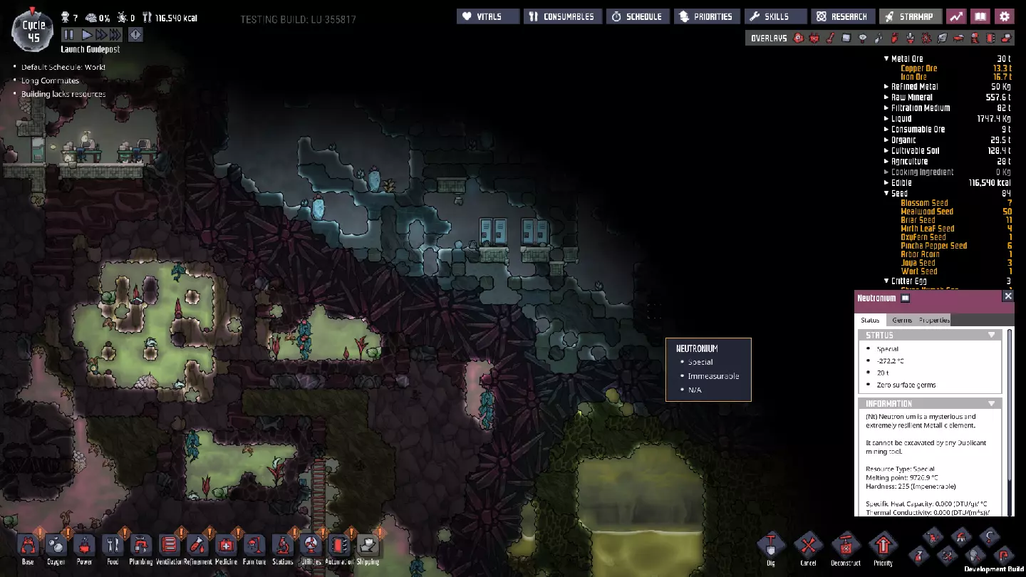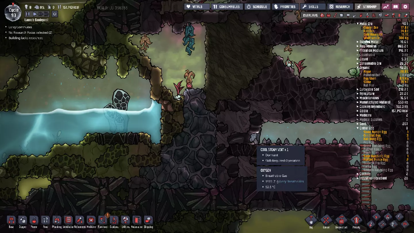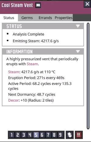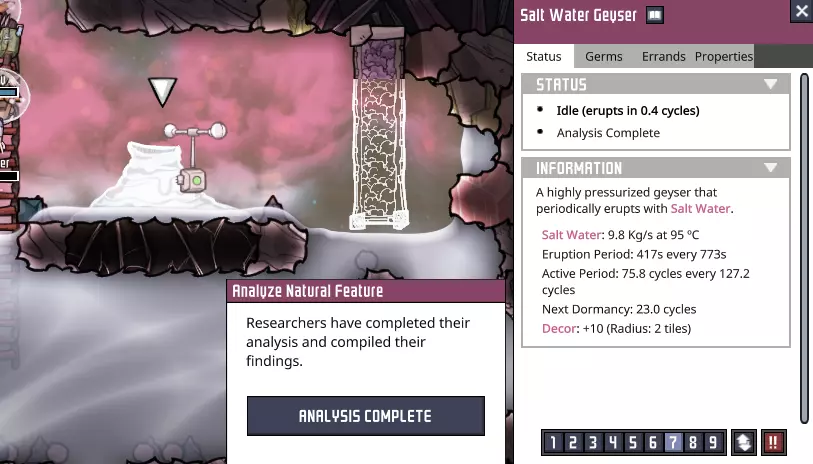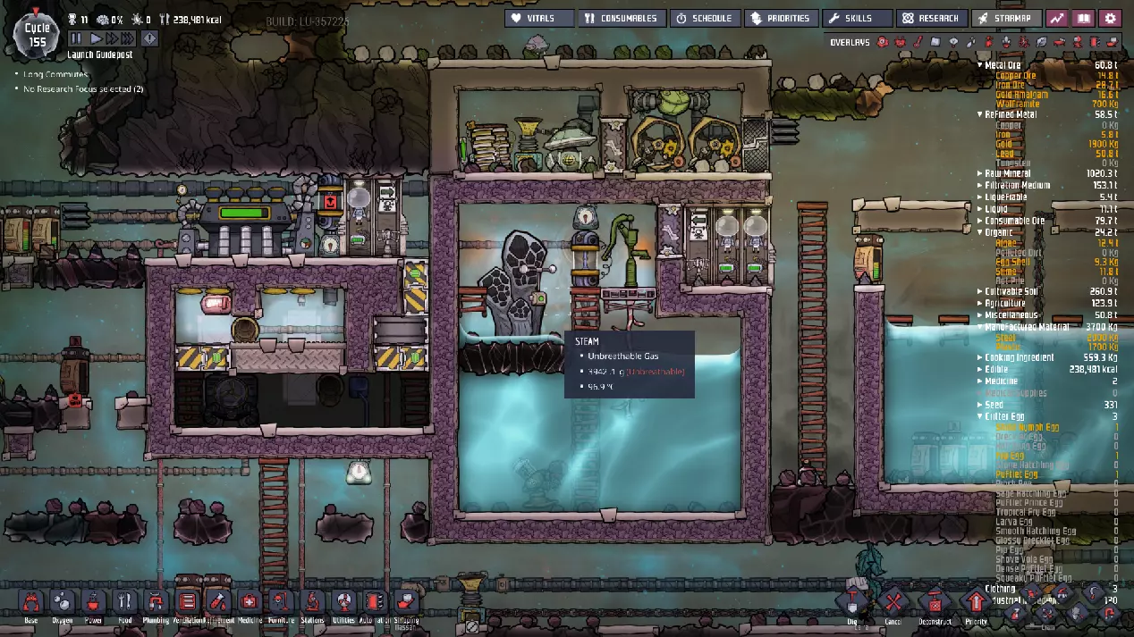 成功了——我们现在已经了解了这个“酷蒸汽喷口”的所有属性。当然,要利用这些属性需要进行不少计算。如果你觉得这听起来很枯燥,可以考虑使用像“ONI助手:ONI间歇泉计算器”[oni-assistant.com]这样的工具,它会帮你处理大部分计算工作。 我在那里输入数据后得到了以下结果: - 活跃期间平均输出:2.437千克/秒的水。 - 每个活跃/休眠周期的平均输出:1.228千克/秒的水。(对于这类喷口来说,这个数值其实有点低……) - 一个完整的“活动周期”(活跃/休眠)可以完全填满100个格子。 还有一些关于冷却的数据,但我之后再考虑。基本上,我们有一半时间处于休眠状态,所以每个“活动周期”内进入的所有物资都需要储存一半——如果我们想随着时间推移平稳输入,并在未来充分利用平均量,那么我们的舱室需要50格的储水空间。舱室最宽处为10格,但由于中子素和太空服对接站的地板,我们有两个“半行”——为了充分利用这个冷蒸汽喷口,最终需要在中子素下方设置三行格子。 现阶段,我们并没有大量使用这些水,可以让热量散发到相邻的腐蚀性生物群系中,所以目前可以先让水静置,之后再完全封闭空间。这在一定程度上是可能的,因为我们现在使用的是“泰拉”地图——开局就拥有大量洁净、凉爽的水资源,所以暂时无需着急。(不过,对于其他类型的地图而言,情况可能并非如此。) 目前,用热水而非冷水进行研究,就已经能带来巨大的改变……在某些其他地图类型上,这甚至可能足以让我们的基地暂时维持运转。 ### 其他注意事项 虽然我们可能尚未充分利用这个“低温蒸汽喷口”,但我们已确保该区域可以安全作业,并为未来的开发做好了准备。要完全整合“低温蒸汽喷口”,还有一些事情需要处理,所以尽管我们可能还没有完全“驯服”它,但已经“捕获”了它,为后续工作做好了准备。这里不会出现任何泄漏或其他问题,我们可以在方便的时候再回来处理。如果你处于其他地图类型,且藻类或铁锈存量不足,那么从这里抽取水用于电解器或许是个明智的选择。不过,目前你通常会拥有某种能维持一段时间的氧气供应;开局附近的前两个生态 biome 中,总会有一次性消耗品可用于制氧。在我为撰写本指南进行的游戏流程中,我储备了 35300 千克藻类——足够我使用很长一段时间了。 石油 biome 此前,我曾短暂瞥见石油 biome: