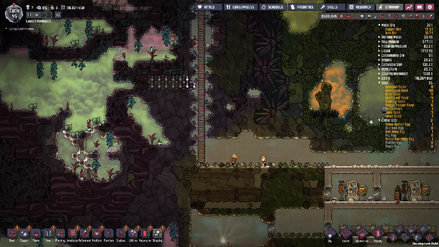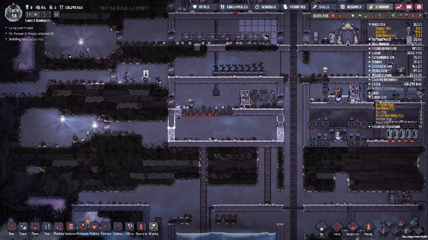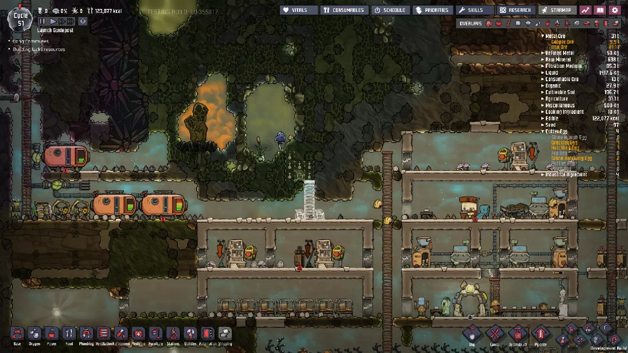 这是一份《缺氧》正式版的中期游戏指南。本指南旨在教授玩家从第50周期到第250周期乃至更后期所需的思路与策略。不过,部分后期内容仍基于早已过时的“火箭科技升级”版本。 换句话说,本指南侧重于如何从利用初始资源满足基本需求,过渡到应对长期问题、近乎完全稳定殖民地,并提升基地的各项能力。### 简介 本指南假设你已熟悉处理我称之为“早期游戏”基地所面临的以下问题: - 二氧化碳 - 食物 - 卫生/管道系统 - 氧气(来自藻类) - 发电(基础,来自煤炭) - 士气管理 如果其中任何一项对你来说仍然是主要问题,建议先阅读我的早期游戏指南,然后再继续: https://steamcommunity.com/sharedfiles/filedetails/?id=1359110726 如果你希望使用我所基于的世界生成种子,但又想忽略早期游戏指南,我在“Terra”星球上使用的世界生成种子是2500。这些策略并不特定于某个种子,但我认识到在跟随指南学习时,使用相同种子会很有帮助。话虽如此,部分策略仅适用于特定类型的地图——请注意,本指南将重点介绍“Terra”(泰拉)地图类型。我会尽量为其他类型的地图种子提供指导性说明,但主要还是聚焦于“Terra”地图,因为本指南旨在帮助新手学习游戏,而“Terra”地图最适合这一目的。 我会避免依赖随机生成的“隐藏间歇泉”的策略,因为并非所有地图种子都包含特定类型的间歇泉。我也会忽略打印舱的“奖励物品”,因为这些同样具有很大的随机性。 中期游戏的开始 在继续之前,先介绍一下我将以此为起点的基地情况: