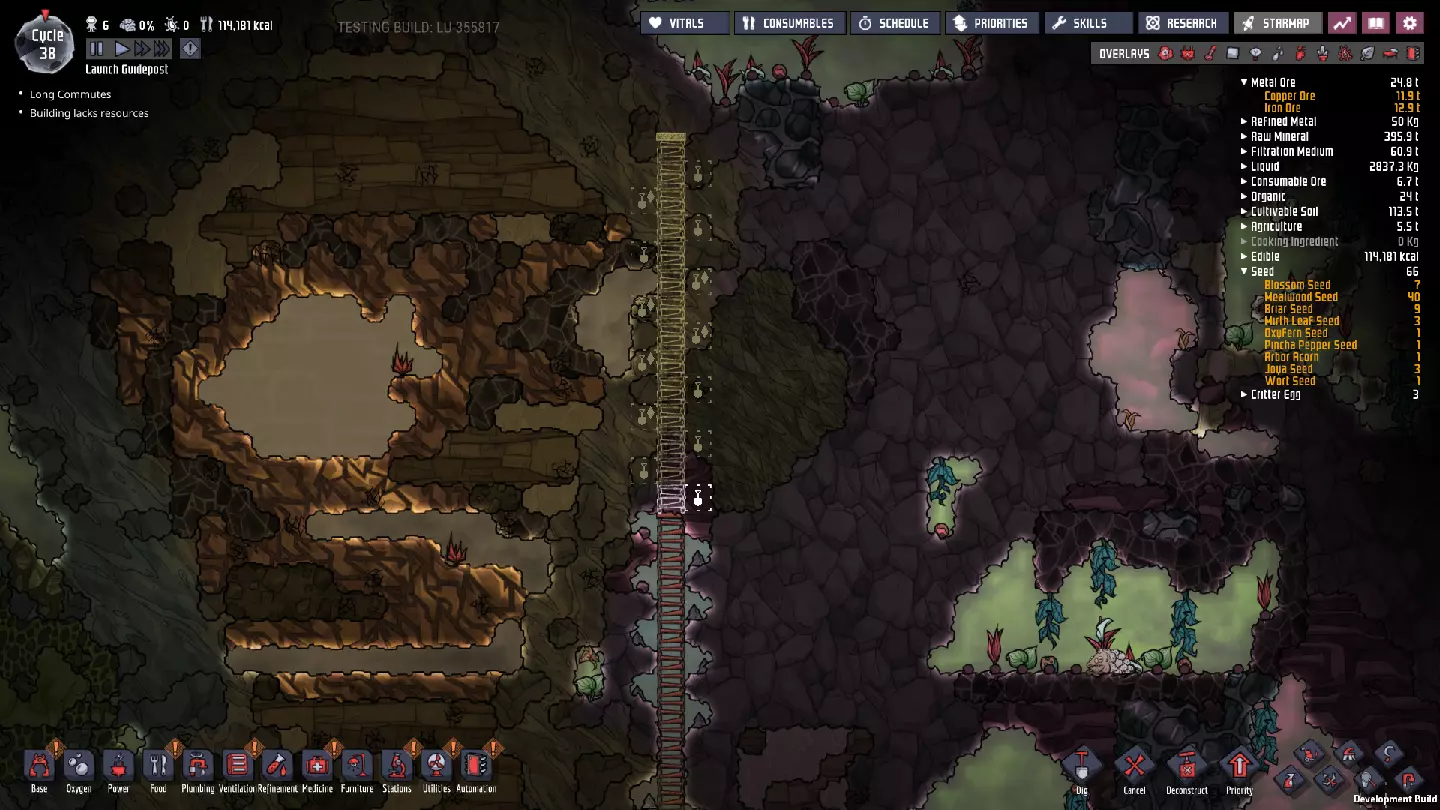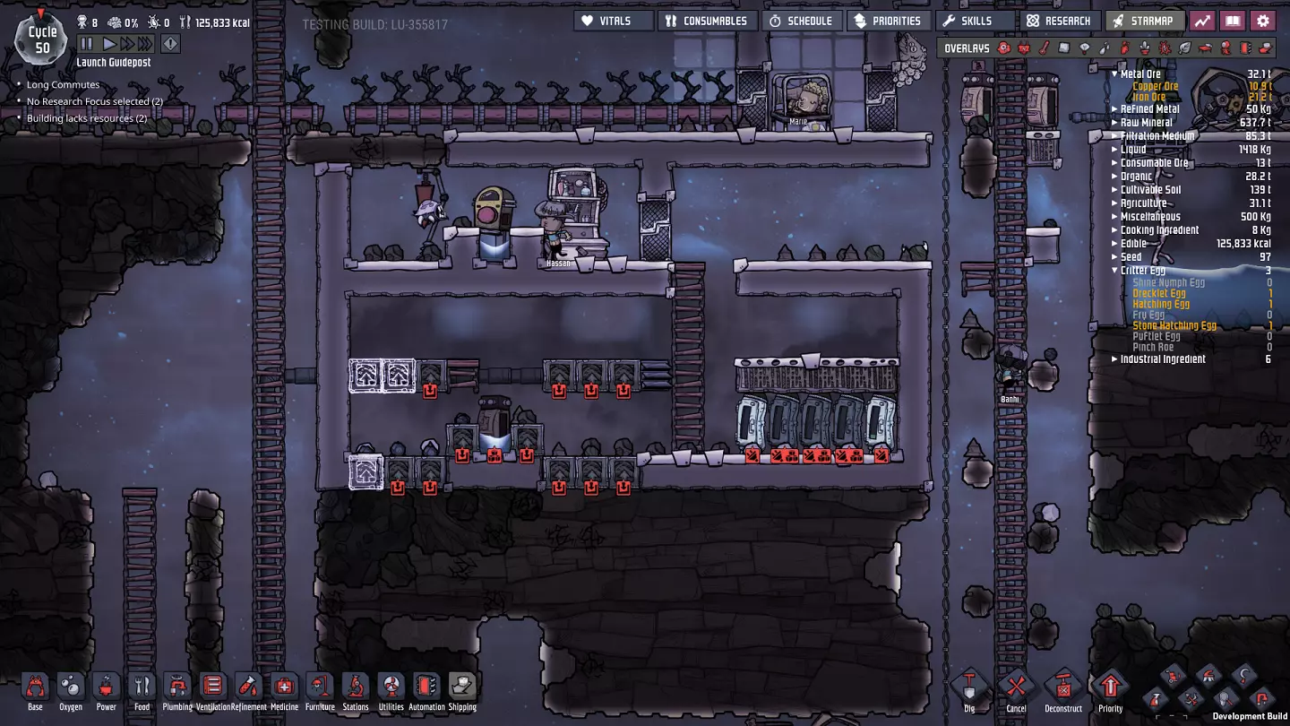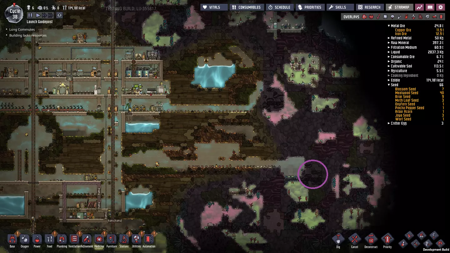 这是一份《缺氧》正式版的中期游戏指南。本指南旨在教授玩家从第50周期到第250周期乃至更后期所需的思路与策略。不过,部分后期内容仍基于早已过时的“火箭科技升级”版本。 换句话说,本指南侧重于如何从利用初始资源满足基本需求,过渡到应对长期问题、近乎完全稳定殖民地,并提升基地的各项能力。### 简介 本指南假设你已熟悉处理我称之为“早期游戏”基地所面临的以下问题: - 二氧化碳 - 食物 - 卫生/管道系统 - 氧气(来自藻类) - 发电(基础,来自煤炭) - 士气管理 如果其中任何一项对你来说仍然是主要问题,建议先阅读我的早期游戏指南,然后再继续: https://steamcommunity.com/sharedfiles/filedetails/?id=1359110726 如果你希望使用我所基于的世界生成种子,但又想忽略早期游戏指南,我在“Terra”星球上使用的世界生成种子是2500。这些策略并不特定于某个种子,但我认识到在跟随指南学习时,使用相同种子会很有帮助。话虽如此,部分策略仅适用于特定类型的地图——请注意,本指南将重点介绍“Terra”(泰拉)地图类型。我会尽量为其他类型的地图种子提供指导性说明,但主要还是聚焦于“Terra”地图,因为本指南旨在帮助新手学习游戏,而“Terra”地图最适合这一目的。 我会避免依赖随机生成的“隐藏间歇泉”的策略,因为并非所有地图种子都包含特定类型的间歇泉。我也会忽略打印舱的“奖励物品”,因为这些同样具有很大的随机性。 中期游戏的开始 在继续之前,先介绍一下我将以此为起点的基地情况: