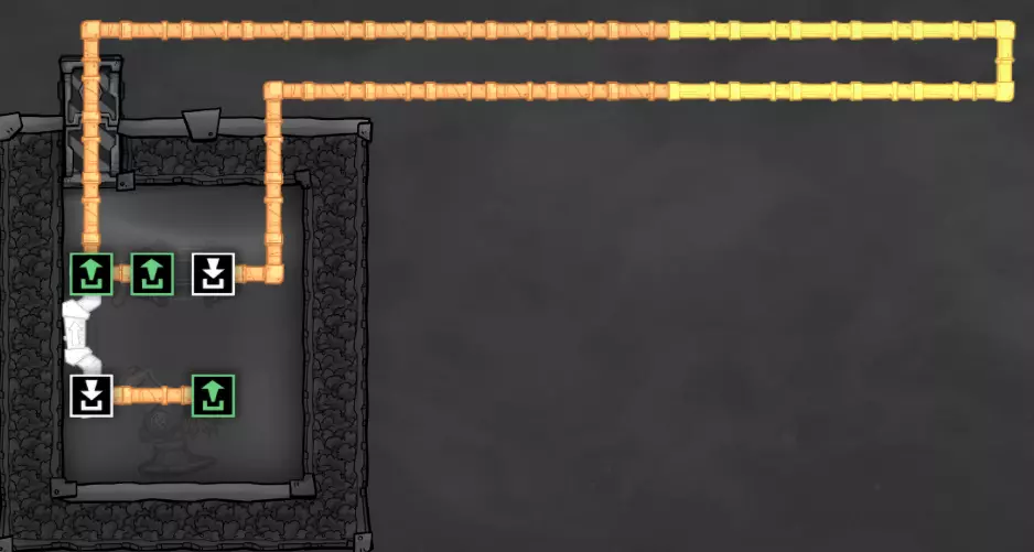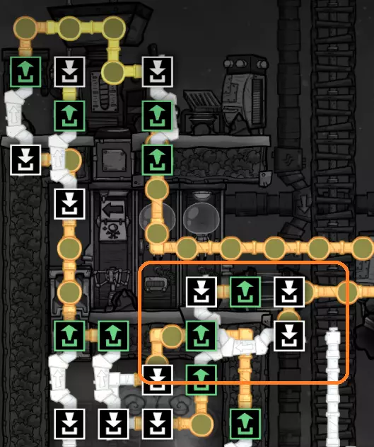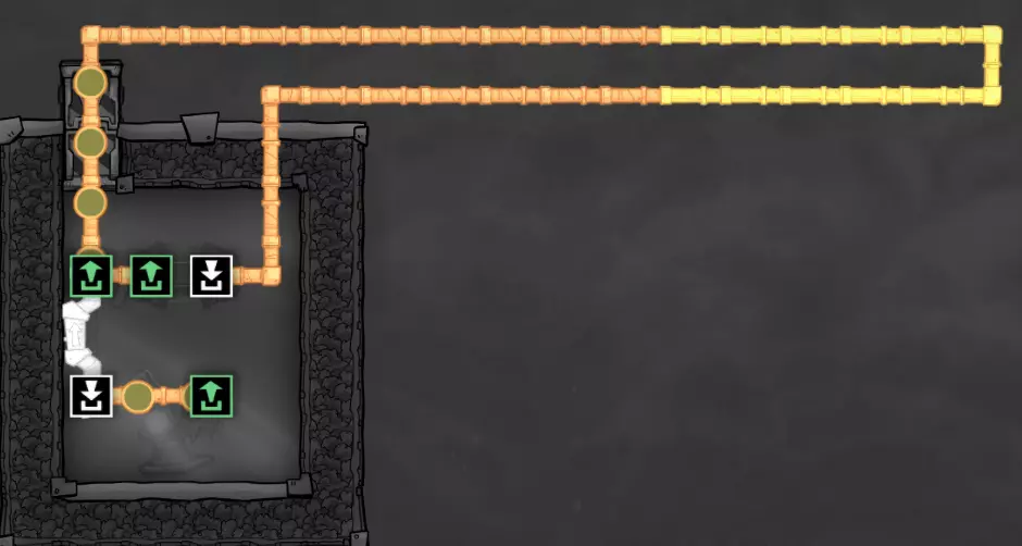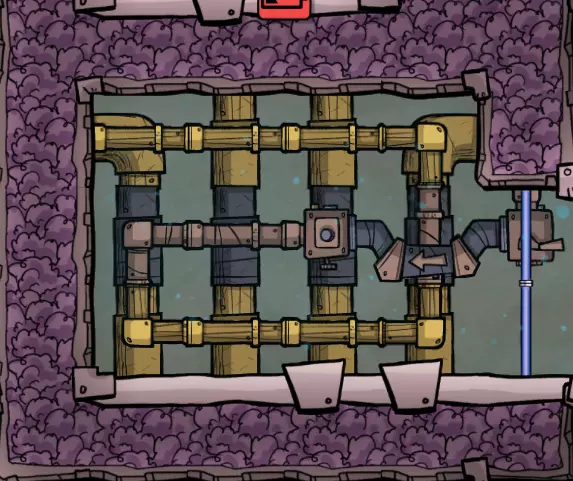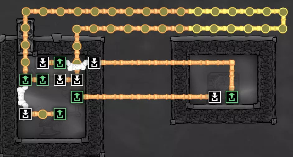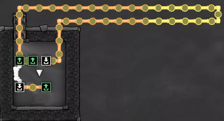 你可能已经注意到,我对通往原始沼泽生态区的入口进行了调整。 虽然我修改了主通道,但请注意,我对地形进行了仔细处理,因此任何史莱姆仍然只能通过矿石洗涤器获取——右侧的所有史莱姆都已被开采完毕。通往冰冻生态区入口处的瓷砖墙有三格高,无法通行。这使我能够安全地延伸中央通道的梯子,以连接冰冻生态区的入口。 请记住: - 复制人只能跳过一格宽的间隙。同时存在一格的高度差是没问题的。 - 复制人只能跳上两格高的墙,无法跳上三格高的墙。 利用这些特性,你可以将此类区域逐步整合到你的主基地基础设施中。【原理】关于冷却循环 在本节中,我们将暂停片刻,探讨游戏中管道系统的一些重要细节,以及如何利用这些细节来为我们服务。通过有选择地建造设施和规划管道布局,我们可以控制液体在系统或结构中的流动方式。这些特性使我们能够创建用于冷却的“循环”——我们将在接下来的几节中介绍其中的几种。 目前无需担心建造你所看到的内容;在进行实际建造之前,我会先使用一点沙盒模式进行演示。 基本循环 让我们从下面这个结构开始:
