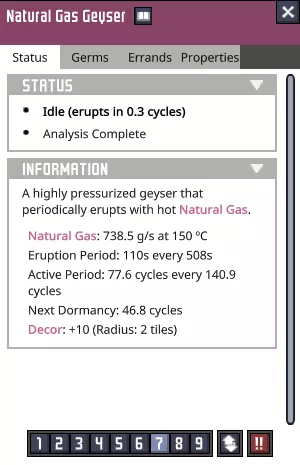我已经添加了足够的导电线路和气体管道,以便将来将气室与外界连接。大气传感器应设置为>500克压力以进行常规运行——这将确保我们在此处的电力消耗达到最高效率。当然,也可以随意清扫这里的任何关键资源——大量的藻类和金汞齐绝对值得保留。 材料清单: - 导电线路、自动化线路——铅 - 大气传感器——铅(不会过热) - 气体泵——钢 - 气体管道(内部)——任何材料 - 隔热瓷砖——火成岩 喷口统计数据 为了突出另一个社区资源,你也可以使用像《缺氧》数据库[oni-db.com]这样的网站,该网站提供了大量参考资料,并展示了各种资源之间的联系。该网站还提供了一个间歇泉计算器,不过对于特定间歇泉的具体数据计算,它的详细程度稍逊一筹。 事实证明,这个间歇泉在一个完整的活跃/休眠周期内,平均净输出天然气为88克/秒,略低于驱动一台天然气发电机满负荷运行所需的量。这已经很不错了! 只要稍加小心和准备,我们现在就可以完全封闭这个天然气间歇泉,将其热量永久隔绝。被封存在里面的少量资源,完全值得付出这样的代价。