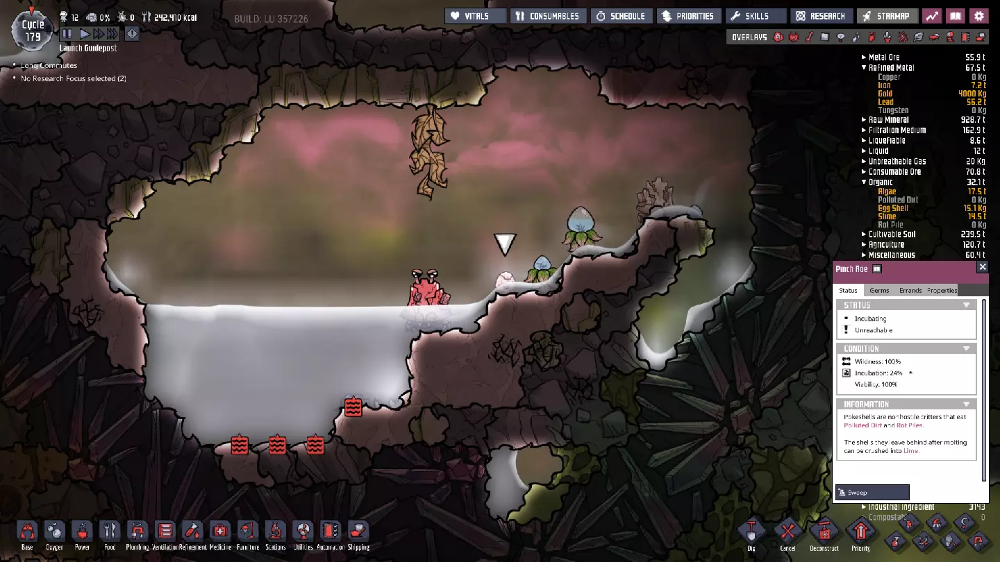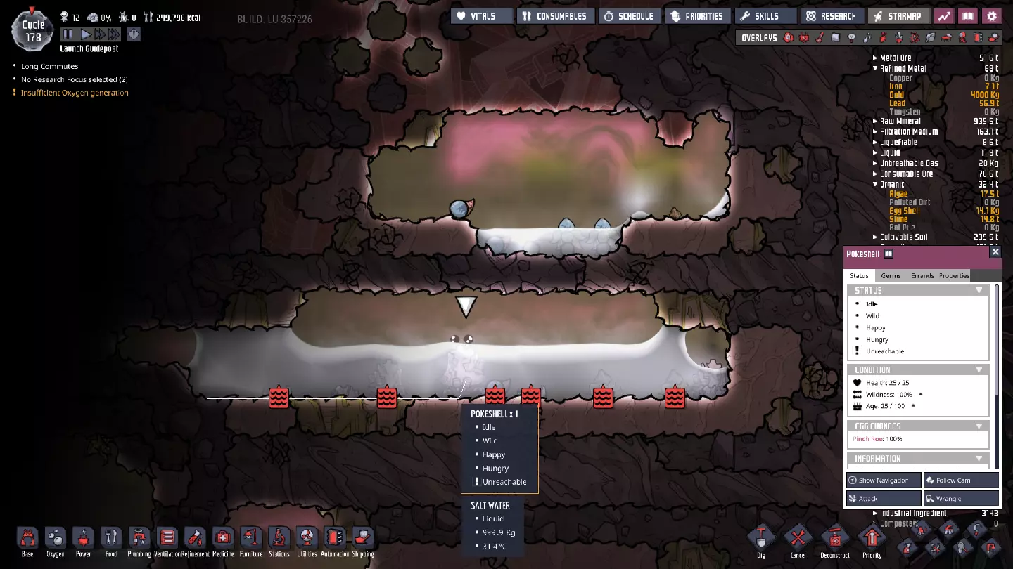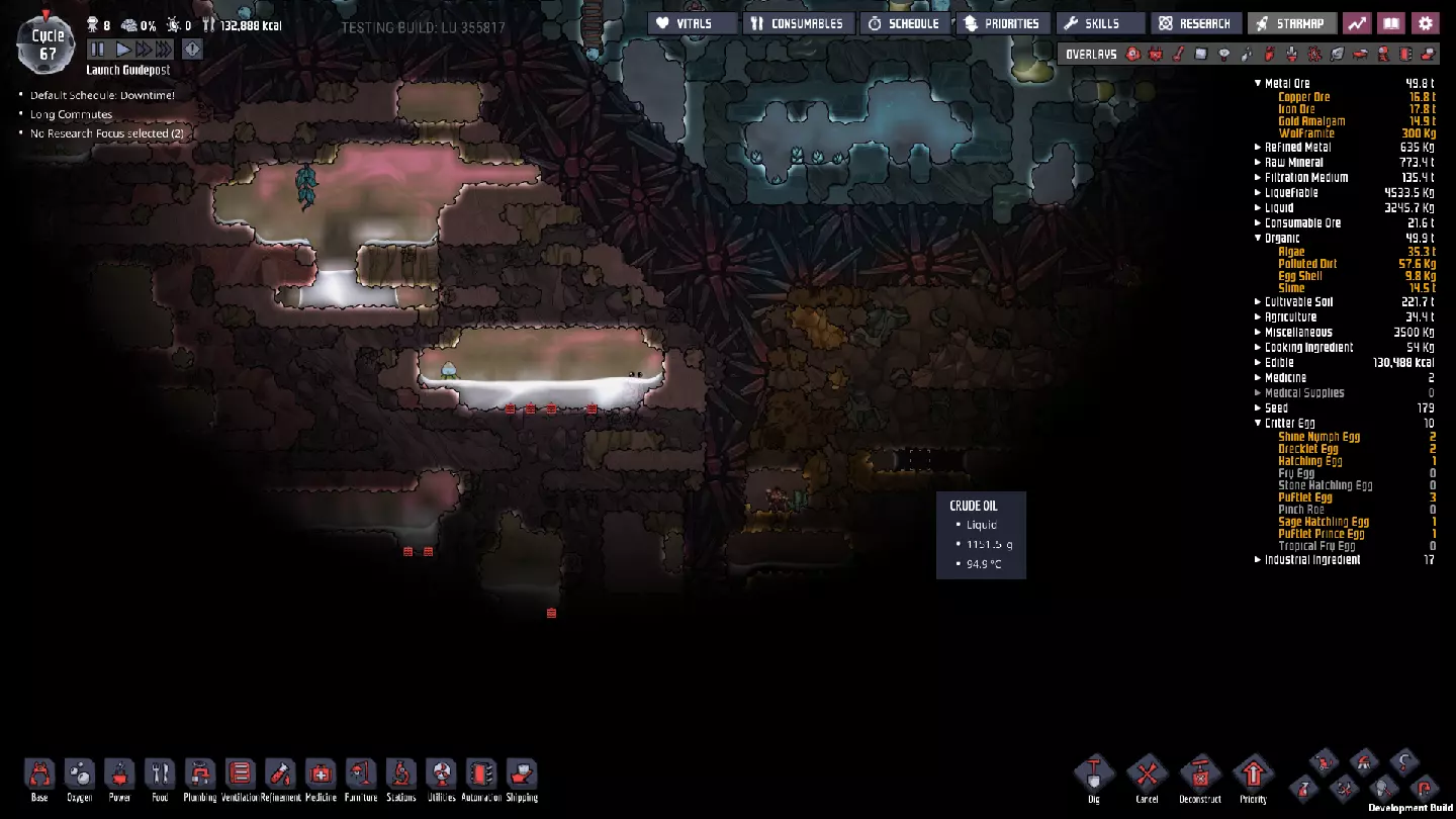 为方便起见,我选择了一块常压原油瓷砖,与光标附近的原油囊进行对比。默认情况下,原油的理想压力为800千克/格,但有时你会发现那里的原油囊压力达到或超过3000千克/格。当你打开该区域时,原油会迅速膨胀,直至达到其理想压力——在打开之前,确保你已为原油提供了足够的填充空间! 当前,我们要在下方寻找两种特定资源,不久之后还会寻找另外两种: - **化石**对制造钢材极为有用——务必尽可能多地开采,因为我们很快就要开始精炼钢材了!这里的铅储量丰富,对于铺设导电线路非常有用,这种线路的过载阈值是普通线路的两倍。它将帮助我们显著改造现有的基础设施。 第三种资源是钻石,它是一种极其出色的热导体。在不久的将来,我们会需要它来实现这些用途。 第四种资源就是原油本身,它能承受相对较高的温度并保持液态。它还可以转化为石油,但我们要在很久以后才会考虑这个功能。 确保找到大量的每种资源。你可能需要在一个既不怕热又容易到达的地方为其中一些资源设置储物箱——我也把这些箱子放在了冷却液池附近。这样一来,你的存储复制人(Storage Dupes)会缓慢地将材料运送到更近的地方,从而缩短不久后可能需要进行的物资补给行程。 我们在这里可能会发现的最后一样东西,但需要暂时留在下方的,是新生物——滑鳞蜥(Slickster)。它们非常适合处理二氧化碳积聚问题,但目前我们需要将它们留在石油 biome(原词)中,这样它们的幼崽才会是同一类型。我们不想要那种消耗氧气的品种,如果把它们带入基地,就会得到那种类型。此外,由于它们以二氧化碳为食,如果它们吃了足够多的二氧化碳,未来我们清理孢子兰(Sporechids)时就会更安全。 其他特性 虽然我们在很长一段时间内都不会用到这些,但你也应该留意石油储层(Oil Reservoirs)。这些地点未来可以建造油井,以消耗水资源为代价生产可再生原油。每个世界至少有3个这样的地点。 天然气间歇泉捕获 在处理上一部分内容时——实际上是在相当早期——我的天然气间歇泉进入了休眠状态。看来是时候进行新一轮的间歇泉捕获了! 和往常一样,首先要考虑的问题是如何正确接近该地貌特征。事实证明,天然气是游戏中第二重的气体,仅次于二氧化碳。氧气和其他气体会停留在上方。我们的复制人喜欢氧气……所以从上方进入是正确的方法。 对于我的天然气间歇泉和游戏流程,我选择这样处理: