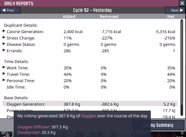 《缺氧》是一款2D游戏,而非1D——我们需要为电力线路等设施规划良好的路径,确保其在水平和垂直方向上都能顺畅铺设。这部分将作为原始通道的分支,能够延伸至其他区域。值得注意的是,大型电力变压器在水平布局中比垂直布局更适配。 当然,我们还需要解决另一个问题——所有计划建造的设施都将占用大量空间。还记得我们当初选择腐蚀性生物群系的原因吗?就是因为它能提供开阔的空间供我们使用。现在正是发挥其作用的时候。不过,旧的沼泽生物群系也有相当大的空间——短期内这两个区域应该能满足我们的需求。话虽如此,更彻底地开采它们将是一个相当不错的主意,也是近期的一个闲置任务。 **整体情况** 你可能还记得在本指南开头的“中期游戏的开始”部分,我提到了我们在中期游戏中将要面临的一些总体问题。特别是,随着游戏的进行,我们需要从使用藻类转向使用水来生产氧气,并且我们将开始不得不关注热量问题。 如果你一直在关注你的藻类水平,你可能已经注意到你的库存随着时间发生了一些显著的变化。泰拉星相当慷慨,所以我们还有时间,但目前我们不能在藻类开采上太偷懒。殖民地的复制人越多,情况就会越困难,所以不要急于招募太多复制人——在找到替代解决方案之前,尽量将数量控制在10个左右。 你有偶尔查看每日报告吗?