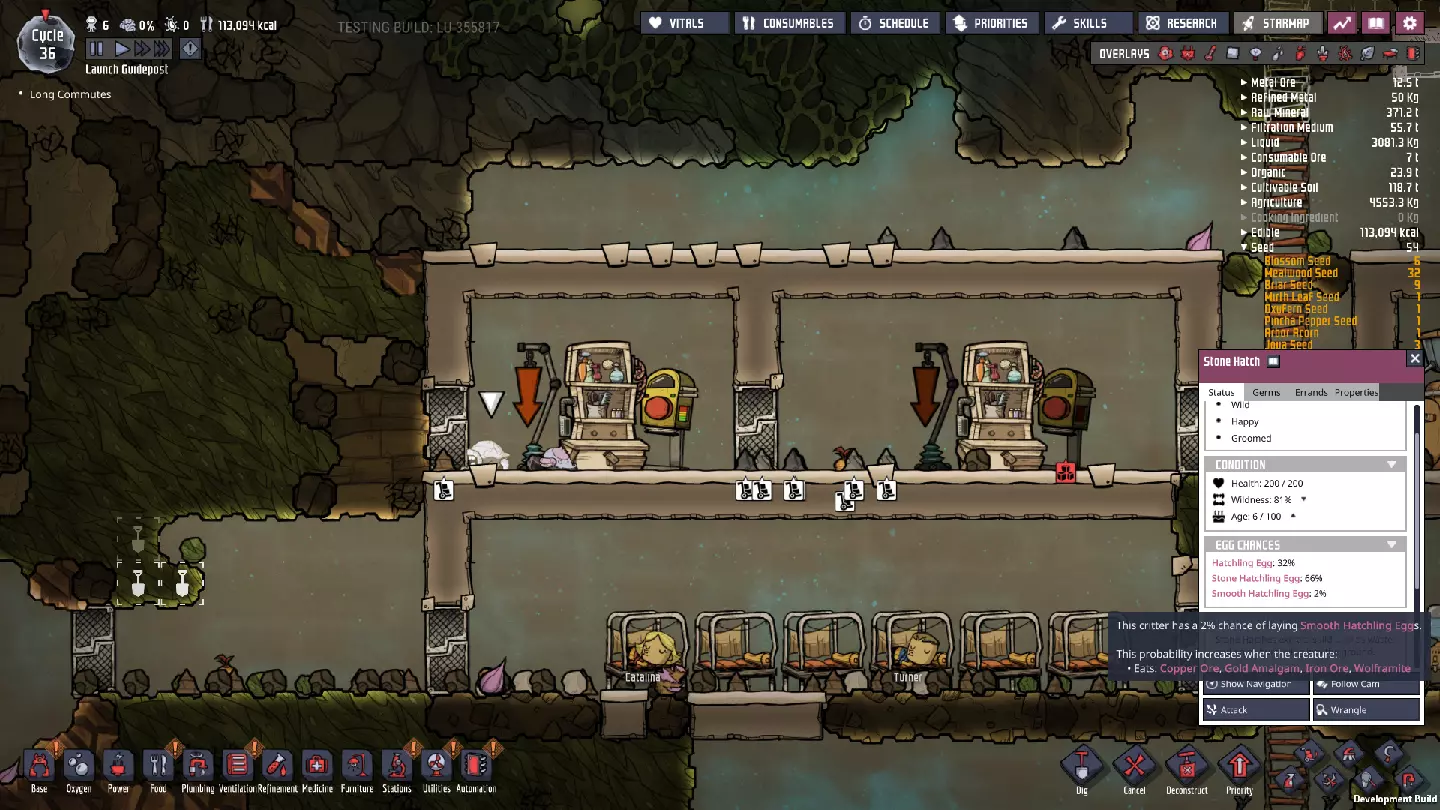 培育光滑幼崽 虽然你现在可能还无法做到,但我想现在就谈谈下一步。注意上图中突出显示的细节——石壳幼崽只有2%的几率产下光滑幼崽蛋。要提高这个几率,我们需要给它们喂食某种金属矿石。 一旦你拥有了第一只幼年石壳生物(或其蛋),将其捕捉(或通过储物箱放置)到右侧房间。对于这个生物投放点,我建议储存铁矿石——因为这和你拥有光滑生物后将要喂给它们的食物相同。铁的高效精炼成本比大多数其他金属要高一些,所以我建议在可能的情况下,现在所有精炼铁都通过光滑生物来获取。右侧房间最多可容纳3个哈奇,建议不要超过此数量。 细节:需要注意的是,为了让哈奇感到舒适,每个哈奇在房间内需要12格的开放空间。 为何如此设置?我们对这两个房间的长期目标是促进光滑哈奇的繁殖,这需要相当大的投入,但回报也相当可观。如果你用过岩石造粒机,就会发现它每秒需要240瓦的电力,而且还会损失50%的材料。相比之下,光滑哈奇不产生热量,不需要电力,还能产出可作为食物的蛋——这可是三赢!唯一的缺点是它们需要投入精力,因为它们只吃生金属,而且在进食时会有25%的质量损失。它们非常适合早期、低影响的金属精炼。 在此过程中,我们还会培育出石制哈奇。这些哈奇能将大多数岩石类型转化为煤炭,而标准哈奇无法做到这一点。随着你在游戏中的探索,最终会积累大量开采的火成岩和花岗岩,更不用说其他岩石类型了。我们不妨在处理其他问题的同时,用其中一些来获取(煤炭)能源。 需要注意的是,每种哈奇在幼年时,产下自身类型蛋的概率非常高。通常需要大约20个周期的繁殖过程,你才有较大机会获得不同类型的蛋,而且这还是在你积极培育新品种的情况下。关于蛋: 如果你希望复制人挑选特定的蛋放入碎蛋器,可以对该蛋使用清扫(“将杂物移至储存处”)指令,并将其任务优先级设为5以上——7或8这样的数值效果不错。虽然偶尔还是会拿错蛋,但对我来说这种方法的成功率约为95%,能让该蛋成为更高优先级的任务目标。 其他注意事项: 成功孵化出第三枚光滑哈奇蛋后,就可以把产下这枚蛋的石哈奇从围栏中移到有沉积岩的围栏里。它不再需要吃金属了。可以通过生物投放点的设置来实现这一点——被捕捉的生物会自动被送到优先级最高且能容纳它们的牧场(或露天生物投放点)。同时,我强烈建议建造一个标准的哈奇(Hatch)牧场——你将长期拥有大量砂岩,不妨也从中获取额外的煤炭和蛋。当你需要腾出空间来安置食金属的石哈奇(Stone Hatch)时,这里也能作为驱逐普通哈奇的地方。 另外,我在洗手间顶部和新哈奇围栏下方留出空隙是有原因的。我们很快会在那里建造一个设施(一间医务室),它可以连接到洗手间的管道回路。