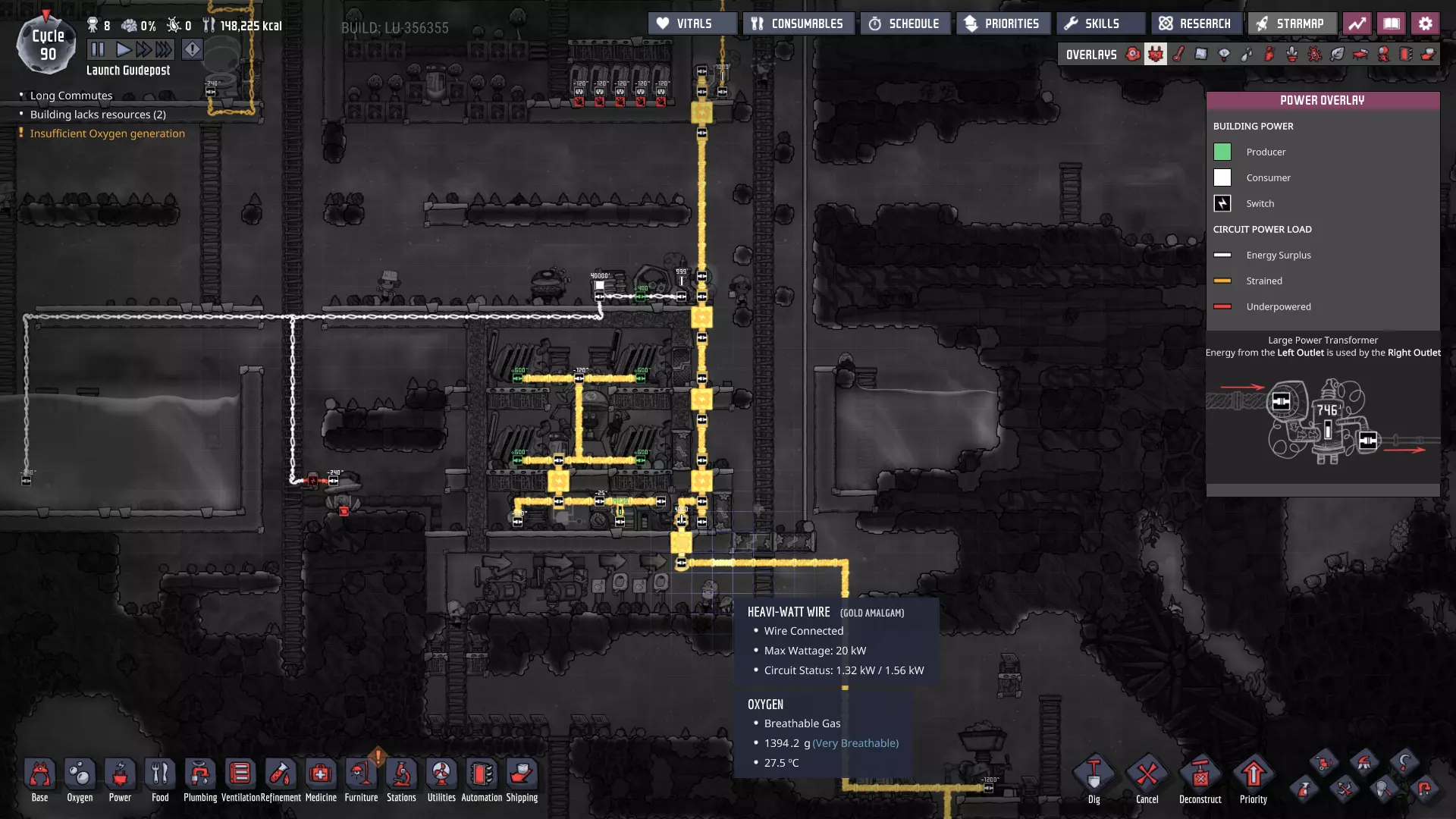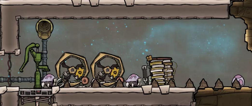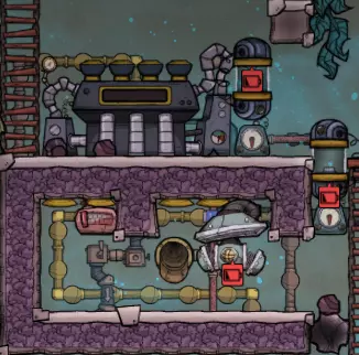 一旦我们准备好供水并铺设好燃气管线,就基本可以开始运行了!注意热交换器上方新增的氢气发电机和智能电池——它们是相互连接的。泵室顶部的燃气管出口与新发电机相连,当达到平衡状态时,我们多余的氢气足以完全为冷却系统供能! 建议在主通道中将氧气管道铺设在高压电线的上方。SPOM(自循环氧气模块)会输出温度相当低的氧气,这有助于对任何与输出管道重叠的电力变压器进行被动冷却。 别忘了通过热交换器向冷却液管线中添加新的污染水——我们需要用它来实际冷却物品。目前我们尚未完成冷却液系统,所以要确保能在下一步轻松扩展它。当冷却液充分冷却后,断开新的(小型)电力变压器,并启动新SPOM的泵室: - 氢气浸没式气压传感器 - 高于600克 - 成对左侧气压传感器(控制电解器) - 低于800克 - 连接的缓冲门 - 10秒。这将防止电解器停止运行,除非检测到大量氧气积压;在积压清除前,我们应停止继续生产。 - 这有助于确保被动式氢气过滤器不会失效。 - 右侧气压传感器(控制氧气泵) - 高于400克 一般说明: 此SPOM在当前状态下,可产生足够16名复制人使用的氧气,且温度较低。只要我们有足够的水,氧气问题就解决了!现在我们应该在已经开始输送氧气的区域关闭所有旧的氧气扩散器。 我们再次进入倒计时阶段——必须完成蒸汽轮机部分,才能真正结束这里的工作。 如果遇到原油无法流动的问题,可以使用管道工移除一部分原油。 **长期供氧(SPOM - 第二步)** 既然SPOM的氧气生成部分已经完成,最困难的阶段终于结束了。我们的氧气生产不会产生太多热量,因此有充足的时间来完成计划在现有氢气发电机上方建造的蒸汽轮机部分。 话虽如此……未来的蒸汽室内可能存在暴露的加热回路——我们现在就来解决这个问题,尤其是如果我们想跳过准备太空服的步骤的话。这不会花费我们太多时间。首先,我们需要在封闭密室前达到这种状态: