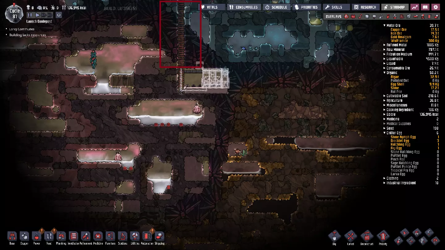 虽然过程并非一帆风顺,但这种方法能让我们避免释放大量可能破坏基地大气的气体,同时还能探索更多地图区域。目前,请尽量避免打开含有异常大气的气穴,也不要开采任何史莱姆方块。稍后我们会讨论如何处理这些情况。 垂直挖掘时,通常采用以下方法最为合适:
