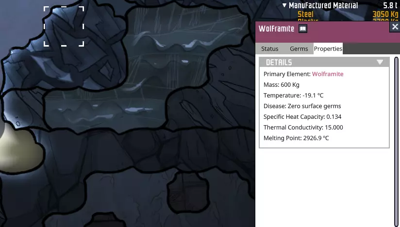 这些植物在被驯化后,能够将1千克当地大气中的气体冷却-5°C。将其放置在氢气环境中可使冷却效果最大化,此时它们的冷却速率为12千DTU/秒;而在氧气环境中,冷却速率约为5千DTU/秒,这一数值也相当可观。例如,在氧气环境中放置两株这样的植物,就能完全抵消一台持续运行的天然气发电机所散发的热量。 鉴于其强大的冷却能力,这些植物完全可以作为氧气冷却系统的一部分。我在以下指南的“经典SPOM”部分中,详细介绍了一种此类解决方案: https://steamcommunity.com/sharedfiles/filedetails/?id=1359728437 这种方案更为简单,且可以在游戏更早阶段建造。但由于蒸汽轮机装置对于游戏后期的诸多操作至关重要,因此在本指南中我并未采用该方案。此外,并非所有世界类型都存在冰冻 biome 和 Wheezeworts(冰原麦)——我们所采用的解决方案无需依赖它们即可建造,这对那些世界而言相当重要。不过,我们现在处于 Terra(类地行星),所以这些资源都是可用的——如果基地某个区域开始变热,你可以在基地内随意使用它们! 在像 Terra 这样没有铝的地图上,导电性最佳的基础金属矿石是钨锰铁矿(Wolframite),它可以在冰冻 biome 中找到。