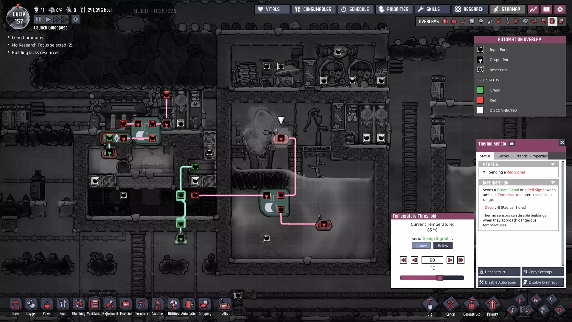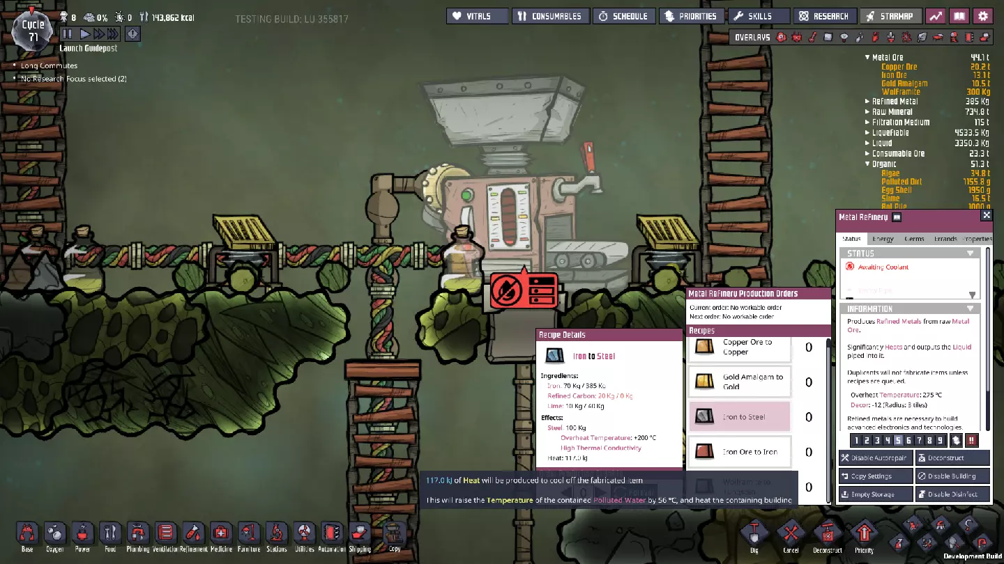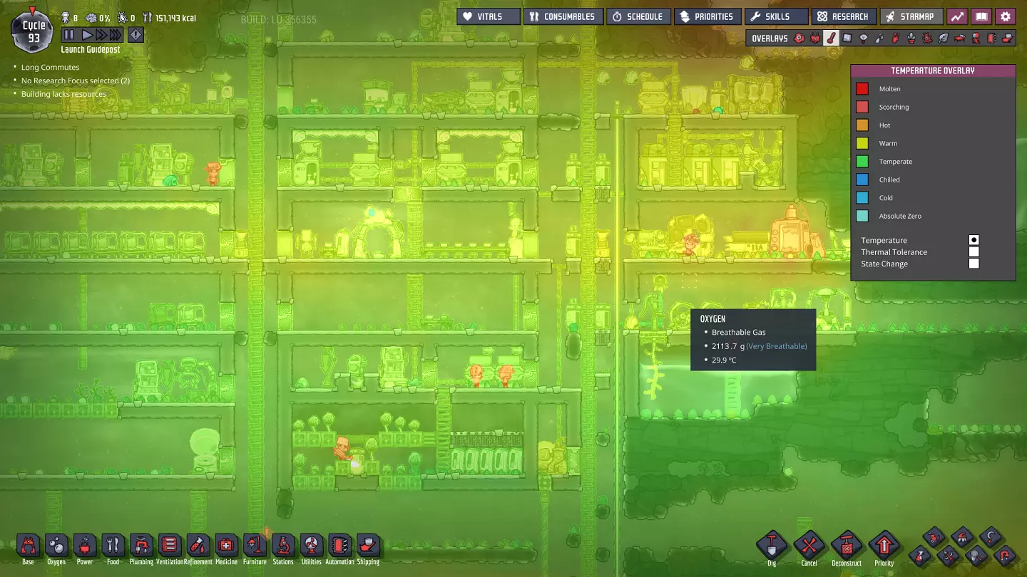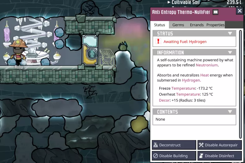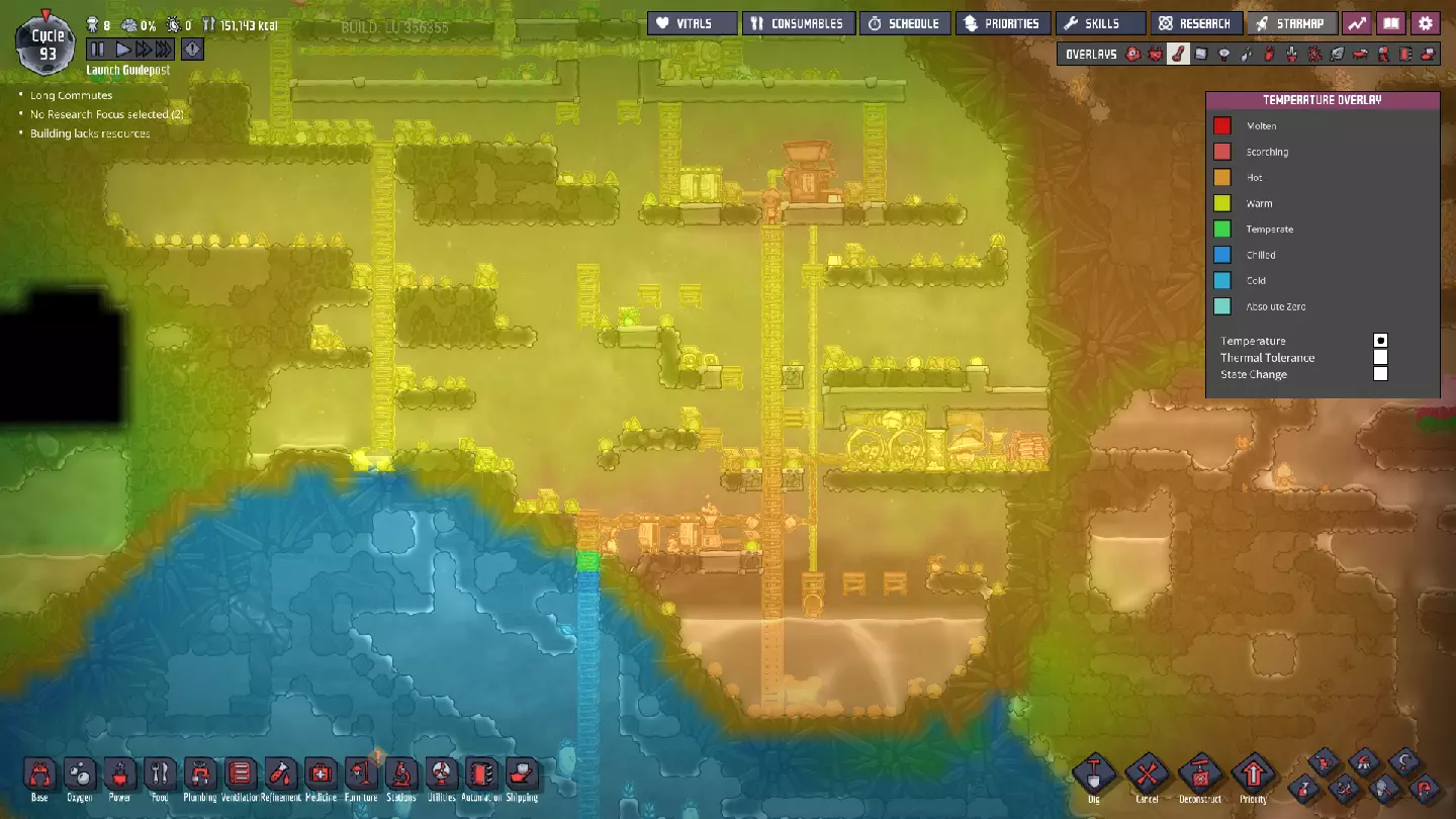 我们的工作站开始有点热了。当然,部分原因是我们开始用热水进行研究。随着我们继续添加电力变压器并在基地内使用更多机器,这种情况只会加剧——但这实际上是我们想要的,因为一些机器(比如点唱机)可以显著提升复制人(Dupe)的士气,让我们获得更多技能。最终,我们需要想办法解决热量问题。