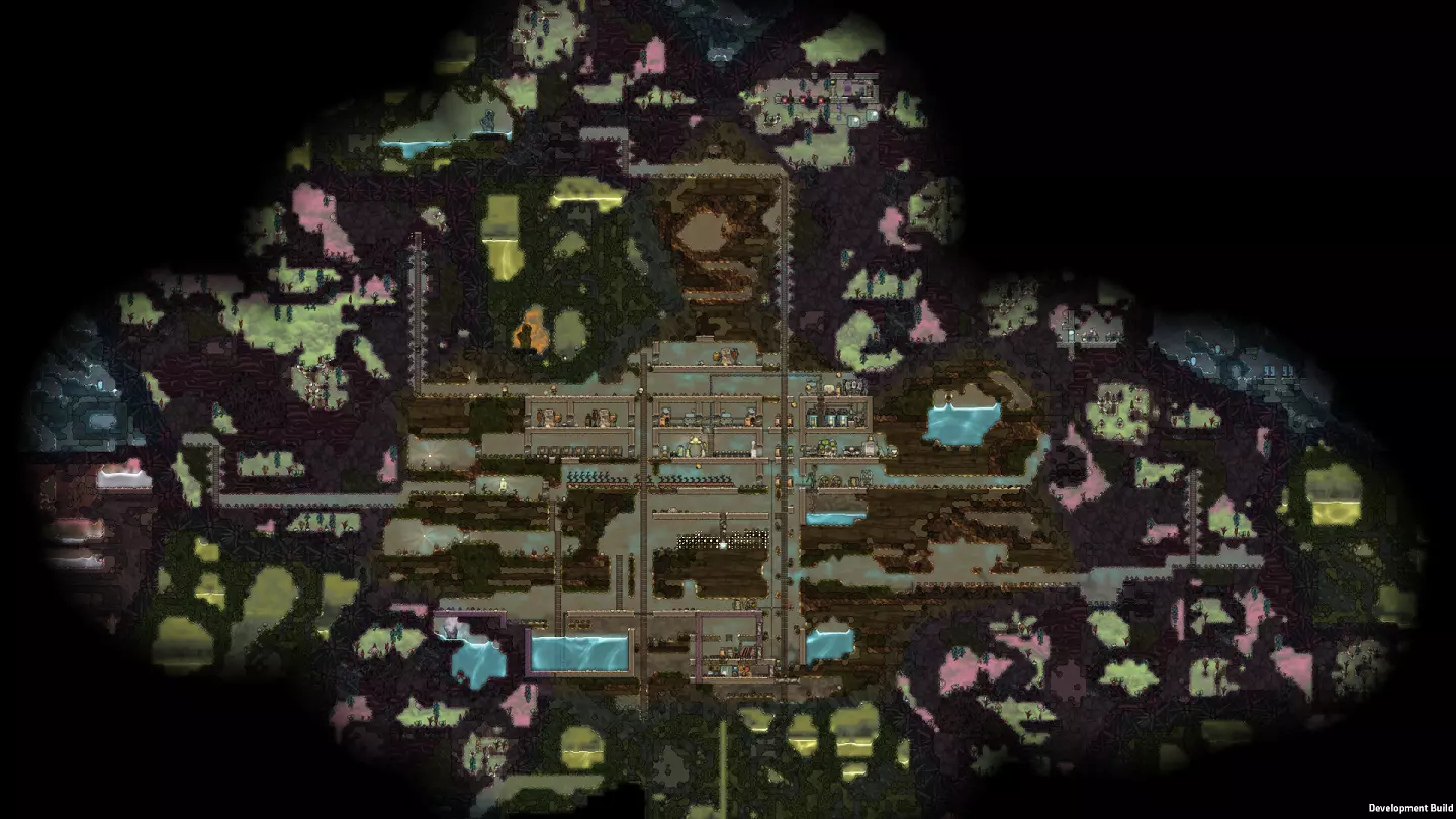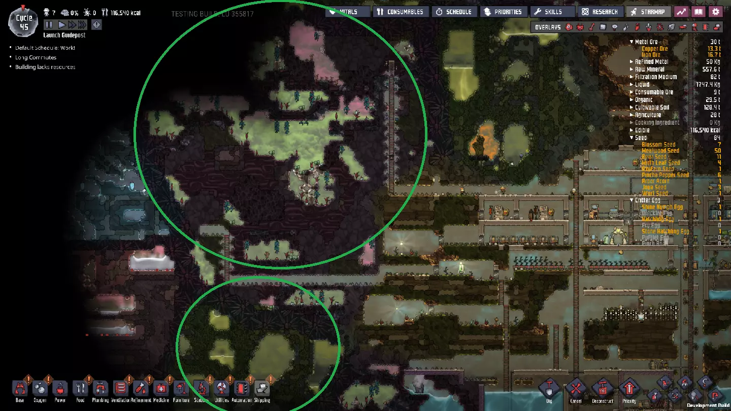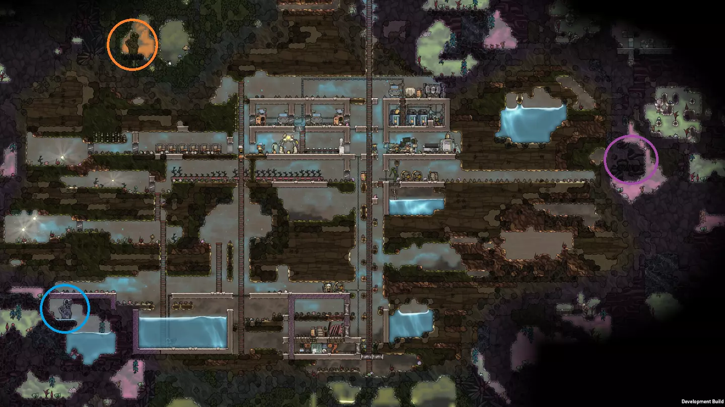 左上角那个巨大的圆形区域是腐蚀性生态群系,其资源正适合采集。图片中它们看起来有点小,但在那个主要充满氯气的大空间里有三只野生 drecko( drecko)。在那个大空间下方有相当多的漂白石,空间内还有一些 balm lily( balm lily),它们已经掉落了一些花朵——这是我们制药所需的部分。 该区域还与我们之前讨论过的两个蒸汽喷口和天然气喷泉位于同一侧。清理该区域将更好地为我们日后利用这些地貌特征做好准备。因此,我们的下一个目标是:突破这个腐蚀性生态群系。 从腐蚀性到沼泽:之后,我们要将目光投向一些沼泽生态群系。虽然由于细菌的存在,这些区域可能具有危险性,但在掌握腐蚀性生物群系后,我们将拥有应对工具。 这里可以找到黄昏帽植物及其种子——真菌孢子。它们是比食用木更高效的种植作物! 这里有大量的史莱姆。这才是真正的危险……但它可以用来种植黄昏帽。它还有其他一些不错的用途,最终我们需要清除大量的史莱姆。 这里通常有大量的污染氧气——将其通过除臭器即可获得洁净空气! 那些巨大的污染水 pocket 非常有用。 它们是工业流程中很好的早期冷却剂——污染水的沸点比普通水更高,冰点比普通水更低!如果我们的水资源不足,可以通过净水筛处理污染水轻松获取更多水源——而且这些水袋默认处于非常适宜的温度。 最后但同样重要的是,这里能找到大量的金矿。通常来说,金是最容易提炼的金属,并且对各种任务都非常有用。