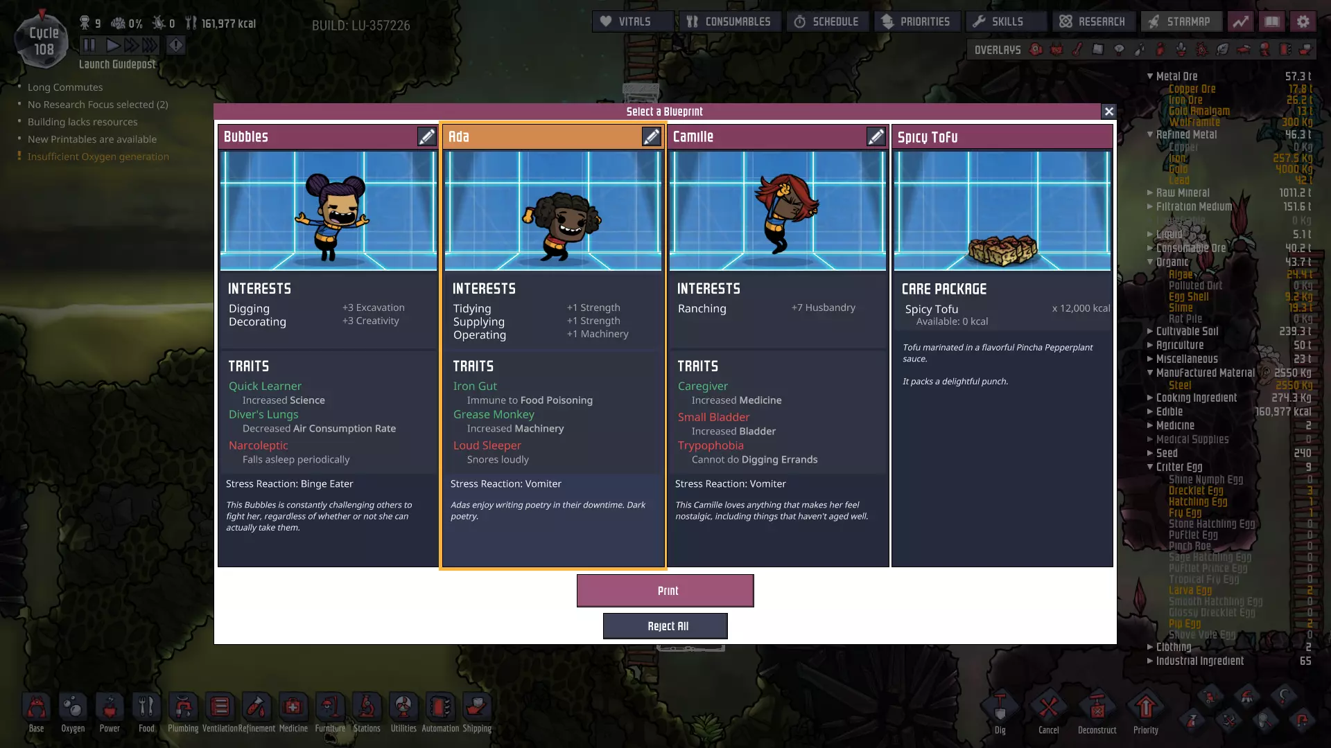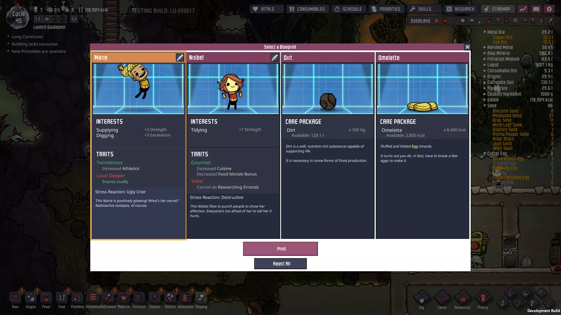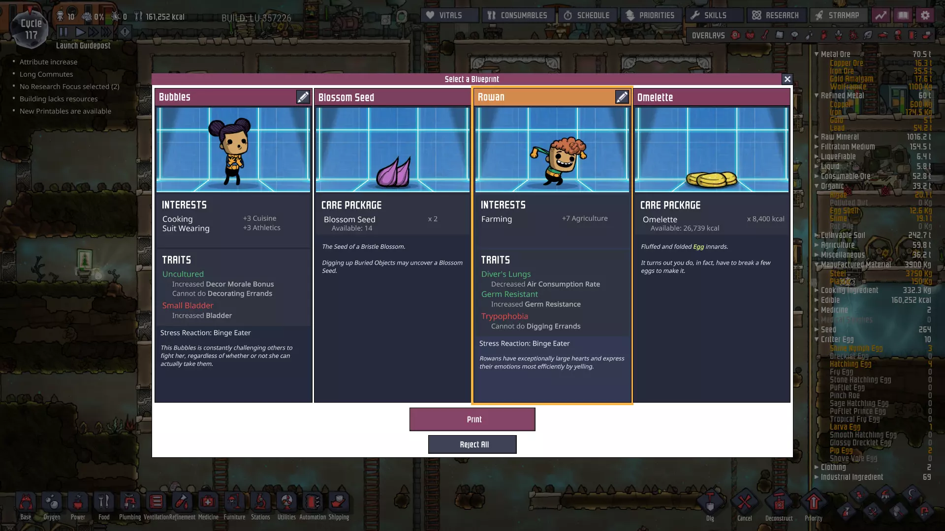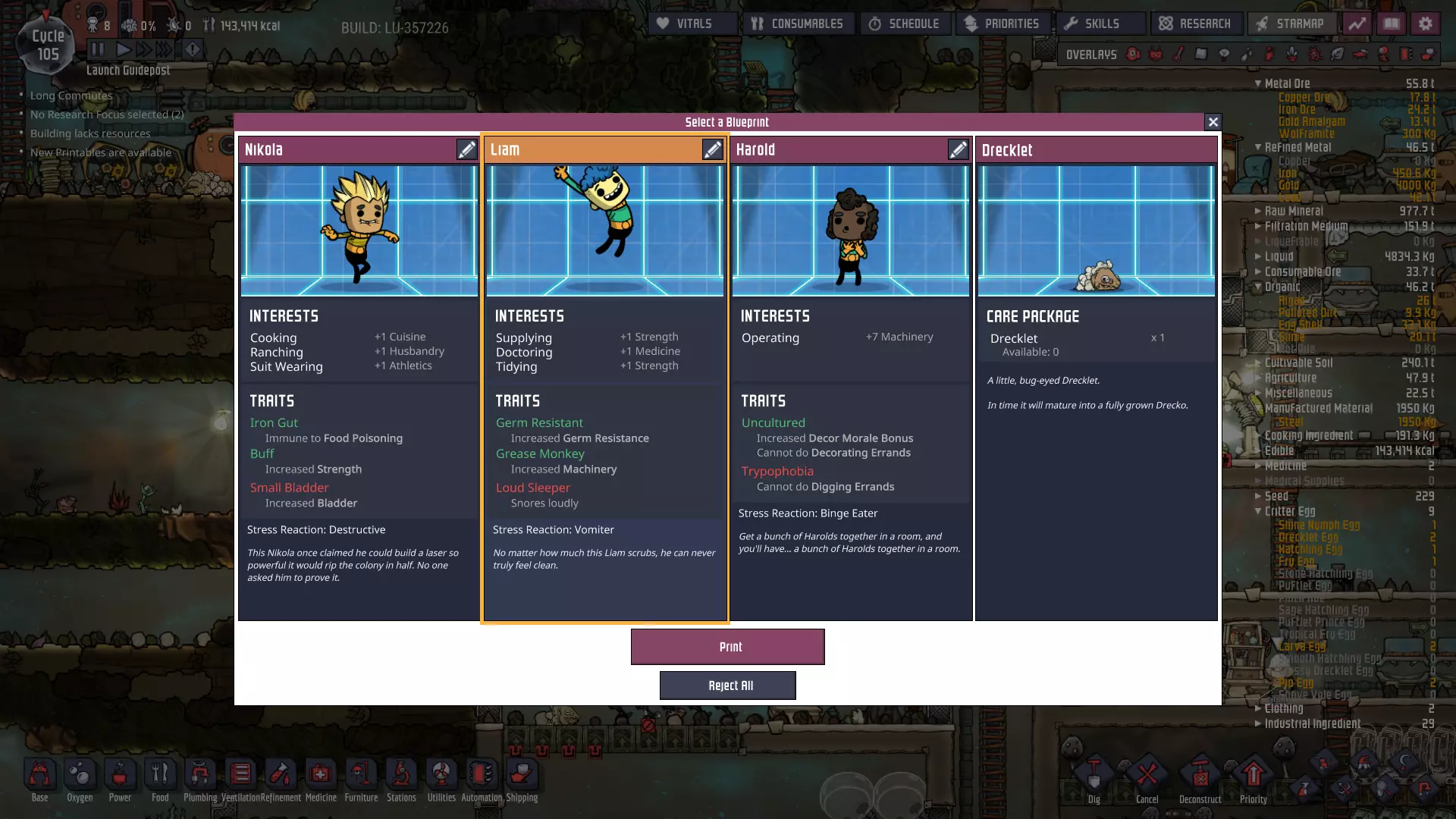 我们称这个区域为石油 biome。该区域为我们提供了大量宝贵的资源: - **铅**——一种天然存在的精炼金属!开采大量铅将有助于我们全面改造电力网络! - **原油**——可用于发电和高温液体设计,这种多用途资源有着各种各样的应用。 - **钻石**——在热传导应用方面具有极高的效能。 - **化石**——可粉碎以产出石灰,而石灰用于制造钢。而且那里有大量的化石! 凭借我们刚刚获得的工具以及到达石油 biome 后将获得的资源,我们将能够开始对基地进行适当的工业化改造。因此,为前往该区域做准备、付诸行动以及由此带来的升级,将是本指南下一阶段的重点。间歇泉捕获 你现在的游戏进程可能至少已经到了60至70周期。如果是这样,请留意你可能已经发现的任何**蒸汽喷口**和/或**天然气间歇泉**——它们很可能即将进入休眠期。一旦发生这种情况,请暂停手头的其他工作,尽可能立即开始捕获该间歇泉或喷口。 其他说明 自从上一节“基地规划”以来,我又获得了两名新的复制人。很抱歉忘记为第一个复制人截取打印舱界面的截图了!她对整理和太空服穿戴感兴趣。