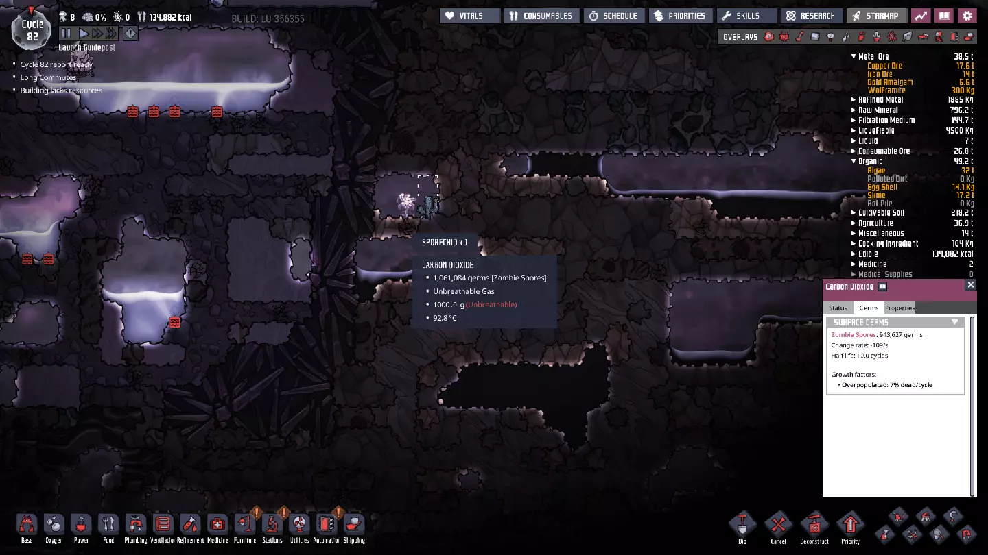 孢子兰或许拥有不错的装饰评分,但它们也是《缺氧》中最危险疾病的源头。在可能的情况下,应避开有孢子兰或其病菌的区域,因为它们会给你的复制人带来极其严重的负面效果。治疗这种疾病的药物需要(精炼)钨以及一种我们尚未开始养殖的生物的蛋——最好的“应对方法”就是干脆不要冒感染疾病的风险。病菌在二氧化碳中不会消亡,反而会在其中传播,而目前这里的二氧化碳含量相当丰富。