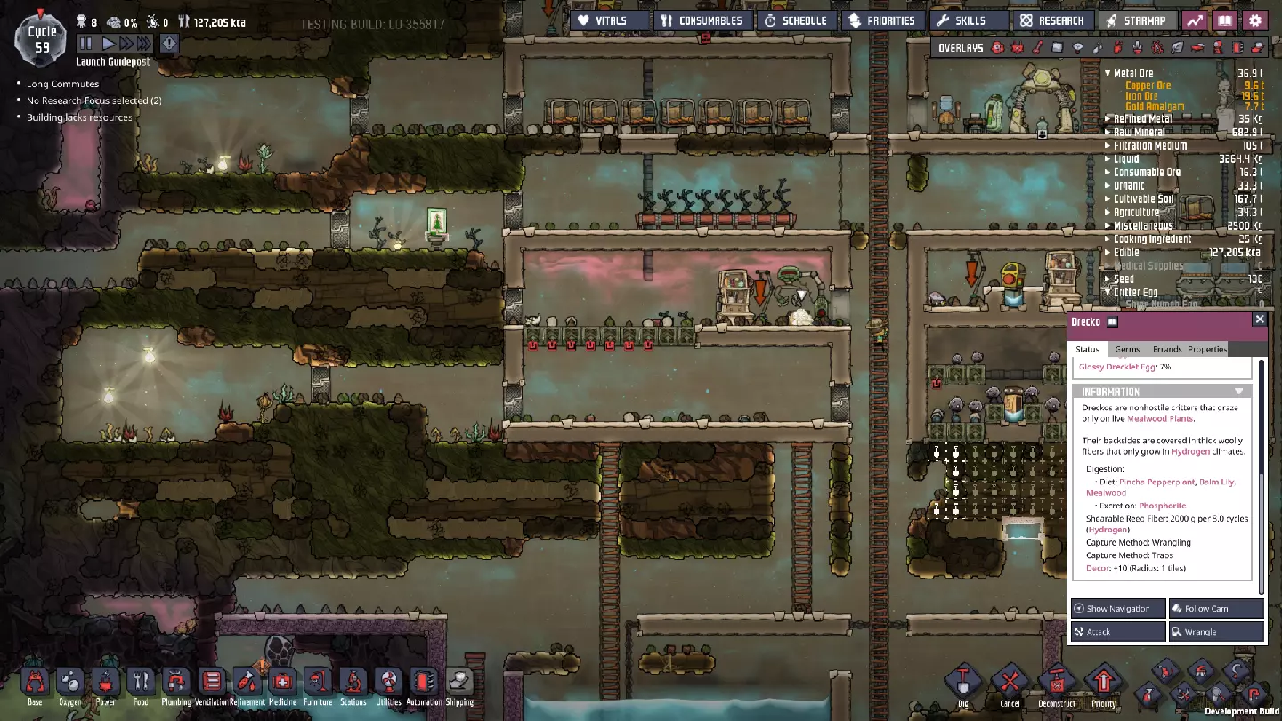 drecko 牧场 现在我们已经开放了腐蚀性生态群系,就能接触到一种新生物——drecko。它们的饮食习惯很特别:它们吃生长中的植物,而不是原始资源或收获的食物,但它们的产出却没那么有趣。