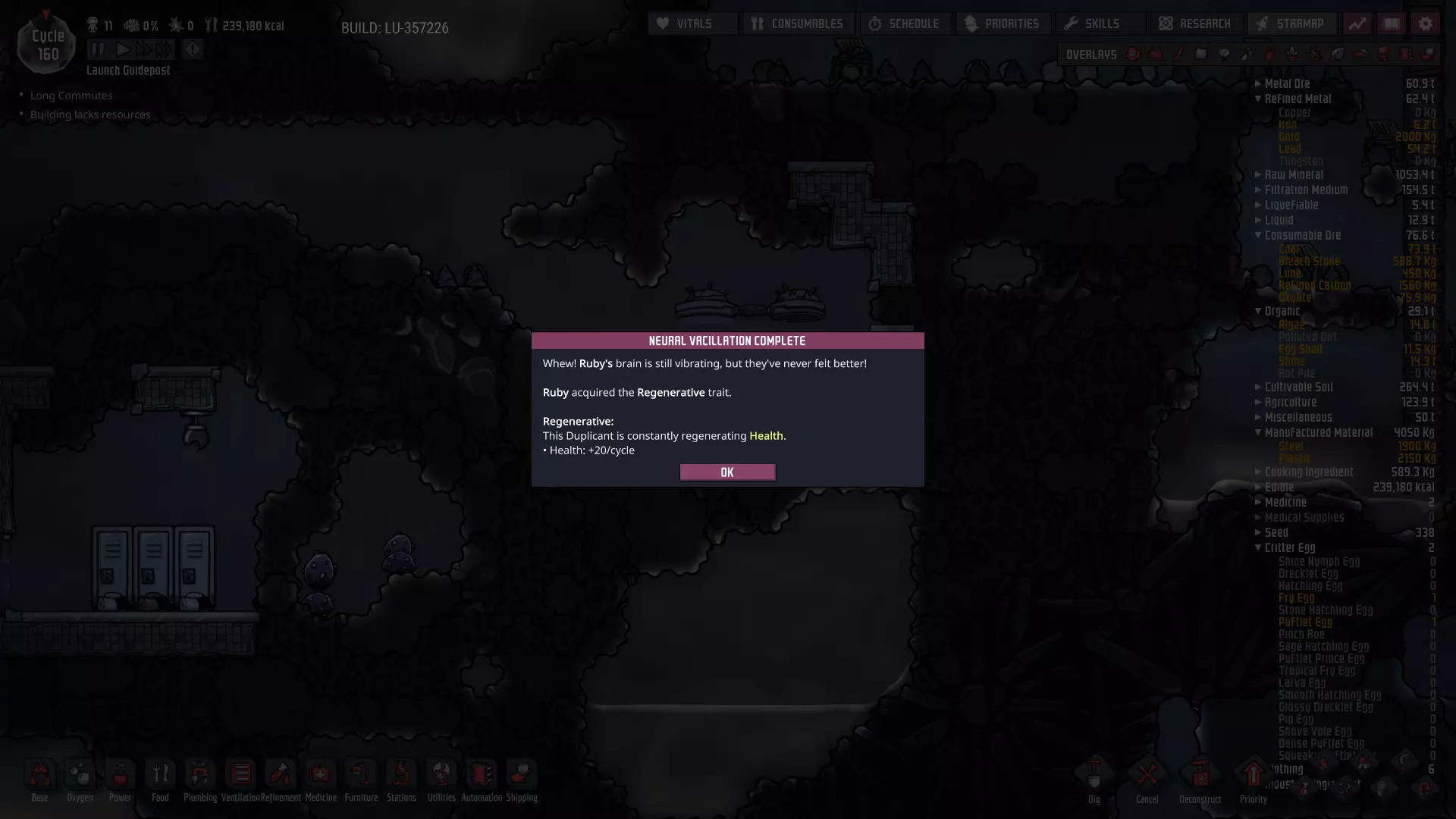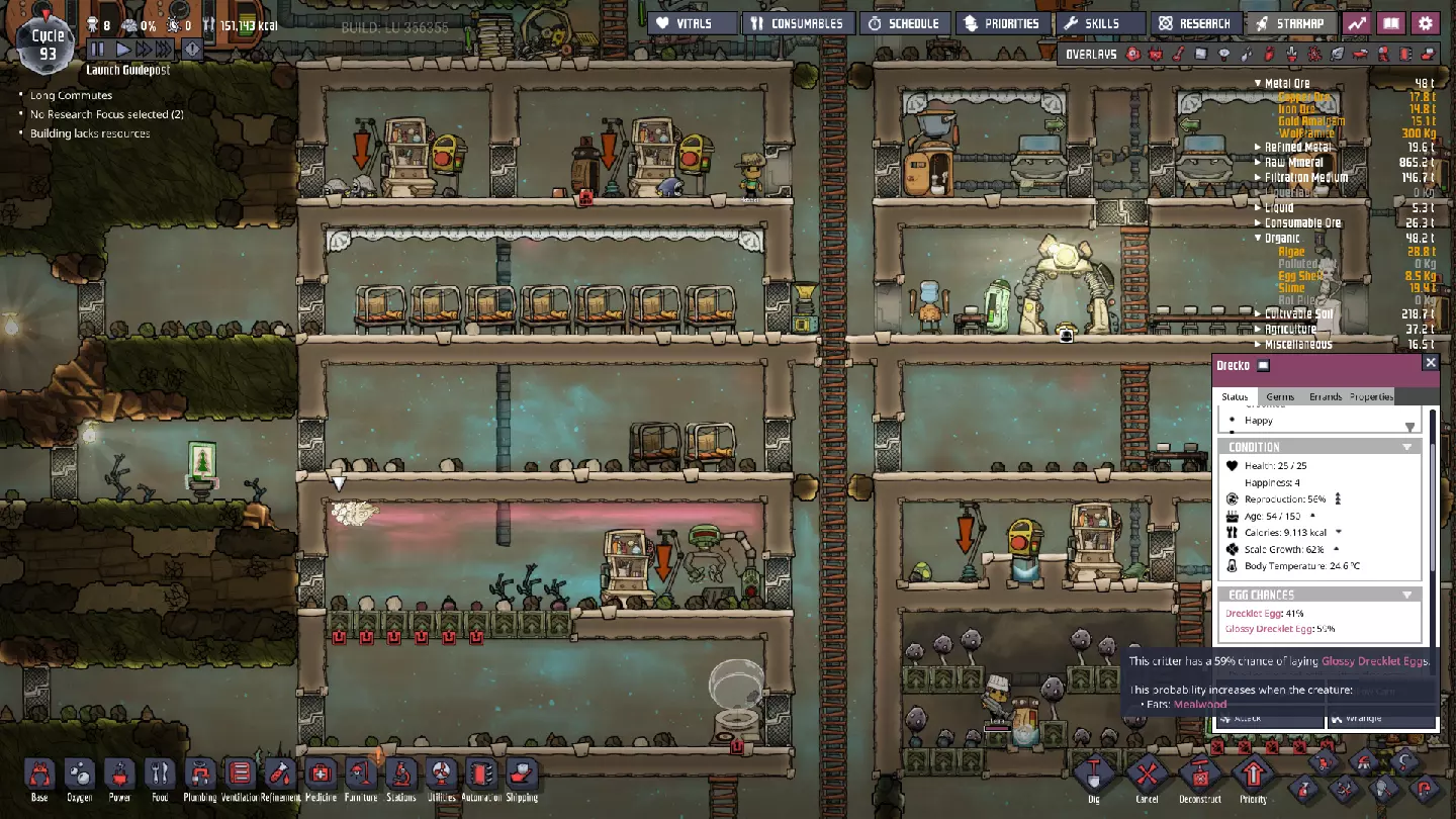 我已经成功完成了第一次“平滑孵化”,这在一定程度上要归功于孵化器。我本以为现在也该获得第一只“亮泽 drecko”了……但我牧场里的 drecko 就是很顽固,不肯产出我想要的蛋。不过我觉得它很快就会产出“亮泽 drecklet 蛋”,到时候就能开始生产珍贵的塑料了。 目前,我们已经开始通过牧场养殖被动生产铁(或者很快就能实现),塑料也即将开始供应。我们还“捕获”了一些可再生资源点,但目前还没怎么利用它们。最后,我们也才刚开始使用来自石油 biome 的新资源。有了这些可供我们使用的资源,下一个主要目标与之前有所不同——是时候让殖民地实现真正的工业化了。 当然,在继续之前,请务必检查氧气水平、藻类储量、供水情况、液体储液罐状态等。时刻留意即将出现的任何问题。同时也要检查各个特殊地貌的状态变化;我这里有一个(隐藏的!)蒸汽喷口最近进入了休眠状态。这个喷口有一个非常罕见的特点: