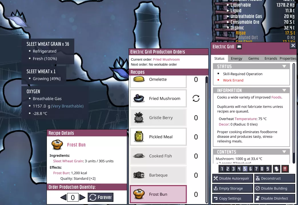既然我们已经可以获取史莱姆和真菌孢子,就可以正式开始农场运作了。 确保将储物箱设置为接收史莱姆——它在“有机物”分类下。设置高优先级,这样就不会有散落的史莱姆堆积。 当你收集到至少3000千克史莱姆,并且拥有一只智慧哈奇后,还要将兽栏的食物供应切换为史莱姆。开采沼泽生物群系会释放大量史莱姆,而智慧哈奇将是清除它们的最快方式!智慧哈奇还拥有最高效的煤炭转化率,这将进一步增加我们用于发电的煤炭储备。 此外,蒸馏技术能让你解锁藻类蒸馏器。如果你不在“泰拉”地图(因此水资源匮乏),可以考虑使用这个替代方案——它能将3份史莱姆转化为1份藻类和2份污染水。不过要小心病菌…… 一段时间后,你的农夫应该能为你额外生产一些真菌孢子,最终让你拥有一个满植的蘑菇农场。到这时,你就可以完全移除旧的食用树农场了! 优点: - 油炸蘑菇在烹饪过程中可增加400千卡热量。 - 史莱姆用于食品生产的效率极高。 - 油炸蘑菇能提供+1士气,而腌菜则是-1——这足以轻松让你的复制人再掌握一项技能。 - 油炸蘑菇的空间效率更高——每千克2800千卡,而腌菜仅为每千克1800千卡。它们所需的生长时间仅为食用树的四分之一,这样就能节省复制人的时间去做其他任务。在沼泽生态群系开采了一段时间后,我的蘑菇农场几乎满了!你还能看到我最近获得了一枚 sage 幼年哈奇蛋。