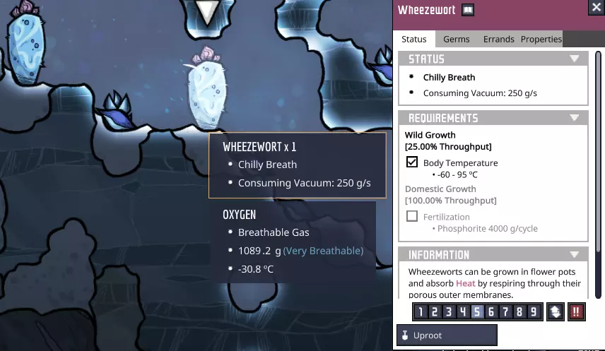 通常来说,穿过这里并没有太大挑战——只需确保你的复制人避开任何融化的水洼,因为他们会因此迅速患上低温症。 不过,我们确实讨论过这里对年轻殖民地最重要的资源——**冰原小麦(Wheezewort)**。你看到的那些浅蓝色仙人掌能为周围环境提供被动冷却。它们虽然不如我们的蒸汽轮机冷却装置强大,但仍然非常有用。
