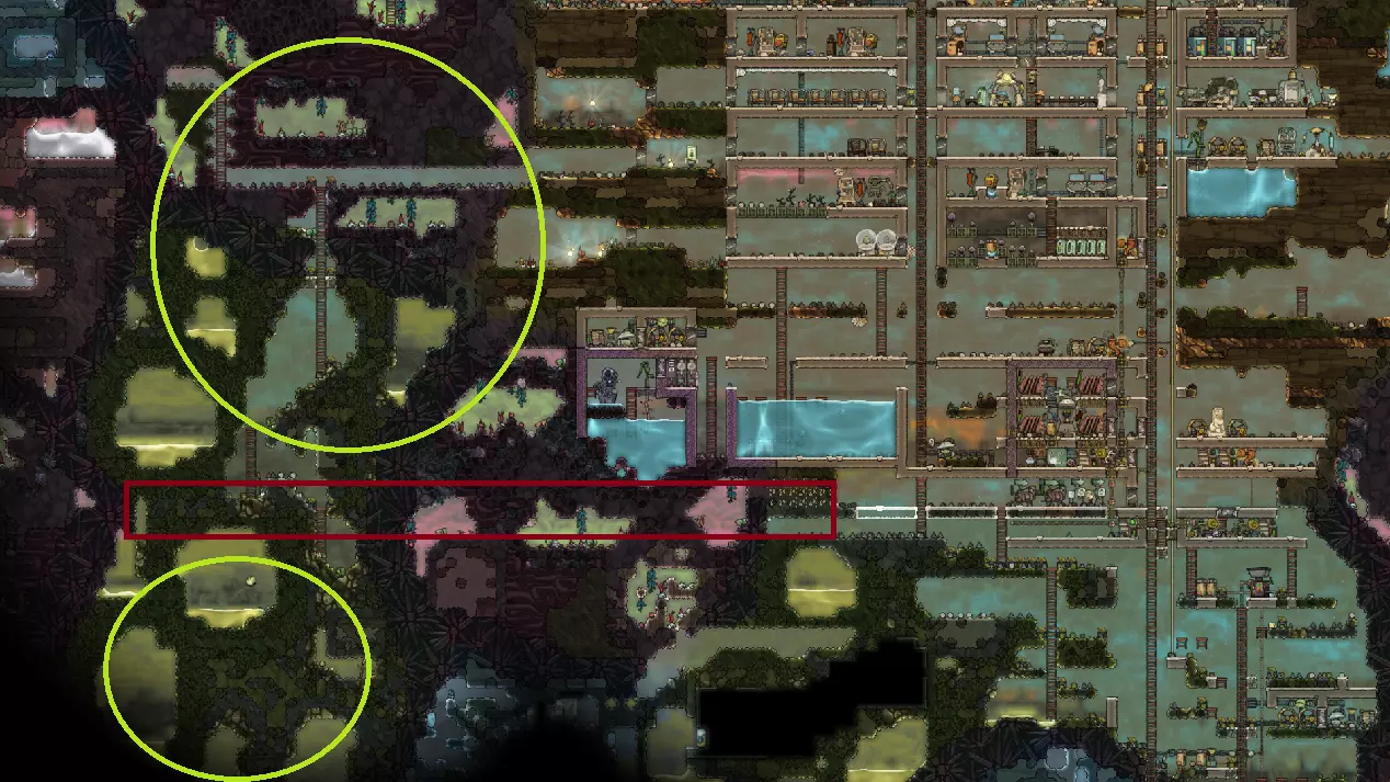 当压力降至合理水平后,我打开了它让空气进入。这里离基地不近,有安全的地方可以让多余的氯气和氢气聚集。当我靠近左侧沼泽生物群系的梯子时,我在旧梯子顶部安装了一扇门,并将其设置为禁止从该路线离开。这样我们就能通过重复利用探索主基地下方区域时搭建的基础设施,妥善处理底部圆形区域的史莱姆。这可以通过像第一个站点那样设置第二个站点来实现,配备手部消毒器和矿石洗涤器——关键是要确保所有从史莱姆肺感染区域的出口都被这些结构覆盖。当你准备在新的沼泽区域开始采矿时,确保你有足够的黏液储存空间。如果没有,在水下区域额外建造一两个储物箱,比如之前的巨型水箱,并将其优先级设为6或7。基本上,要确保蘑菇农场附近的任何黏液都留在那里(优先级7),而不是被转移到新的储物箱中——如果新储物箱的优先级设为8或9,复制人会自动进行转移。 以下是我在本节结束时的进度: