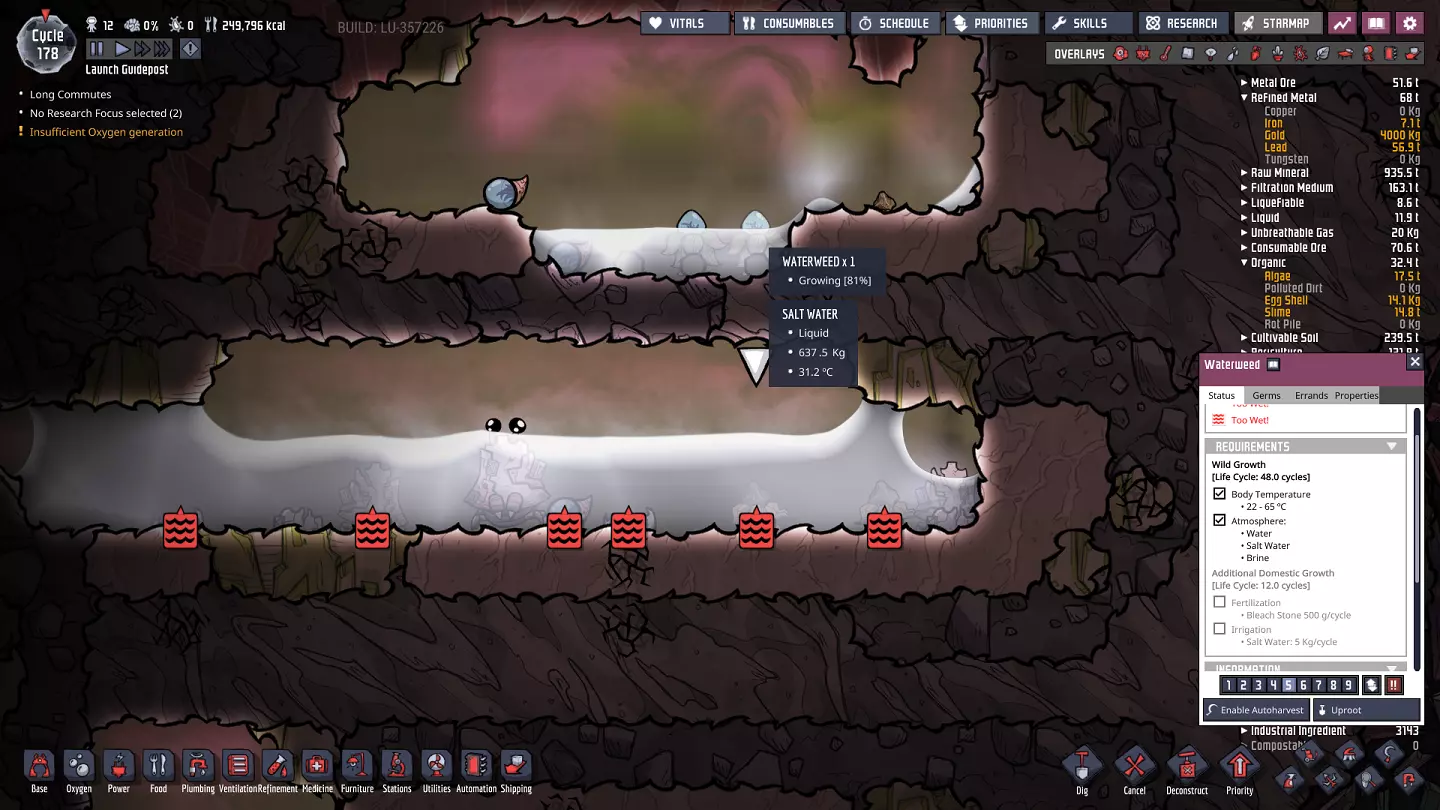 角色:农民/备用牧场主。我其实不太想招募他,因为已经有10个复制人了,但他的特质相当不错,而且我一直想要一个备用牧场主,以便主牧场主睡觉时能顶班。 说个小细节,我目前的11个复制人中,有6个拥有“潜水肺”特质,所以我的氧气消耗量相当于9.5个标准复制人。这也意味着,从氧气角度来说,如果我想的话,还可以再招募7个复制人(其中两个拥有“潜水肺”)……不过食物问题是个小麻烦。我建议现在继续保持克制——你现在有足够的时间,所以可以设定非常高的招募标准。 除了研究员之外,每个复制人现在都有了轮班的备用人员,这有助于确保任何任务都始终有人可用。杂记 到第159周期时,我的基地终于快要填满三个液体储液罐了。要知道,它们建成后已经过了大约140个周期。由于我最近已经驯服了一个冷蒸汽喷口,所以水资源并不短缺……因此我打算用大量污染水来灌溉一些消耗量大的植物。幸运的是,我从打印舱获得了几棵乔木橡果的种子,所以正在使用它们。不过,针苇其实是更好的污染水消耗者,而且我目前只有20个芦苇纤维;考虑到我没有养殖普通的 drecko( drecko ),现在投资种植针苇可能是更好的选择。 我们已经有相当长一段时间没有专注于清理大片沼泽生态群系了——记得检查你的史莱姆数量。我的史莱姆数量比以前减少了近一半,这主要是因为养了两只 sage hatch( sage hatch )。(煤炭的情况倒是很不错!)当然,最终还有很多沼泽需要开采,所以现在费心养殖“贤者史莱姆”是值得的。请务必记住,后续想要再获取更多贤者史莱姆并不容易,而且我们的蘑菇农场确实需要史莱姆;千万别让它们灭绝了! 接下来的目标 到目前为止,我们无疑已经完成了中期游戏中最困难的部分。剩下的就是收尾工作,并讨论一些更容易解决的话题。现在我们可以做一些组织性的准备工作,这些工作虽然不属于一个清晰、完整的后期游戏阶段,但对我们的后期游戏会很有帮助。 - 我们可以显著改进对大量气体的处理方式。 - 我们甚至还没开始使用天然气呢!还有潮池生态群系和盐水间歇泉这两个小问题需要讨论。 除了这些话题,我们的主要目标应该是确保从可再生资源中获取足够的水,以永久维持氧气生产。目前,我们的水可能处于净亏损状态,不过消耗速度会相当缓慢。一旦我们能从(净)消耗水转变为生产水,我们就几乎完全稳定下来,并为后期游戏做好准备——届时我们会遇到一些非常重要的(加热)用水消耗。 如果你正在使用本攻略的种子,情况会相对轻松——基地上方的那两个额外的低温蒸汽喷口将为你提供所需的全部水源。否则,就要寻找新的可利用资源点,以确保也能有多余的水!就目前情况而言,我们完全可以停止对基地的升级;凭借现有的设施,我们很容易就能达成“Home Sweet Home”成就。当然,收集必要资源需要不少周期,但目前唯一尚未制作的物品就是玻璃——而这只需再搭建一个冷却循环系统即可解决。 **利用天然气** 既然我们暂时从紧急事务中喘了口气,如果你已经找到了合适的天然气源,现在正是建造天然气发电机工厂的绝佳时机。这些发电机每瓦产生的热量更少,同时也会产生少量的污染水和二氧化碳(同样每瓦排放量也更低),不过其运行需要消耗天然气。 此外,在《缺氧》的世界里,天然气是一种可再生资源,这一点相当不错。这对于我们的电力基础设施来说也是一项非常重要的升级——每台天然气发电机的发电量比同等的燃煤发电机高出33%,这使得“调校”增益在这里比在燃煤电厂中效果更好。当然,石油发电机在这方面表现更佳,但这需要更多的工作量——而且石油的精炼过程实际上会产生额外的天然气。因此,天然气自然成为殖民地发展的一个顺理成章的过渡选择。 幸运的是,这座电厂的实际建造过程相当简单: