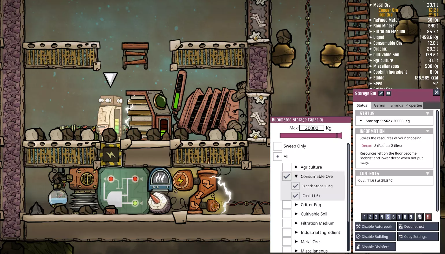 这将使其成为优先存储的物品,以尽可能多地保存我们的收获。当“释放气体”的固体所在的格子(储物箱的底部格子)被淹没或以其他方式超压时,它们将无法释放气体。 其他注意事项:既然我们已经获得了第二种“消耗性矿石”资源,请前往你的燃煤电厂并检查其储物箱。