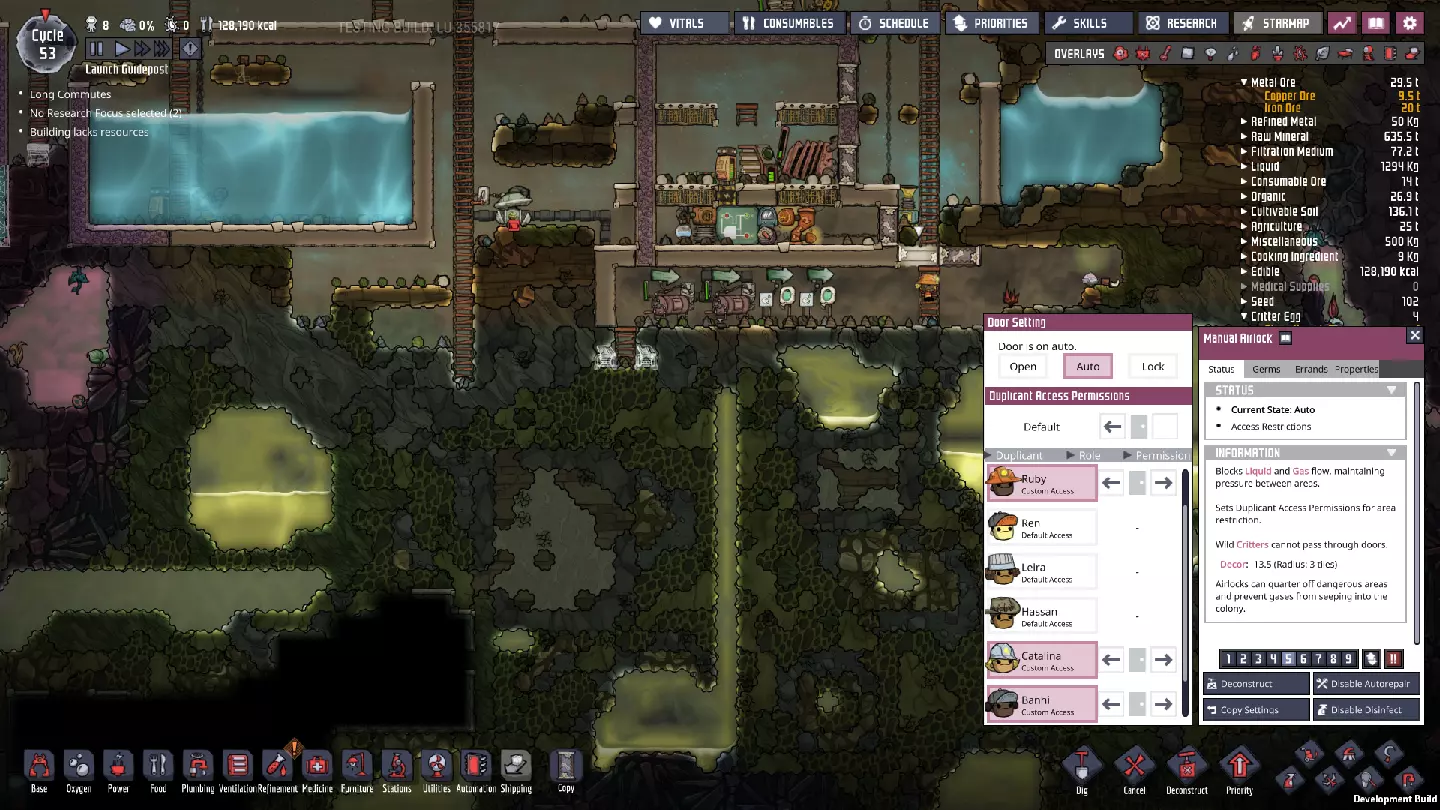 这里有两瓶洗手液和两台矿石洗涤器,后者是通过新科技解锁的。我已经从充满氯气的气体储存罐连接了气体管道到它们那里,以提供所需的供应。它们也位于我们未来采矿作业的唯一出口路径上,确保复制人离开前必须经过这个站点并进行消毒。我们还在梯子旁放置了几台除臭器,以阻止任何可能渗透进来的污染氧气。 另外请注意,我在这里设置了门权限。我只允许我的两名采矿/建筑复制人(用于探索)和两名具有高存储优先级的复制人进入——两台矿石洗涤器各分配一名。这样一来,虽然被感染的史莱姆可能会穿过洗涤器,但藻类在进入基地之前几乎肯定会被消毒。这为什么重要呢?