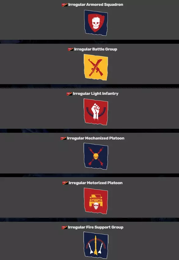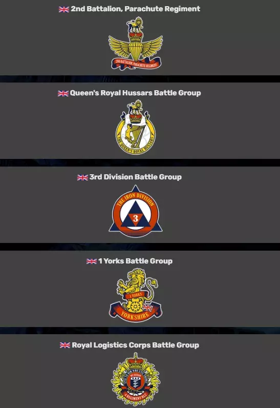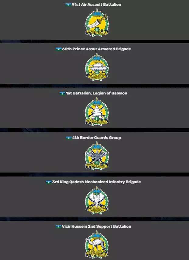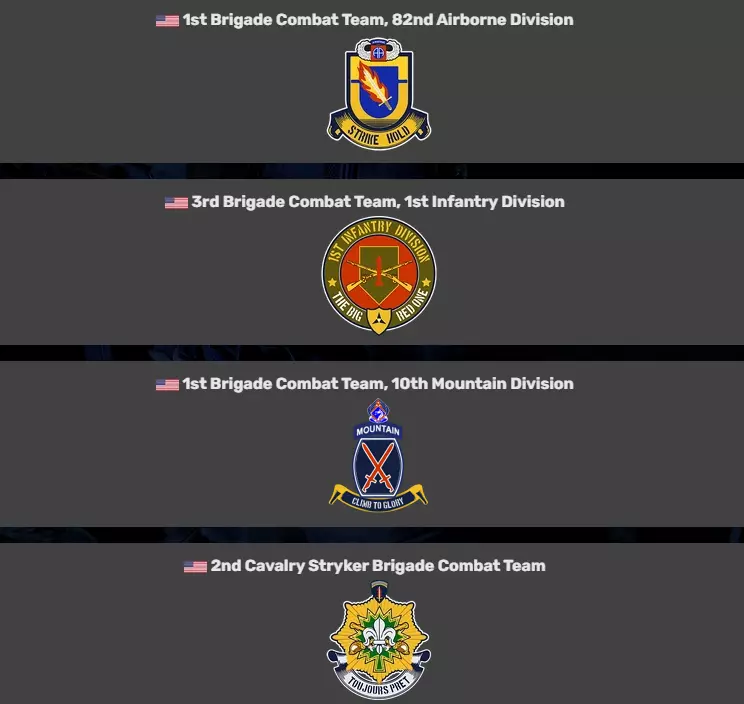 塔利尔前空军基地曾为伊拉克空军所用,基地内设有大型混凝土机库和防御阵地。该地区大部分为开阔沙漠,尽管周边分布着一些村庄,但由摩托化步兵协同作战的装甲坦克部队将决定战局的走向。~ 游戏内说明 阵营 游戏中有12个阵营,每个阵营都拥有自己的营、旅、群、队等编制。 每个国家也有其独特的武器装备,但在此不一一列举,因为这会占用大量篇幅。 1. 美国陆军