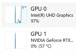 于是发现只有集成显卡几乎占用了100%的资源,而独立显卡并未被使用。 如果情况并非如此,那就放弃吧。