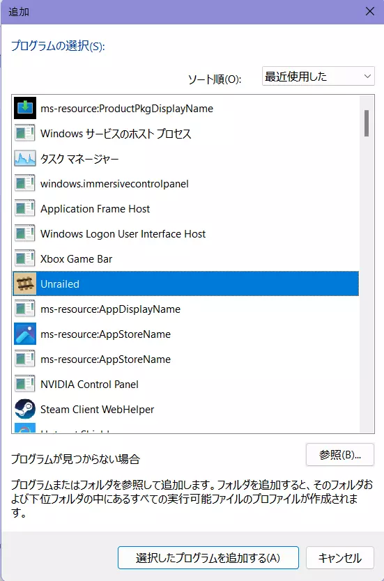将排序顺序设为“最近使用”并选择《一起开火车!》后,请点击“添加所选程序”。程序选择完成后,请从图形选择栏中选择“高性能NVIDIA处理器”。
