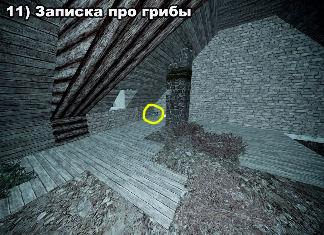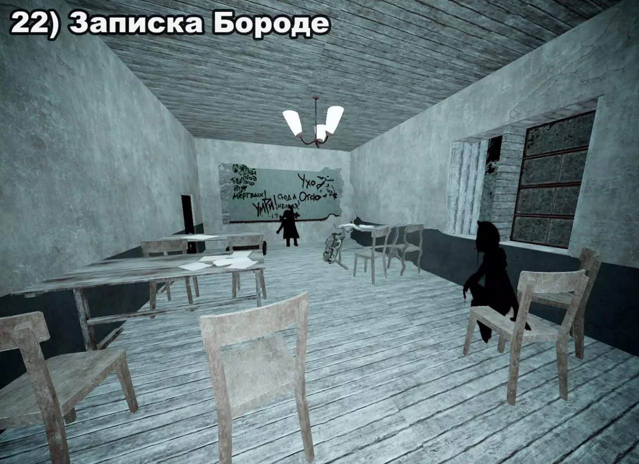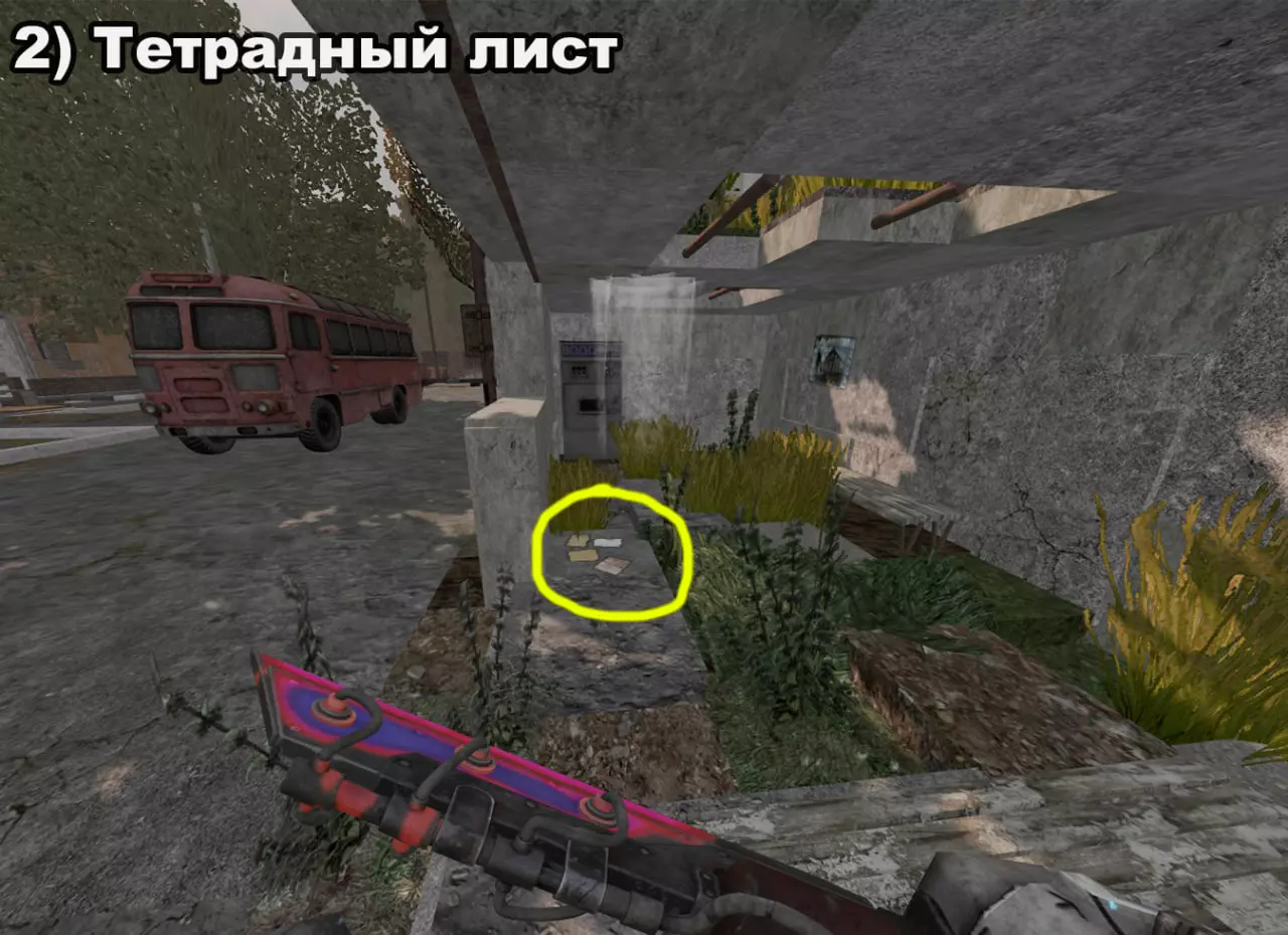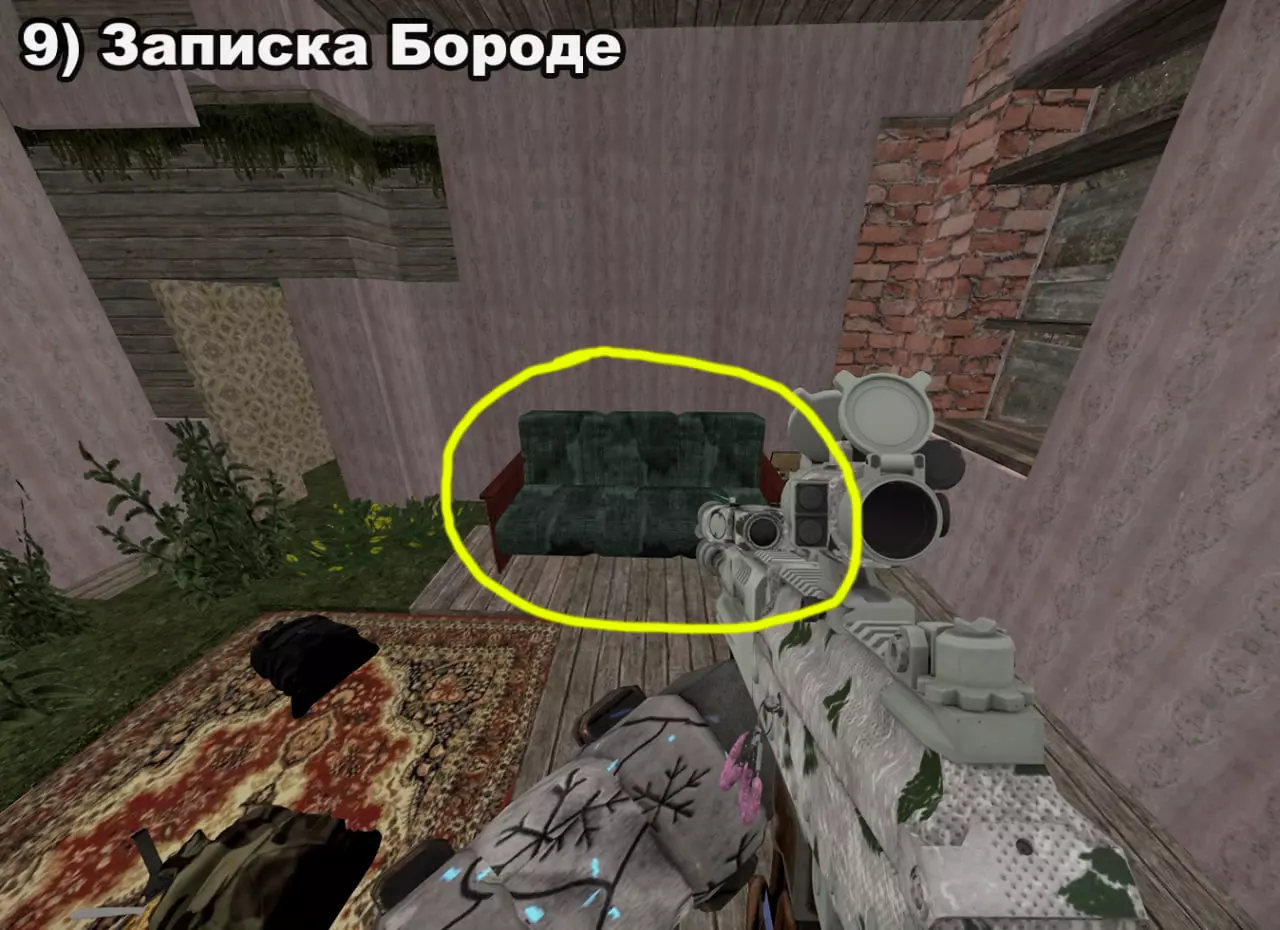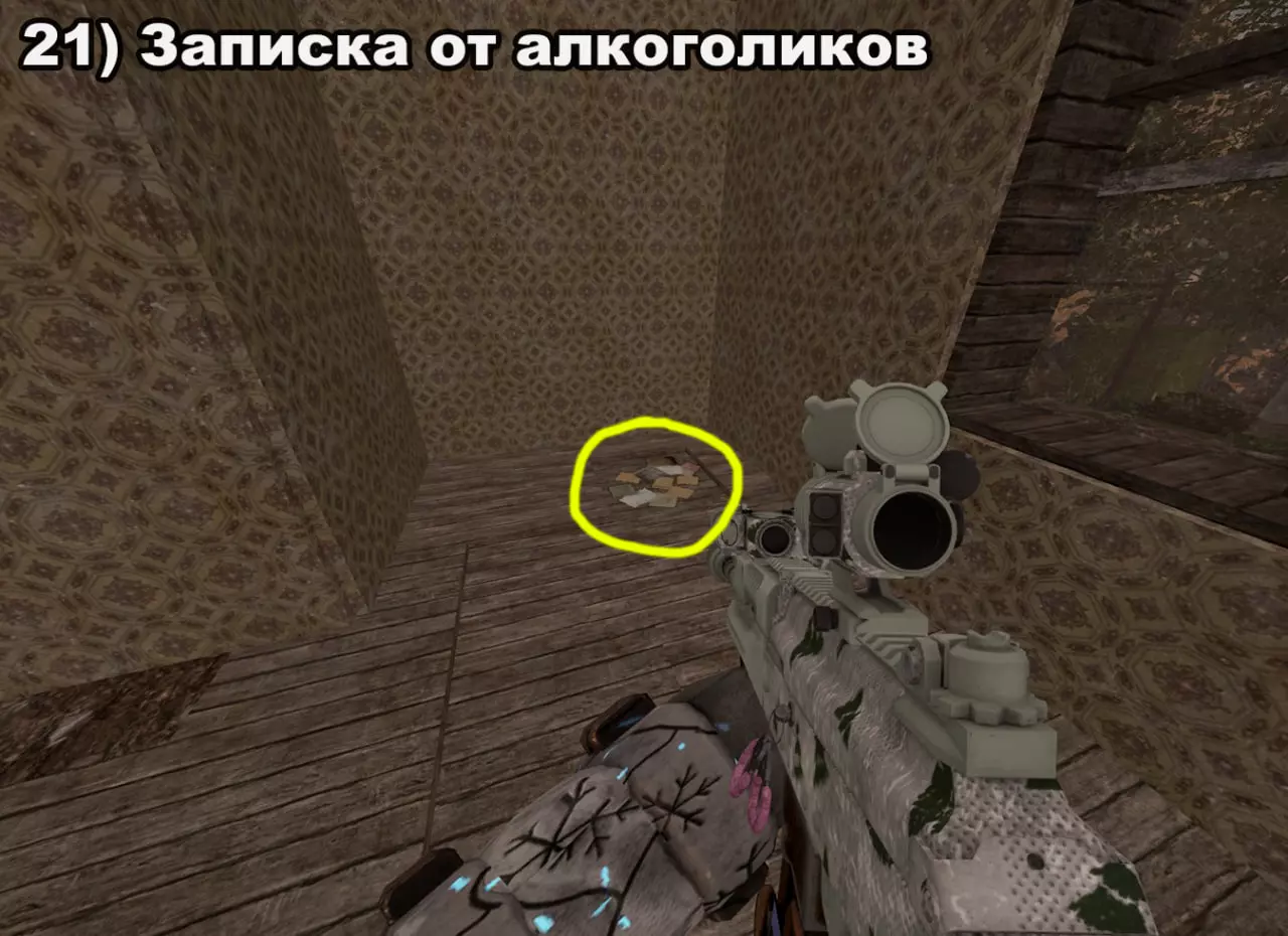结局 将所有纸条放入口袋后,在20:00-22:00前往医院。接下来按照严格顺序前往各个触发点: 1) 穿过蘑菇区域 2) 经过路标 3) 站在辐射值为3的矮柜后面 4) 站在四个箱子上 5) 站在墙上有弹孔的墙壁旁 6) 站在机枪旁的乌鸦附近 7) 站在“果冻”(кисель)中 8) 靠近冰箱并领取奖励