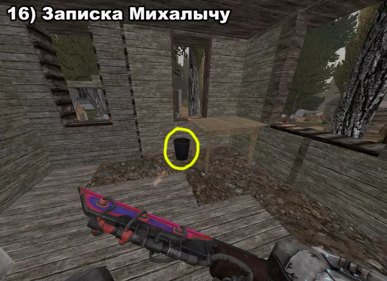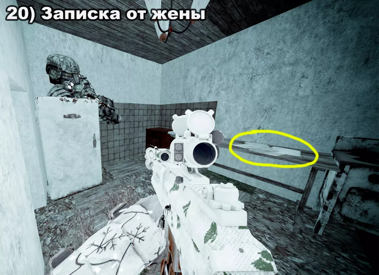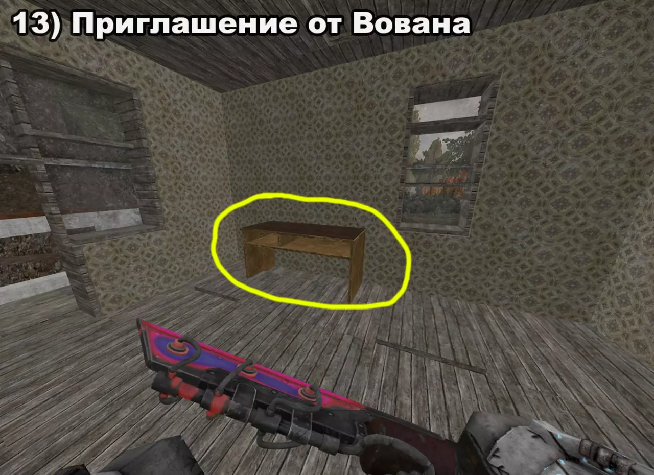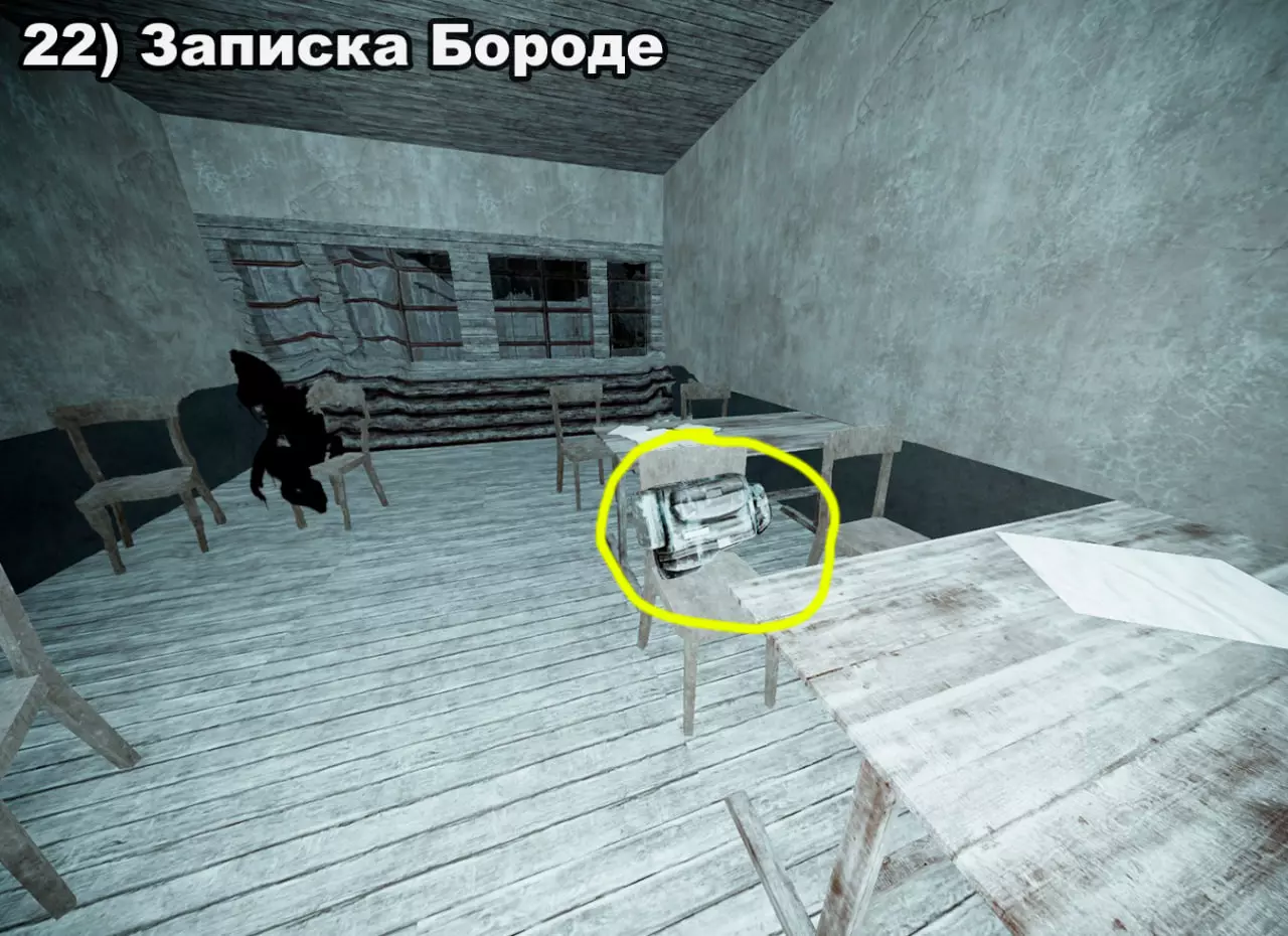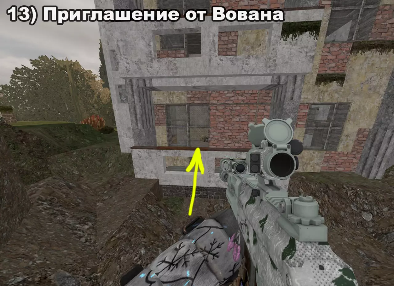 结局 将所有纸条放入口袋后,在20:00-22:00前往医院。接下来按照严格顺序前往各个触发点: 1) 穿过蘑菇区域 2) 经过路标 3) 站在辐射值为3的矮柜后面 4) 站在四个箱子上 5) 站在墙上有弹孔的墙壁旁 6) 站在机枪旁的乌鸦附近 7) 站在“果冻”(кисель)中 8) 靠近冰箱并领取奖励