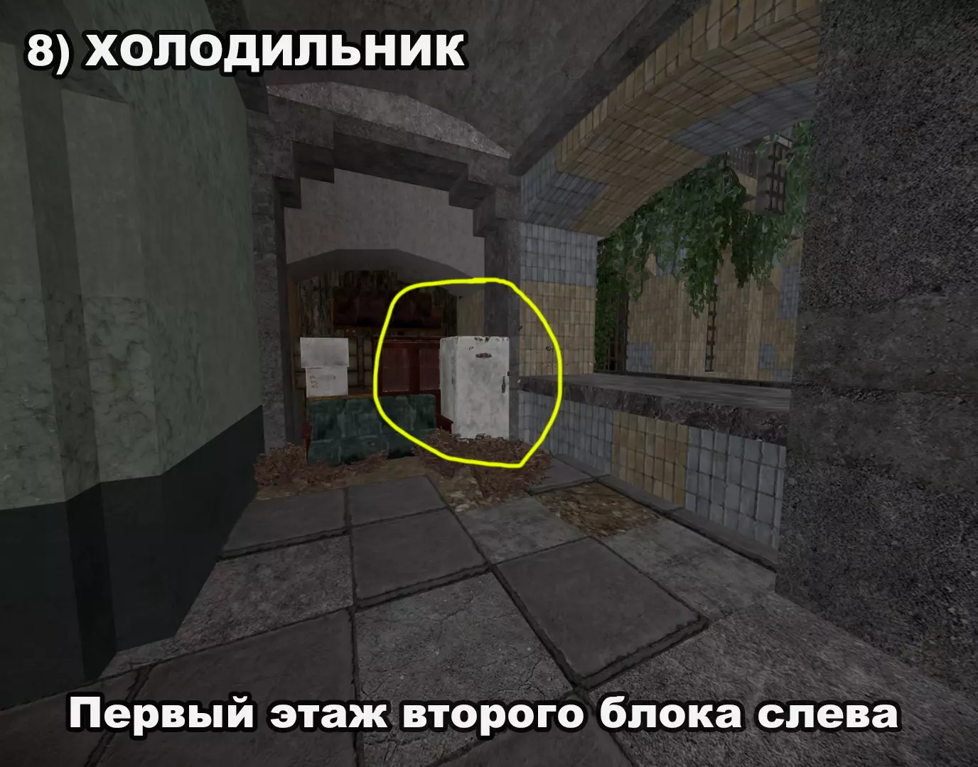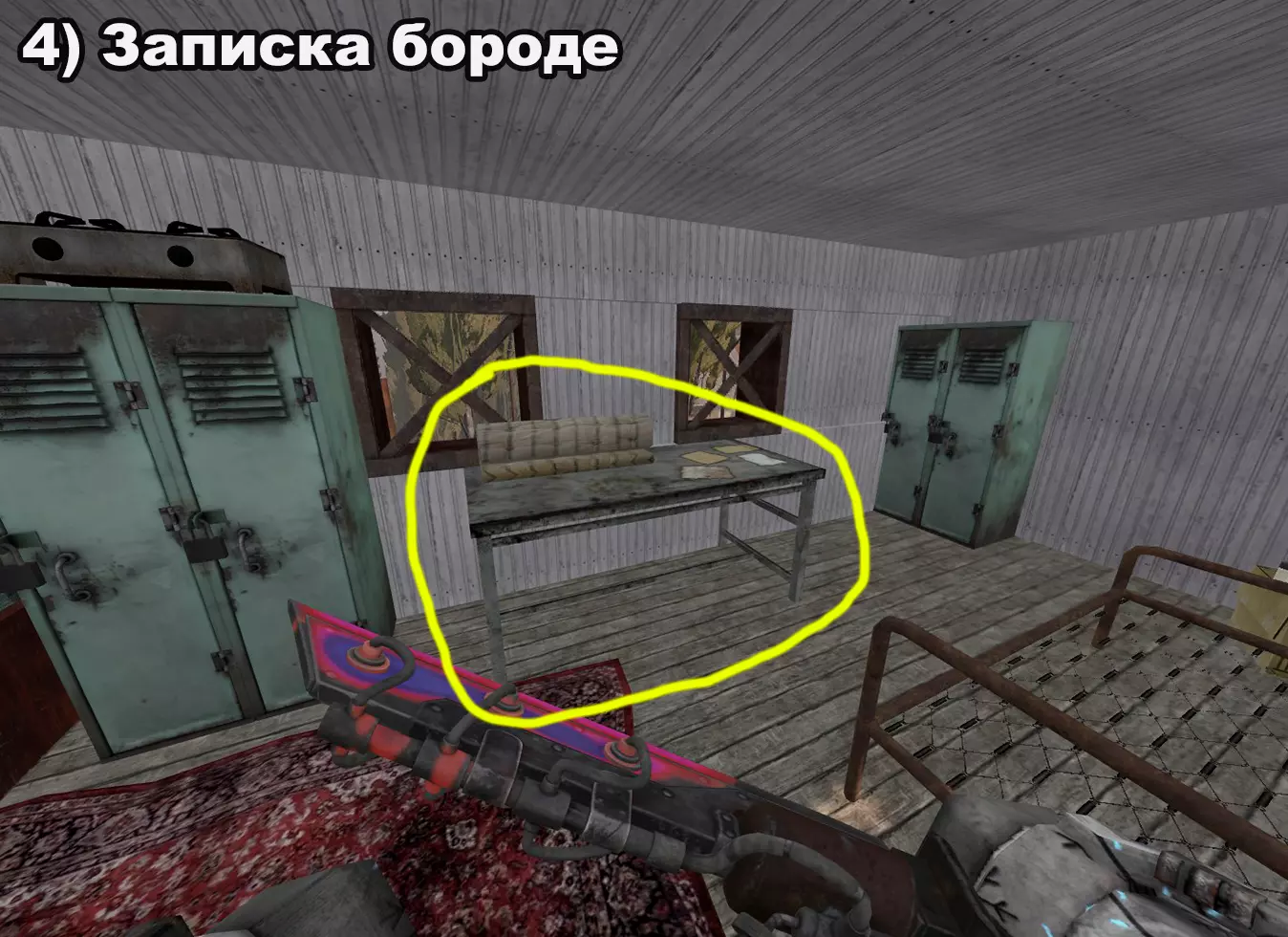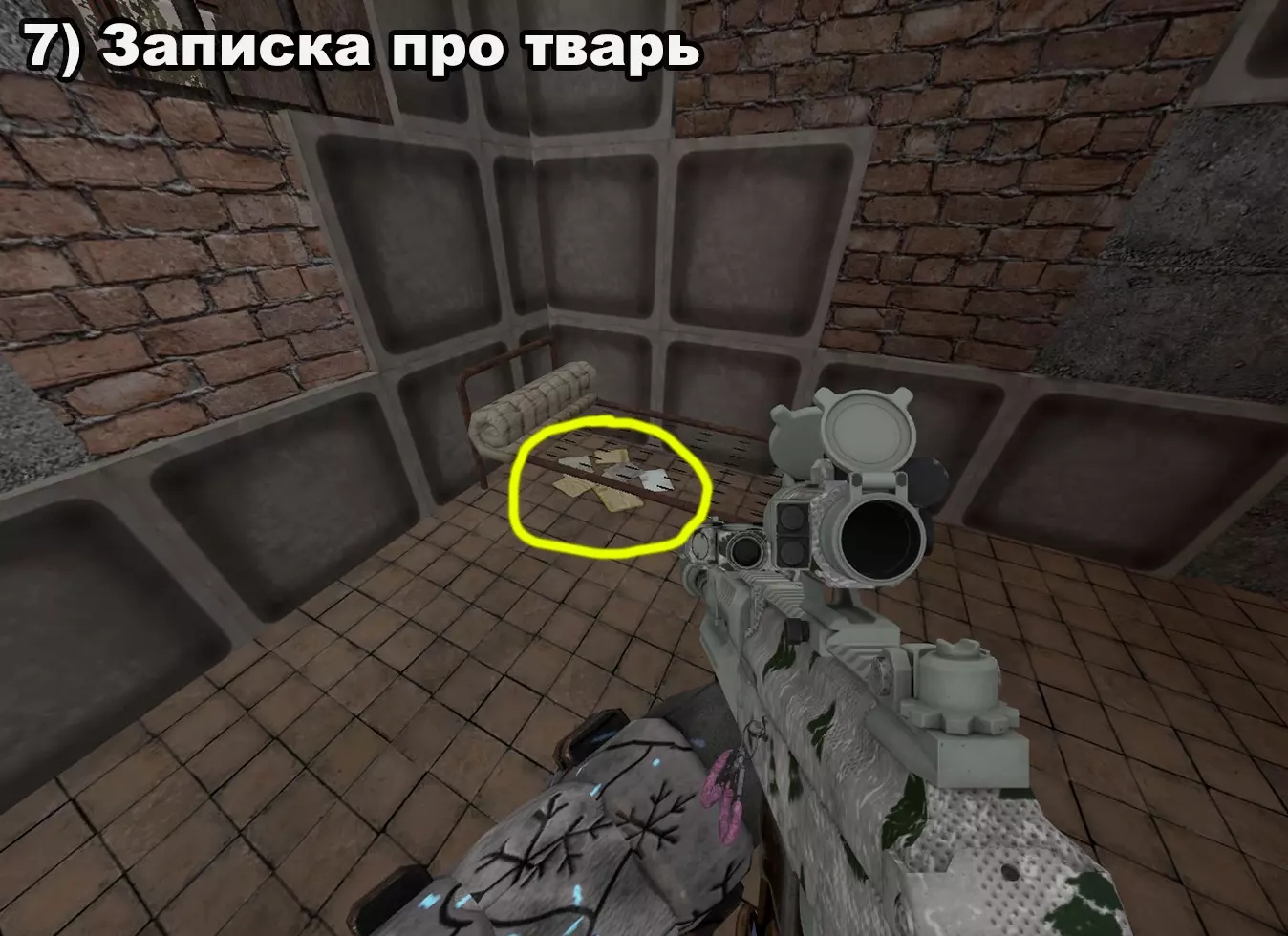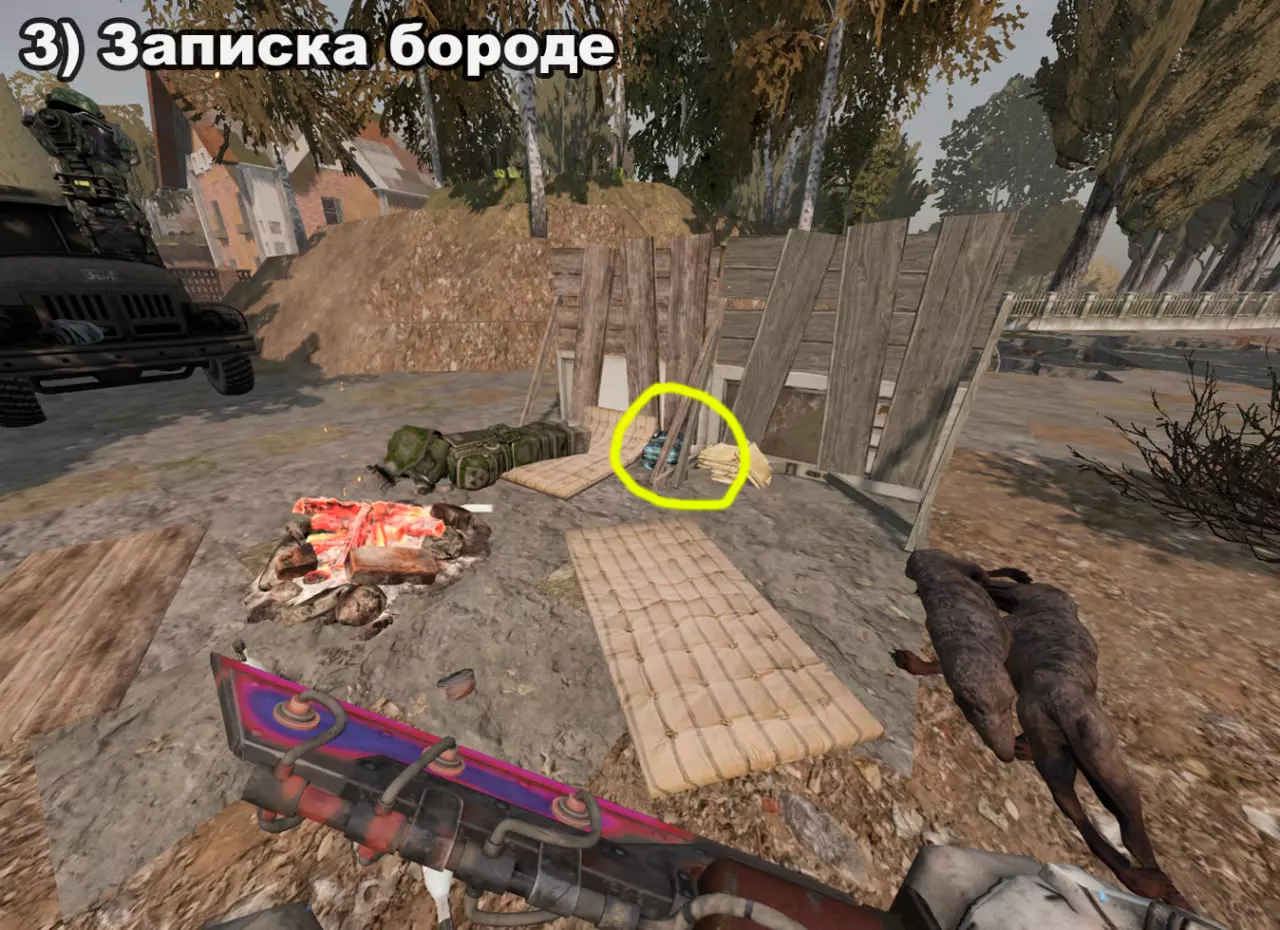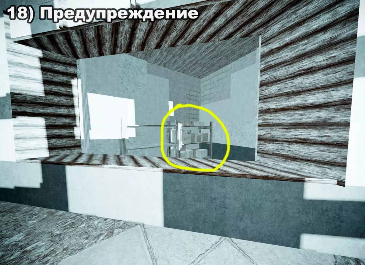 结局 将所有纸条放入口袋后,在20:00-22:00前往医院。接下来按照严格顺序前往各个触发点: 1) 穿过蘑菇区域 2) 经过路标 3) 站在辐射值为3的矮柜后面 4) 站在四个箱子上 5) 站在墙上有弹孔的墙壁旁 6) 站在机枪旁的乌鸦附近 7) 站在“果冻”(кисель)中 8) 靠近冰箱并领取奖励