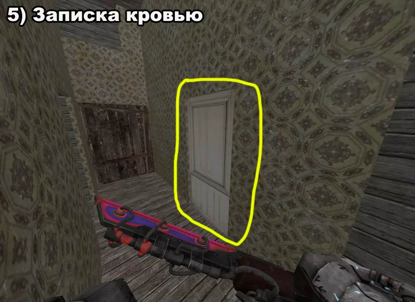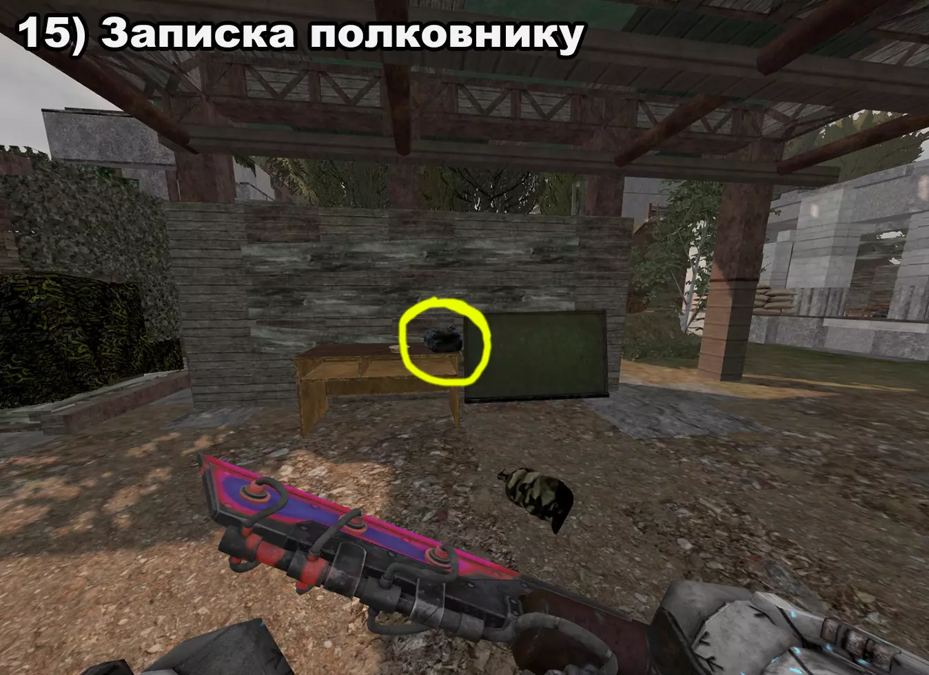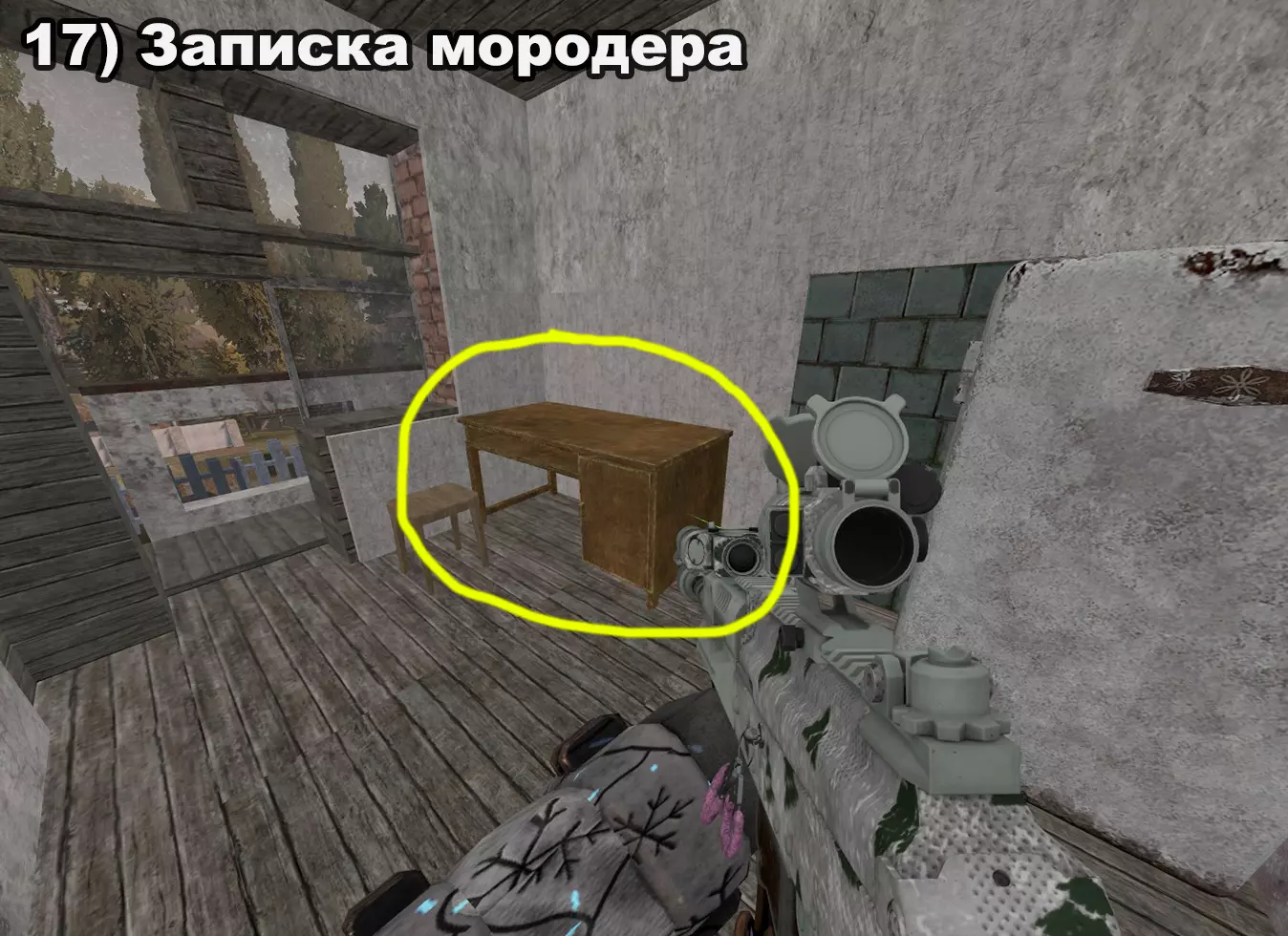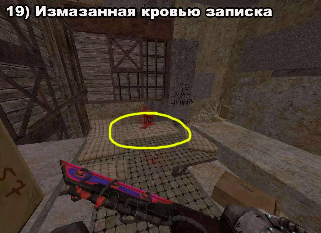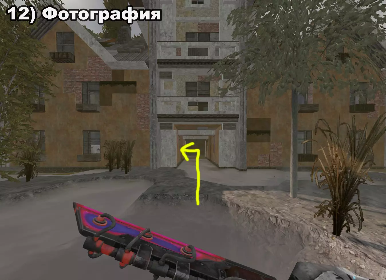 结局 将所有纸条放入口袋后,在20:00-22:00前往医院。接下来按照严格顺序前往各个触发点: 1) 穿过蘑菇区域 2) 经过路标 3) 站在辐射值为3的矮柜后面 4) 站在四个箱子上 5) 站在墙上有弹孔的墙壁旁 6) 站在机枪旁的乌鸦附近 7) 站在“果冻”(кисель)中 8) 靠近冰箱并领取奖励