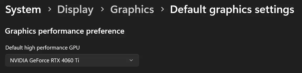 找到该文件夹后,新建一个名为“EnableMsHybrid”的DWORD键值。若要使用性能GPU,将其设置为1;若在选择“省电”(LSFG)GPU时遇到问题,且当前位于该GPU的文件夹下,则将其设置为2。 完成所有操作后,只需重启电脑,你就可以为每个游戏选择偏好的GPU了。 对于Windows 11: Windows 11的操作流程更为简便,无需通过注册表编辑器(regedit)即可实现。 进入“系统 > 显示 > 默认图形设置”,将“默认高性能GPU”设置为你的渲染GPU。