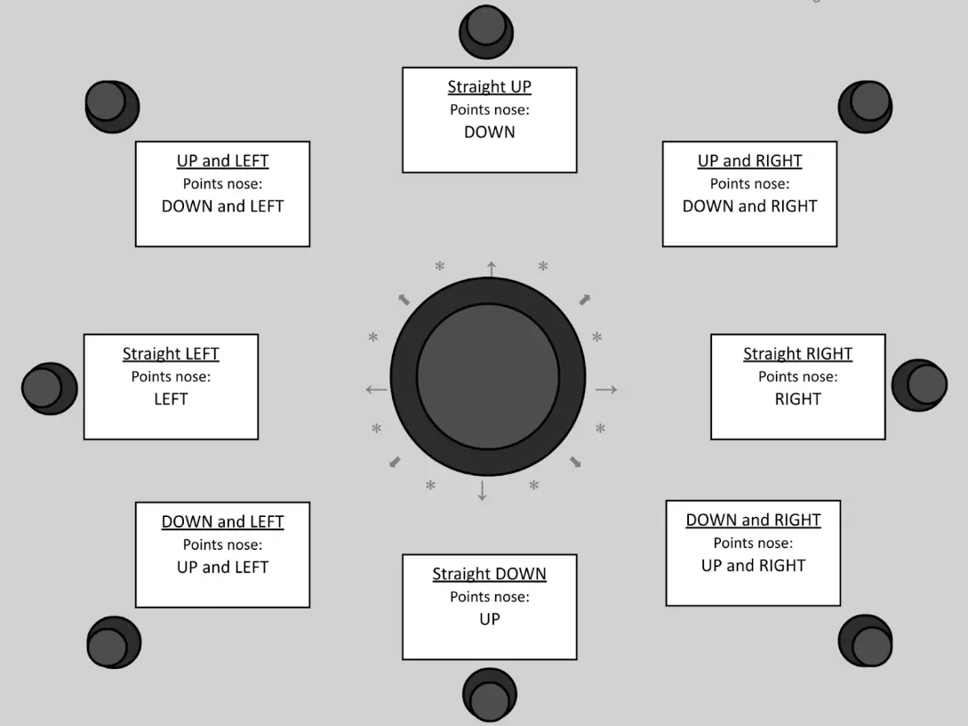 (开发中)本指南将为空中翻滚动作设定一套标准,进而帮助玩家将几乎所有空中技巧简化为一系列基础的模拟摇杆输入。说真的,这非常实用。 本指南仍在开发中!我会定期更新以完善它。欢迎提出你的想法! 目标与成果 强烈建议你查看我的这份指南: https://docs.google.com/document/d/1eZAbWPrSGT1qq7hcyeuUKee8XOcb8S0K/edit?usp=sharing&ouid=105319463969498769846&rtpof=true&sd=true 该版本将包含GIF动图、图片和视频,以帮助你理解操作说明。目标: 1) 掌握全部三种空中翻滚(手动、向左、向右) 2) 将模拟输入和连锁操作应用于所有复杂机制 经过3000小时的游戏时长,以及对空中机制的浓厚兴趣,我得出了一个令人沮丧的结论——我遗漏了某些关键内容。我从未学过使用方向空中翻滚。 我意识到,某些动作,例如龙卷风旋转,仅靠手动空中翻滚是根本无法完成的。作为一名骨子里热爱自由花式的玩家,这让我无法接受。 于是,我彻底更改了控制器设置,并开始学习方向空中翻滚。 这个过程糟透了。 一线希望?但经过更多小时的练习后,我开始注意到空中翻滚操作的规律,并得出了一个惊人的结论:几乎所有高级空中技巧都可以分解为一系列简单的模拟摇杆移动和空中翻滚操作。让我来为你展示具体方法! 为什么要使用方向空中翻滚? 开始之前 在我们投入练习之前,必须问自己一个非常重要的问题: - 我为什么要使用方向空中翻滚?它能带来什么帮助? 方向空中翻滚是一个非常实用的工具,但常常被许多初级和中级玩家忽视。我坚信,初次学习游戏时至少掌握一种方向空中翻滚(以及手动操作)对玩家大有裨益。以下是三个主要原因: **方向键空中翻滚可控制两个独立轴(Axis)** 与手动空中翻滚一次只能朝一个方向转动不同,方向键空中翻滚允许玩家同时控制两个轴。凭借这种增强的控制能力,玩家可以执行更快的旋转动作,而这是手动空中翻滚无法实现的。随着段位提升,速度和精准度变得愈发关键,甚至可能直接决定胜负。 **方向键操作更简单(所需模拟输入更少)** 手动空中翻滚需要持续使用模拟摇杆,这意味着你必须更加专注,且完成特定操作需要更多时间。而方向键空中翻滚则不存在这个问题。使用方向键空中翻滚时,仅需在需要调整时使用摇杆。也就是说,熟练掌握方向键空中翻滚的玩家只需短暂拉动摇杆然后松开,即使不再操作摇杆,赛车也能平稳地改变方向(参见第6页“高级摇杆输入”)。 方向键与手动空中翻滚的结合使用 尽管方向键空中翻滚确实有其优势,但手动空中翻滚在进行空中动作时往往更直观。 交替使用这两种空中翻滚方式对玩家最为有利。总会有某些情况,其中一种空中翻滚方式会比另一种更适用。因此,最好的选择是学会同时使用手动和方向键空中翻滚。 好吧,好吧……但为什么呢?想象一下这种情况: - 我的主力赛车是 breakout。完成一整圈空中翻滚需要2秒时间,从开始到结束。由于我们将这个旋转分为两部分,因此我们在1秒的间隔内控制摇杆移动。这意味着通过巧妙的摇杆输入,我们仅需1秒或更短时间就能让赛车完美对准任何空中射门。按照本指南操作,你一定能做到! 方向空中翻滚——基础 首先要知道,左空中翻滚是顺时针旋转,右空中翻滚是逆时针旋转: 左空中翻滚 = 顺时针旋转 右空中翻滚 = 逆时针旋转 如何使用摇杆(重要!)在定义旋转和模拟摇杆操作前,我们必须先了解本教程中模拟摇杆的使用方法: 进行基础模拟摇杆操作(或输入)时,需要注意在整个半程旋转过程中都要保持摇杆的位置不变。也就是说,应尽量在旋转刚开始时(起始位置)就启动摇杆操作,且**只有在旋转完全结束时(结束位置)才让摇杆回到初始位置**。当然,实际操作中可能会偏离这条规则。 同样重要的是,**不要长时间按住摇杆**,否则会影响第二次旋转的开始,导致赛车位置偏移。左方向空中翻滚 - 标准旋转与次要旋转 标准旋转和次要旋转是我为了将单次空中翻滚旋转分解为两个独立部分而创造的术语。了解旋转中这两个部分的起止时机,将有助于玩家正确把握模拟输入的时机。 **标准旋转** 标准旋转始于赛车底部朝左,结束于赛车底部朝右。
