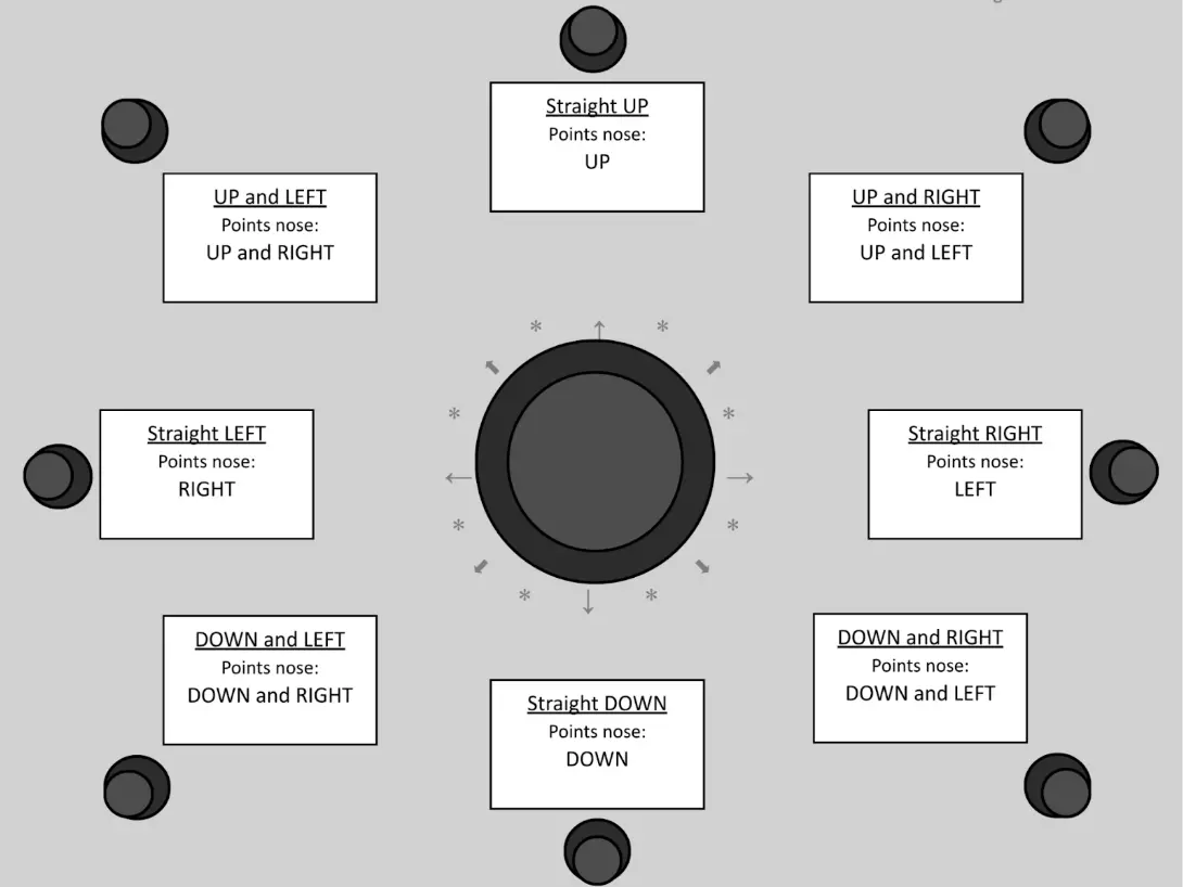 基础模拟输入 – 标准旋转 请记住第3节中所写的内容: “在旋转开始时就启动模拟摇杆移动,且**仅在旋转结束时才让模拟摇杆回到初始位置**。” 以下是为何应遵守此规则的示例: 假设《火箭联盟》玩家SquishyMuffinz首次学习使用方向空中翻滚。在一场在线比赛中,他的队友将球挑至空中。当他跃向空中后,SquishyMuffinz按住了左方向空中翻滚键,却未使用模拟摇杆,随后意识到自己必须向左转向才能碰到球(在整个示例中,SquishyMuffinz始终按住左方向空中翻滚键)。当他的赛车进入标准旋转起始位置后,SquishyMuffinz将模拟摇杆推向并保持在西南方向。这使得赛车车头向左上方扬起。然而,SquishyMuffinz在标准旋转结束前未能将模拟摇杆归位至初始位置。相反,他一直将摇杆保持在西南方向,直到次级旋转结束!在次级旋转中,西南方向的摇杆操作会使赛车车头向右下方倾斜。这与标准旋转中西南方向操作使车头向左上方扬起的效果完全相反。因此,赛车回到了标准旋转起始位置,导致他错过了传球! 左方向空中翻滚 – 次级旋转(参见第4节,图3和图4)