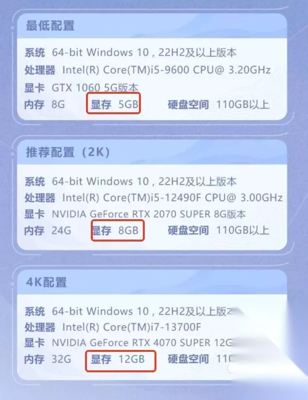 在官方的PC硬件配置需求表中,最低是GTX1060的5G显存版本,这个是不支持光追的,直接跳过。然后是2K推荐配置,显卡是2070super、8GB显存版本,这个应该是能开启光追并获得较好体验的配置。