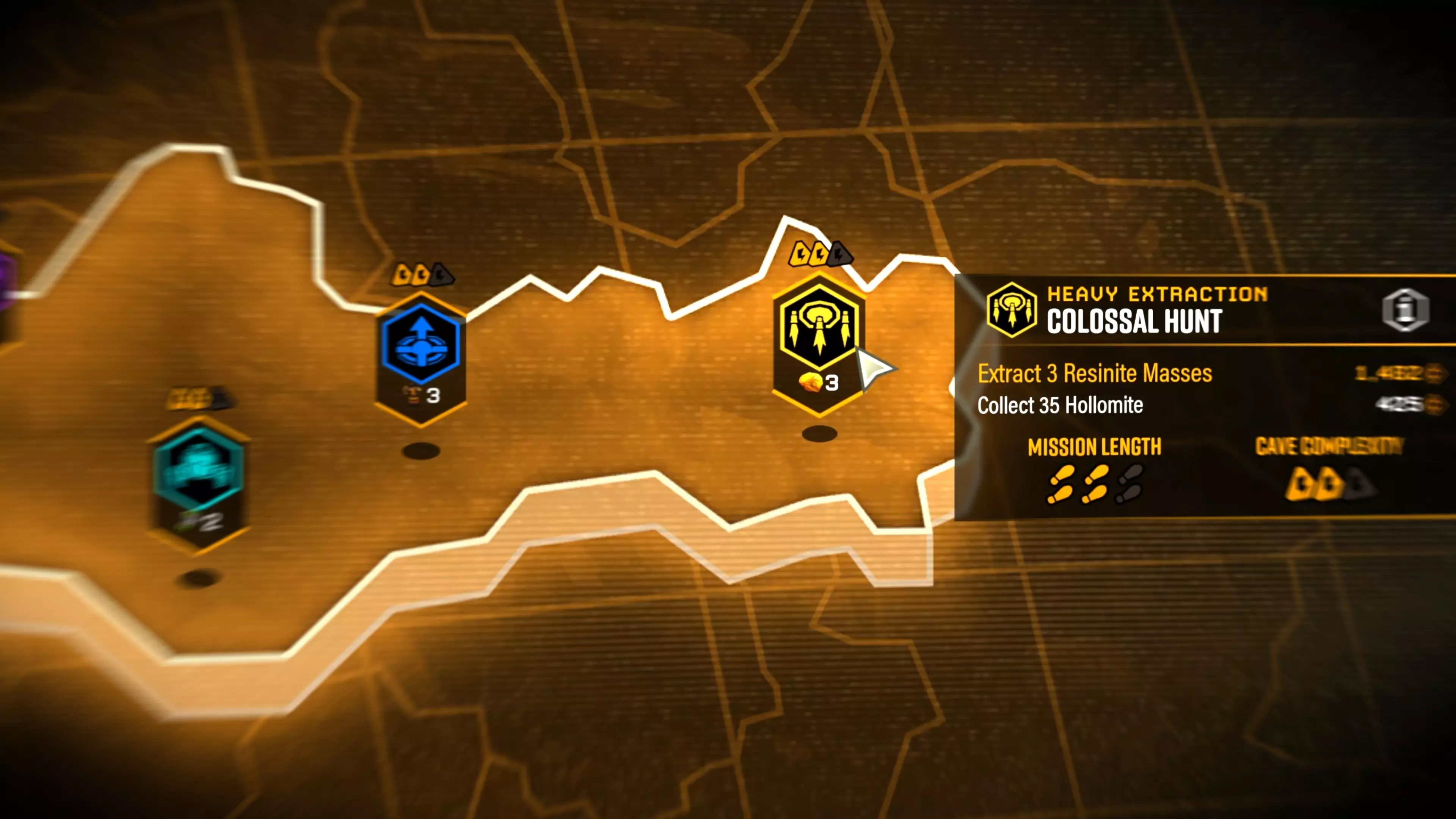 《深岩银河》新深潜次要目标:重型提取 上述构造震动导致霍克斯星的洞穴中出现了大量的树脂矿团。现在,你在深潜行动的任何生物群系中都可能遇到它们。遇到这种情况,你知道该怎么做:找到树脂矿团,将其挖掘出来,然后使用提供的升降火箭将其提取。之后继续执行你的主要目标。 新任务警告 ① **蟹蛛巢穴**:成群的蟹蛛已在霍克斯星各地的洞穴中定居。预计会有源源不断的蟹蛛敌人涌入,尽量避开它们的巢穴。 ② **颚口虫群落**:有报告称,在 ossuary 深渊内外都发现了迁徙的颚口虫群体。在任何激活此警告的任务中,都要小心脚下。