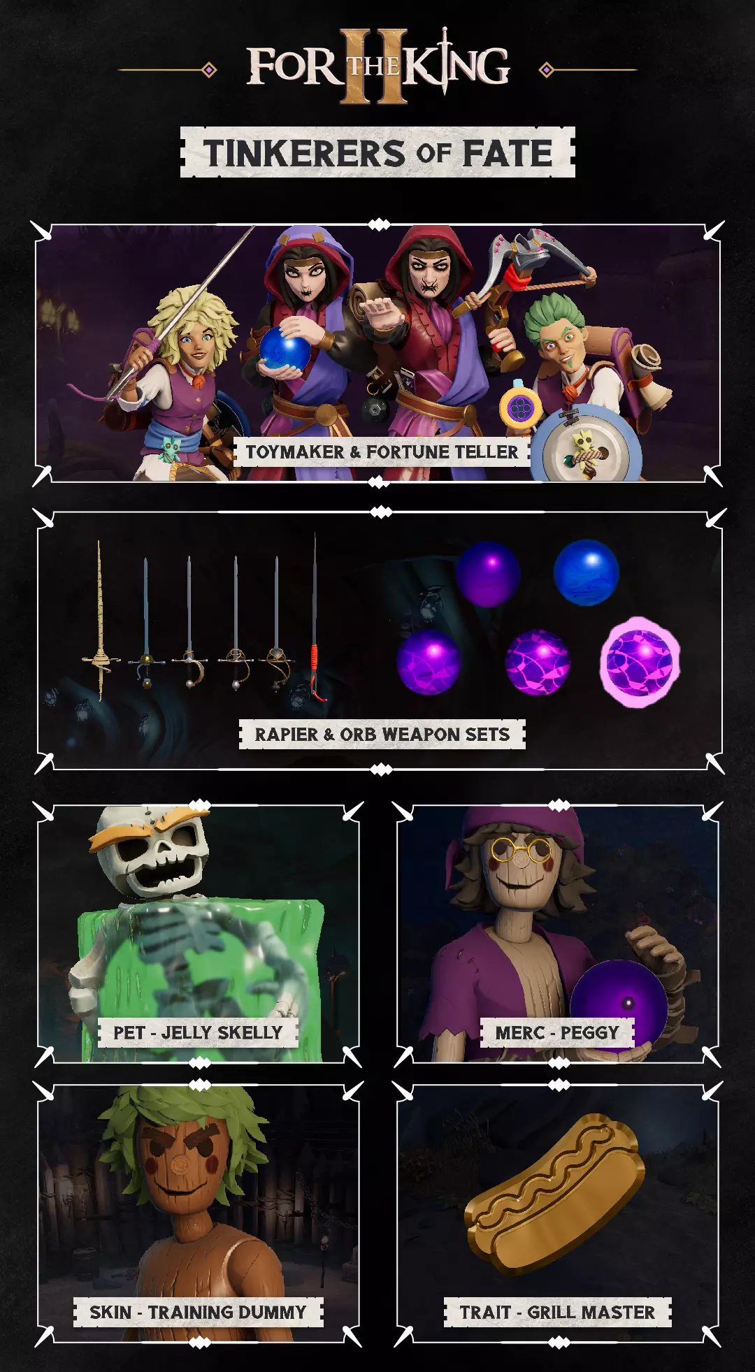 冒险者们! 我们激动地宣布最新内容的上线日期,其中包括全新免费冒险“混沌之子”以及免费回归可玩角色“武僧”。 此外,我们还将推出付费角色包“命运的工匠”。该包包含“玩具制造者”与“命运占卜师”两个角色,以及众多如下所示的精彩内容! 你可以在9月的开发者日志中了解更多关于所有新职业的信息!